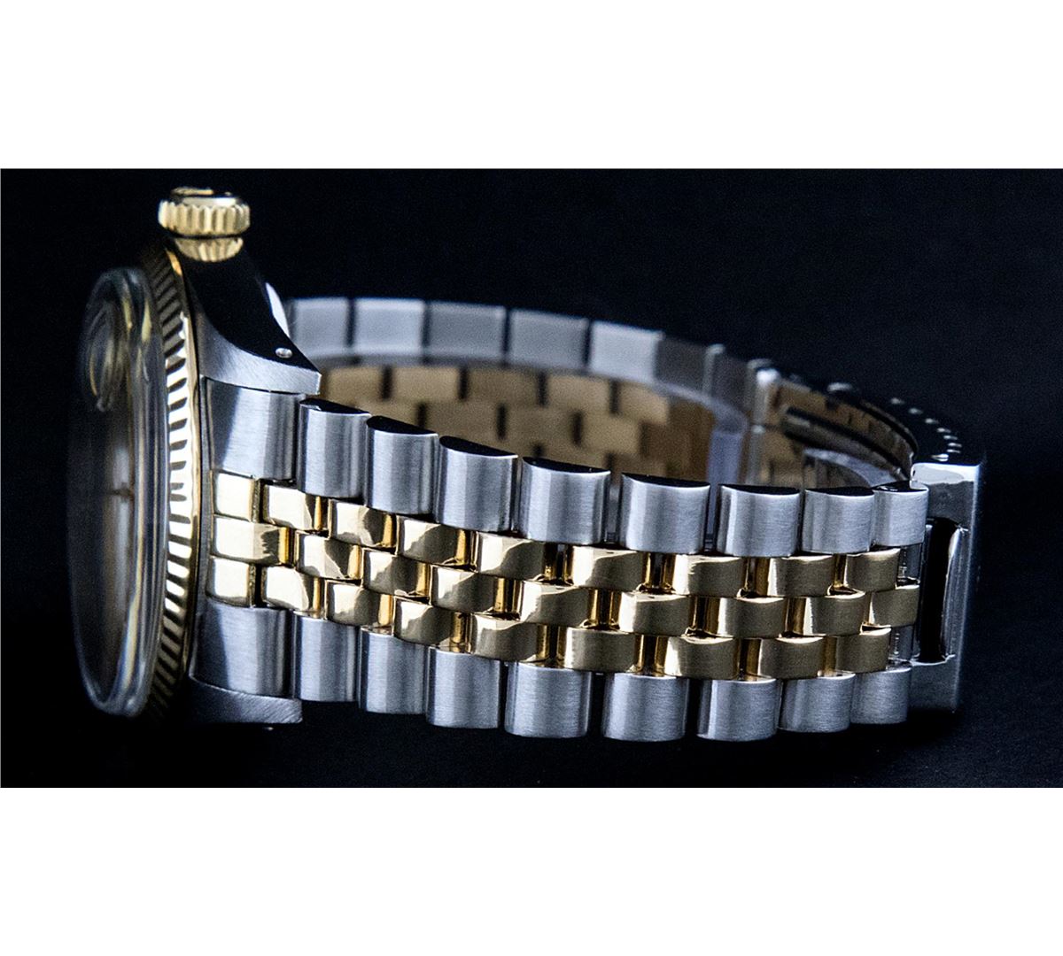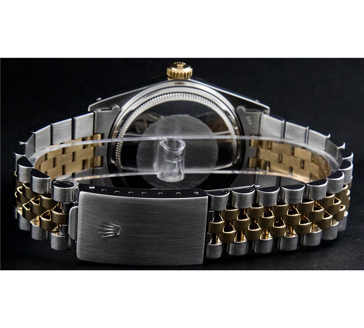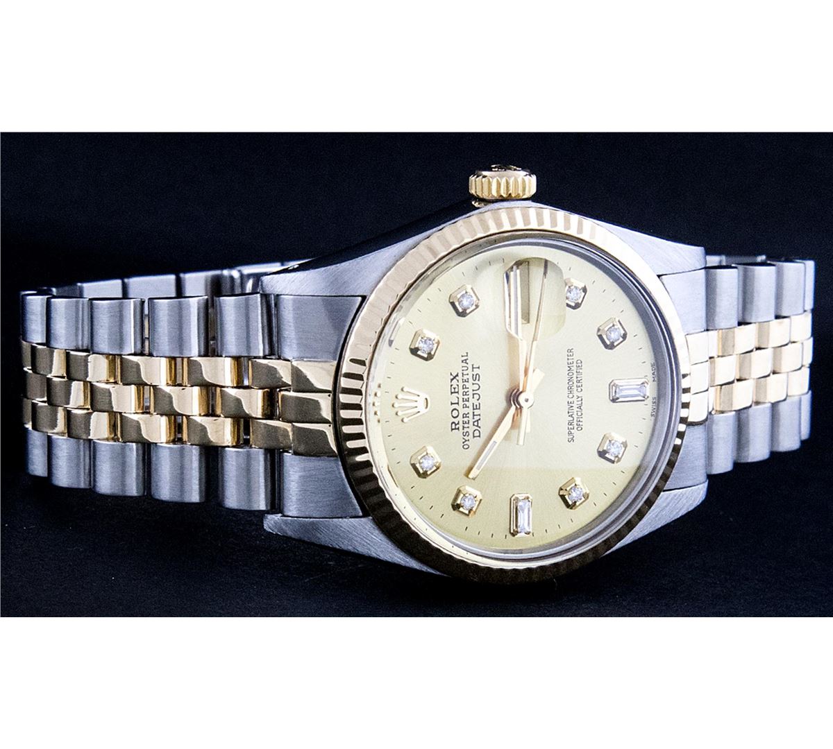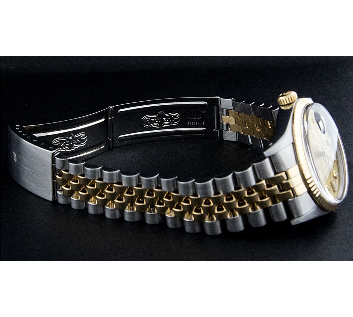 One Mens Two Tone Rolex Datejust Polished, Serviced & Electronically Tested, 14K Yellow Gold & Stainless Steel Case:36mm, 14K Yellow Gold Crown, Bezel:14K Yellow Gold Fluted Bezel. Custom Crystal: Acrylic Cyclops Lens. Movement: Automatic Winding Movement Caliber 3035. Custom Dial: Champagne Diamond 8 + 2, Dial Count: 8 Diamonds + 2 Baguette, Color: G To H, Clarity: VS2-SI1. Date Window: 3 O'Clock Position Date Display, Quickset, Model: 16013 Condition: G-6 Extra Fine. Bracelet: Two Tone 14K Yellow Gold & Stainless Steel Jubilee. Bright Polish. 7.0 Inch Length, Adjustable. Standard Clasp, With Rolex Logo. Comes with 6 month warranty.