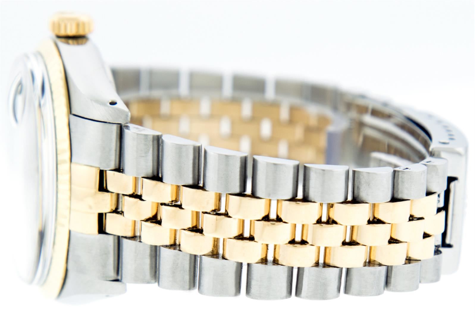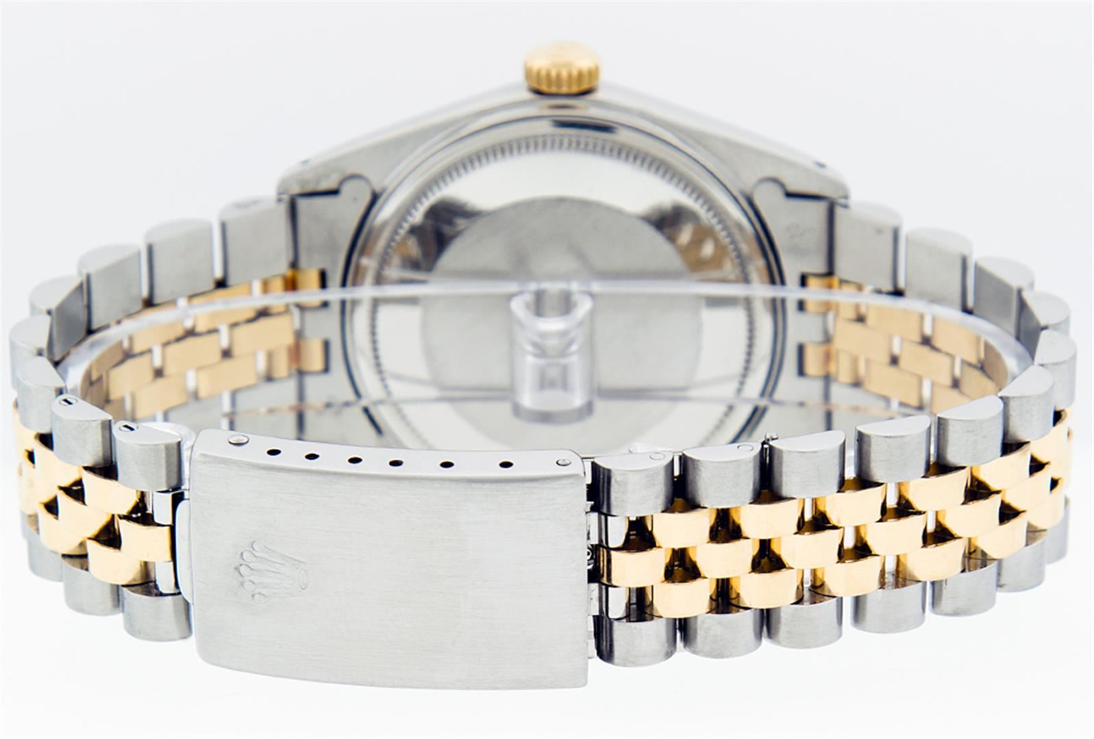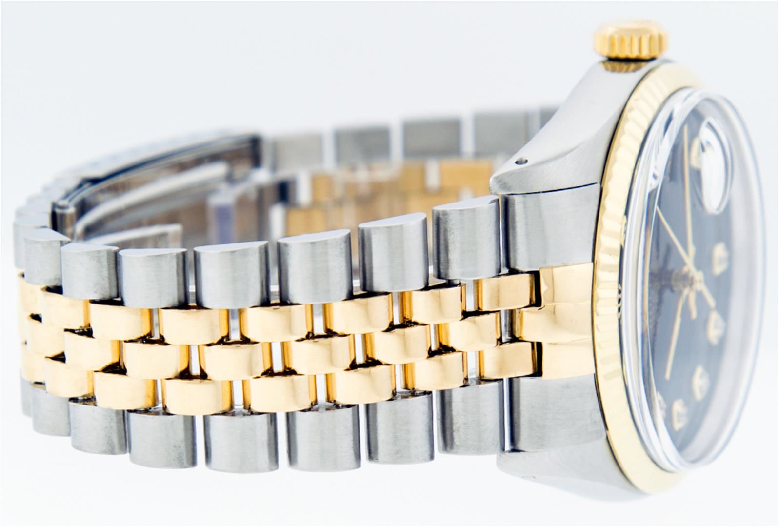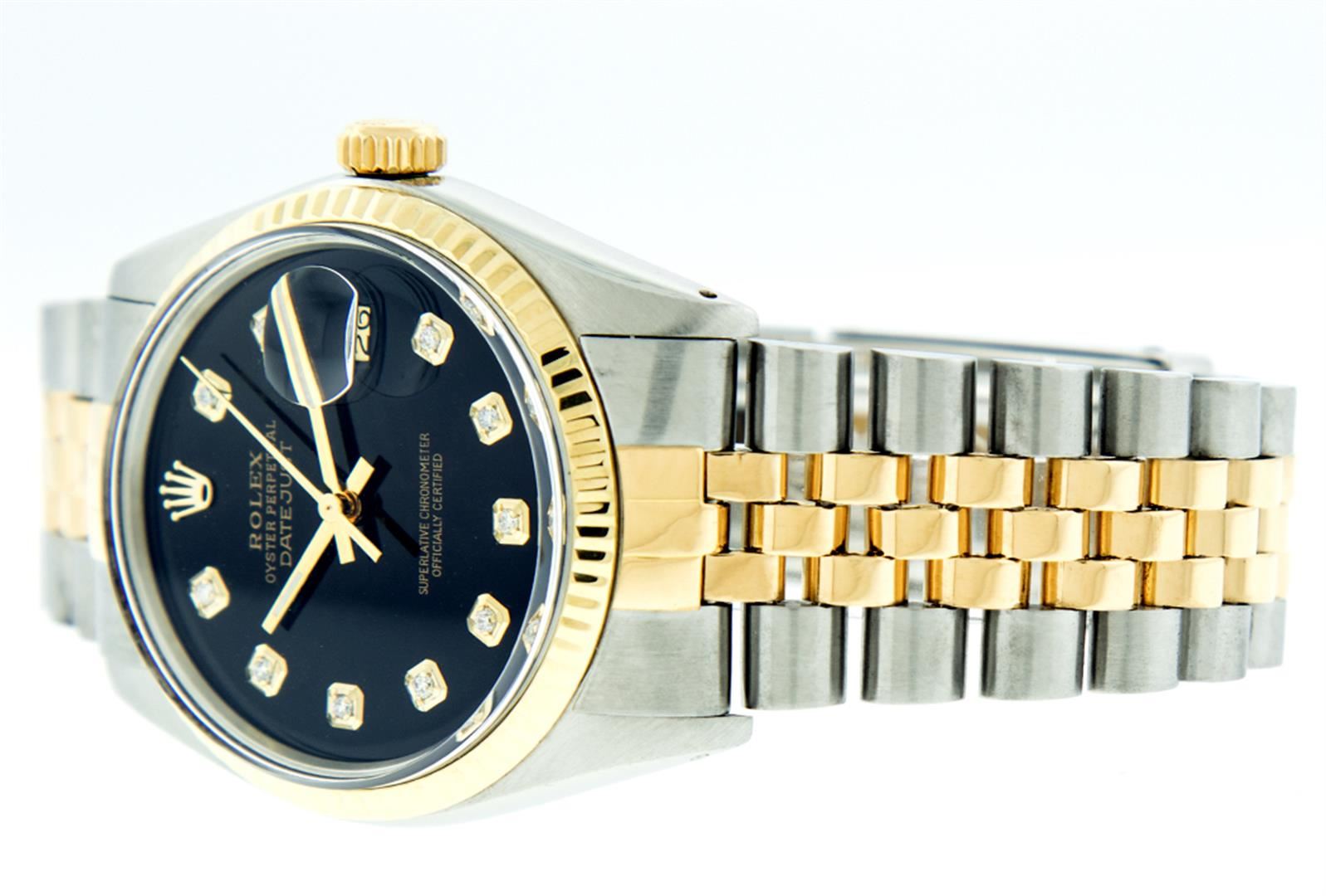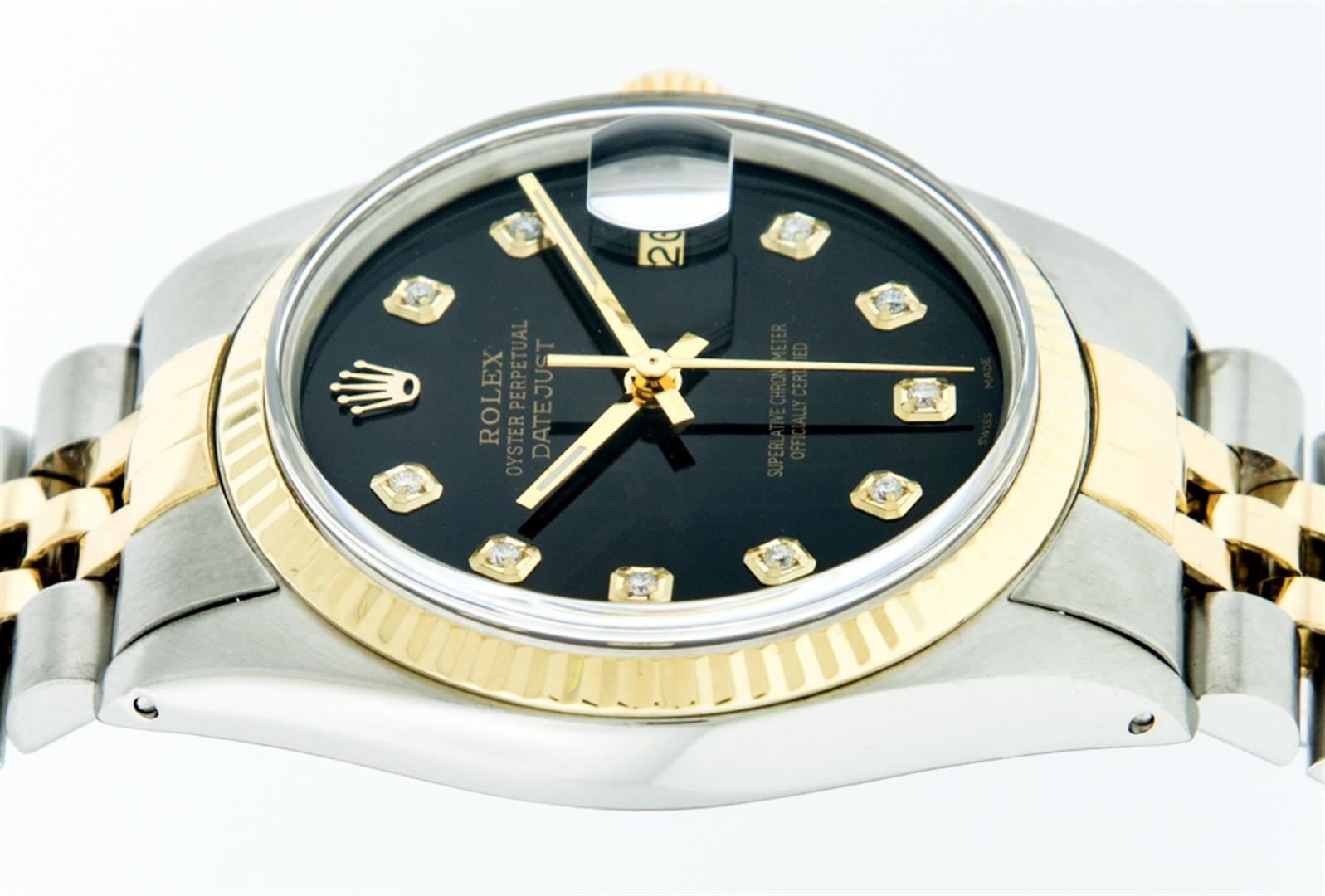 One Gents Two Tone Rolex Datejust Polished, Serviced & Electronically Tested, 14K Yellow Gold & Stainless Steel Case:36mm, 14K Yellow Gold Crown, Bezel: 14K Yellow Gold Fluted Bezel. Custom Crystal: Acrylic Cyclops Lens. Movement: Automatic Winding Movement Caliber 3035. Custom Dial: Black Diamond Dial, Diamond Count: 10 Diamonds In Dial, Color: G to H, Clarity: SI-VS. Date Window: 3 O'clock Position Date Display, Quickset, Model: 16013 Condition: G-6 Extra Fine. Bracelet: Two Tone 14K Yellow Gold & Stainless Steel Jubilee. Bright Polish. 6.5 Inch Length, Adjustable. Standard Clasp, With Rolex Logo.