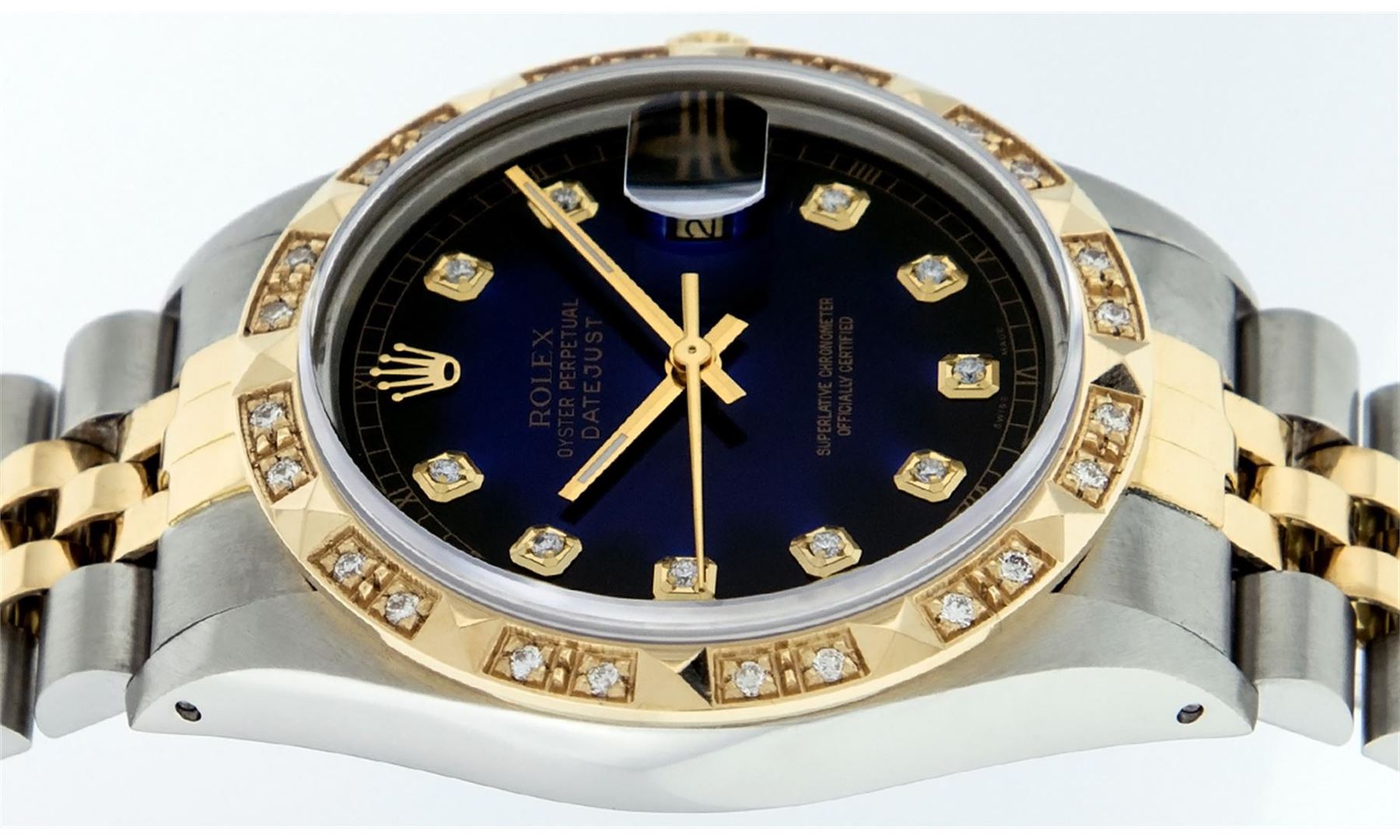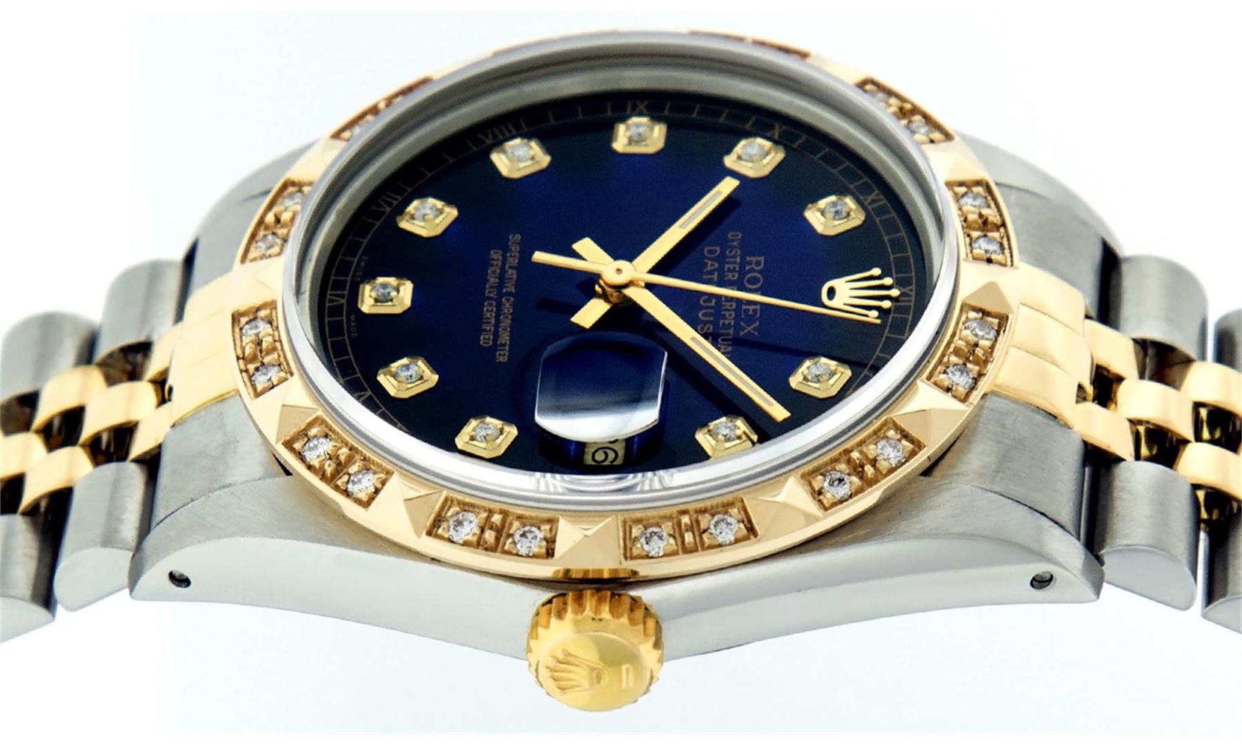 One Mens Two Tone Rolex Datejust Polished, Fully Serviced & Electronically Tested, 14K Yellow Gold & Stainless Steel Case:36mm, 14K Yellow Gold Crown, Custom Bezel: 18K Yellow Gold Pyramid Diamond Bezel, Diamond Count: 24 Diamonds, Total Weight .75 Carat, Clarity: Si-VS, Color: G to H. Custom Crystal: Synthetic Sapphire Cyclops Lens. Movement: Automatic Winding Movement Caliber 3035. Custom Dial: Blue Vignette Diamond Dial, Diamond Count: 10 Diamonds In Dial, Color: G to H, Clarity: SI -VS. Date Window: 3 O'Clock Position Date Display, Quickset, Model: 16013 Datejust. Condition: G-6 Extra Fine. Bracelet: Two Tone 14K Yellow Gold & Stainless Steel Jubilee. Bright Polish. 7.0 Inch Length, Adjustable. Standard Clasp, With Rolex Logo.