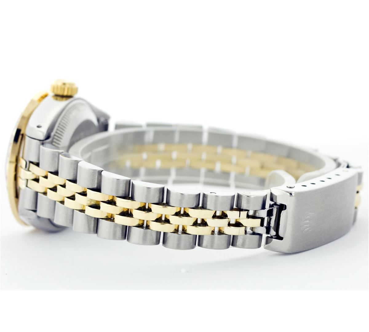 One Ladies Two Tone Rolex Datejust Polished, Serviced & Electronically Tested, 14K Yellow Gold & Stainless Steel Case:26mm, 14K Yellow Gold Crown, Custom Bezel: 18K Yellow Gold Pyramid Diamond Bezel, Diamond Count: 24 Diamonds Total Weight .70 Carat, Clarity: Si-VS, Color: G to H. Custom Crystal: Synthetic Sapphire Cyclops Lens. Movement: Automatic Winding Movement Caliber 2030. Custom Dial: Pink Mother Of Pearl Baguette Diamond Hour Markers. 10 Baguette Diamonds In Dial, Clarity: Si-VS, Color: G to H. Date Window: 3 O'Clock Position Date Display, Non Quickset, Model: 6917 Condition: G-6 Extra Fine. Bracelet: Two Tone 14K Yellow Gold & Stainless Steel Jubilee. Bright Polish. 5.5 Inch Length, Adjustable. Standard Clasp, With Rolex Logo.