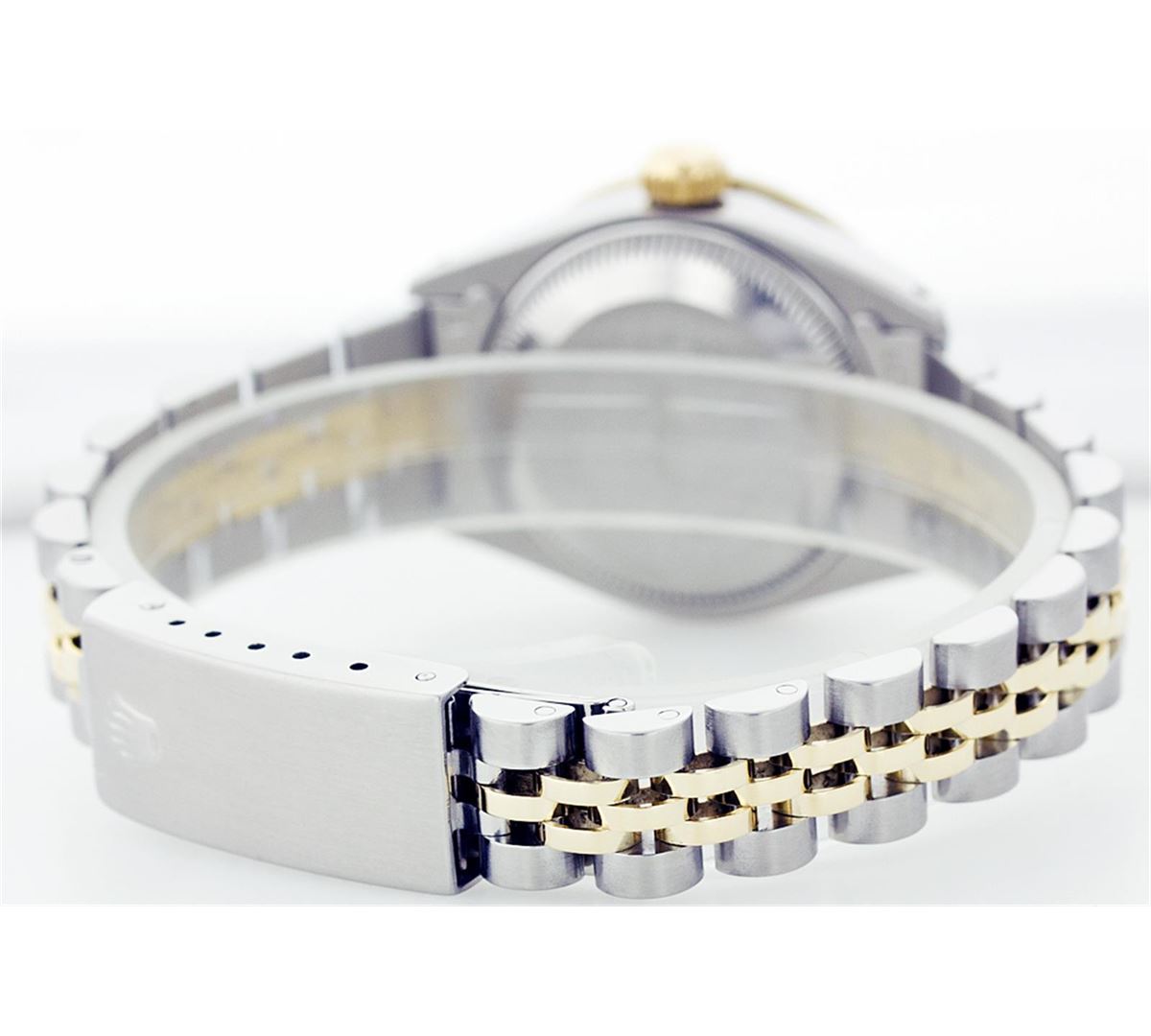 One Ladies Two Tone Rolex Datejust Polished, Serviced & Electronically Tested, 14K Yellow Gold & Stainless Steel Case:26mm, 14K Yellow Gold Crown, Custom Bezel: 18K Yellow Gold Pyramid Diamond Bezel, Diamond Count: 24 Diamonds Total Weight .70 Carat, Clarity: Si-VS, Color: G to H. Custom Crystal: Synthetic Sapphire Cyclops Lens. Movement: Automatic Winding Movement Caliber 2030. Custom Dial: Pink Mother Of Pearl Baguette Diamond Hour Markers. 10 Baguette Diamonds In Dial, Clarity: Si-VS, Color: G to H. Date Window: 3 O'Clock Position Date Display, Non Quickset, Model: 6917 Condition: G-6 Extra Fine. Bracelet: Two Tone 14K Yellow Gold & Stainless Steel Jubilee. Bright Polish. 5.5 Inch Length, Adjustable. Standard Clasp, With Rolex Logo.
