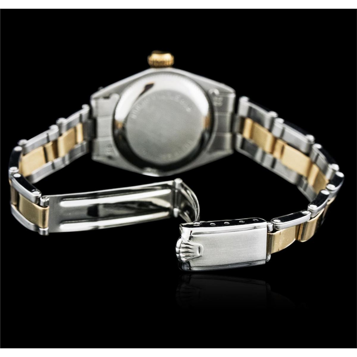 One ladies, Rolex Oyster Perpetual Model wristwatch electronically tested, Stainless Steel Case: 25mm oyster, 14KT yellow gold Crown: twinlock with logo, Custom Bezel: diamond set, Crystal: acrylic lens. Movement: mechanical stem wind, Custom Dial: Silvered, with baton hands, indices, and diamond markers. Circa: 1977, Condition: G-4 Average. Bracelet: stainless steel and 14KT yellow gold oyster. Six inch length, adjustable. Standard clasp, with logo. Containing: Forty round brilliant cut diamonds, measuring an average of 1.55mm in diameter, approximate. Total Weight of 40 Stones = 0.50ct. Set & graded in the bezel. Clarity: SI-1 to I-1. Color: G - I. Total Weight of Diamonds 0.50ct. Total Weight of Watch 38.46 grams. AIG Appraised at $5,650.00.