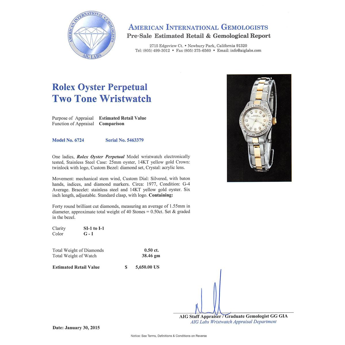 One ladies, Rolex Oyster Perpetual Model wristwatch electronically tested, Stainless Steel Case: 25mm oyster, 14KT yellow gold Crown: twinlock with logo, Custom Bezel: diamond set, Crystal: acrylic lens. Movement: mechanical stem wind, Custom Dial: Silvered, with baton hands, indices, and diamond markers. Circa: 1977, Condition: G-4 Average. Bracelet: stainless steel and 14KT yellow gold oyster. Six inch length, adjustable. Standard clasp, with logo. Containing: Forty round brilliant cut diamonds, measuring an average of 1.55mm in diameter, approximate. Total Weight of 40 Stones = 0.50ct. Set & graded in the bezel. Clarity: SI-1 to I-1. Color: G - I. Total Weight of Diamonds 0.50ct. Total Weight of Watch 38.46 grams. AIG Appraised at $5,650.00.