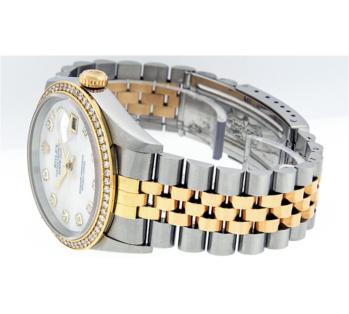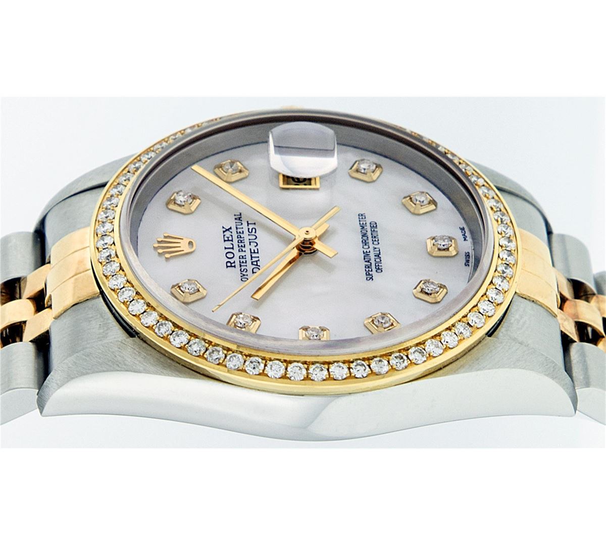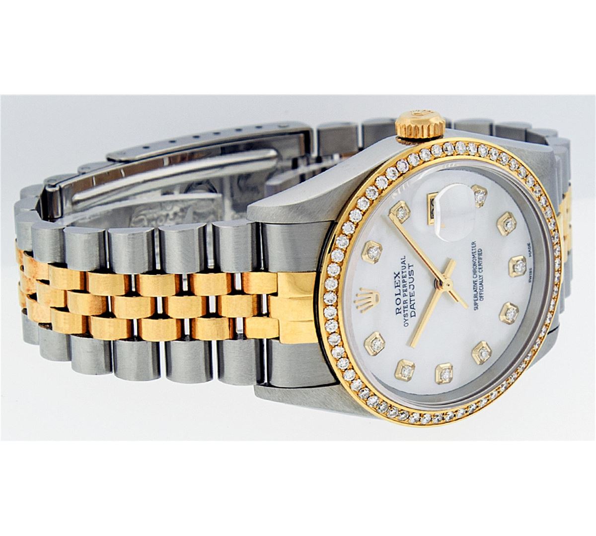One Gents 18K Yellow Gold Two Tone Rolex Datejust Polished, Serviced & Electronically Tested, 18K Yellow Gold & Stainless Steel Case:36mm. Custom Bezel: 18K Yellow Gold Beadset Diamond Bezel, Diamond Count: 44 Diamonds. Total Weight 1.00 Carat, Clarity: Si-VS, Color: G to H. Custom Crystal: Synthetic Sapphire Cyclops Lens. Movement: Automatic Winding Movement Caliber 3135. Custom Dial: Mother Of Pearl Diamond Dial, Diamond Count: 10 Diamonds In Dial, Color: G To H, Clarity: SI-VS, Date Window: 3 O'Clock Position Date Display, Quickset, Model: 16233 Condition: G-6 Extra Fine The Watch Is In Very Good Condition Free Of All Scratches And Dents. Bracelet: Two Tone 18K Yellow Gold & Stainless Steel Jubilee Band. Bright Polish. 7.0 Inch Length, Adjustable. Standard Clasp, With Rolex Logo. Comes with 6 month warranty.