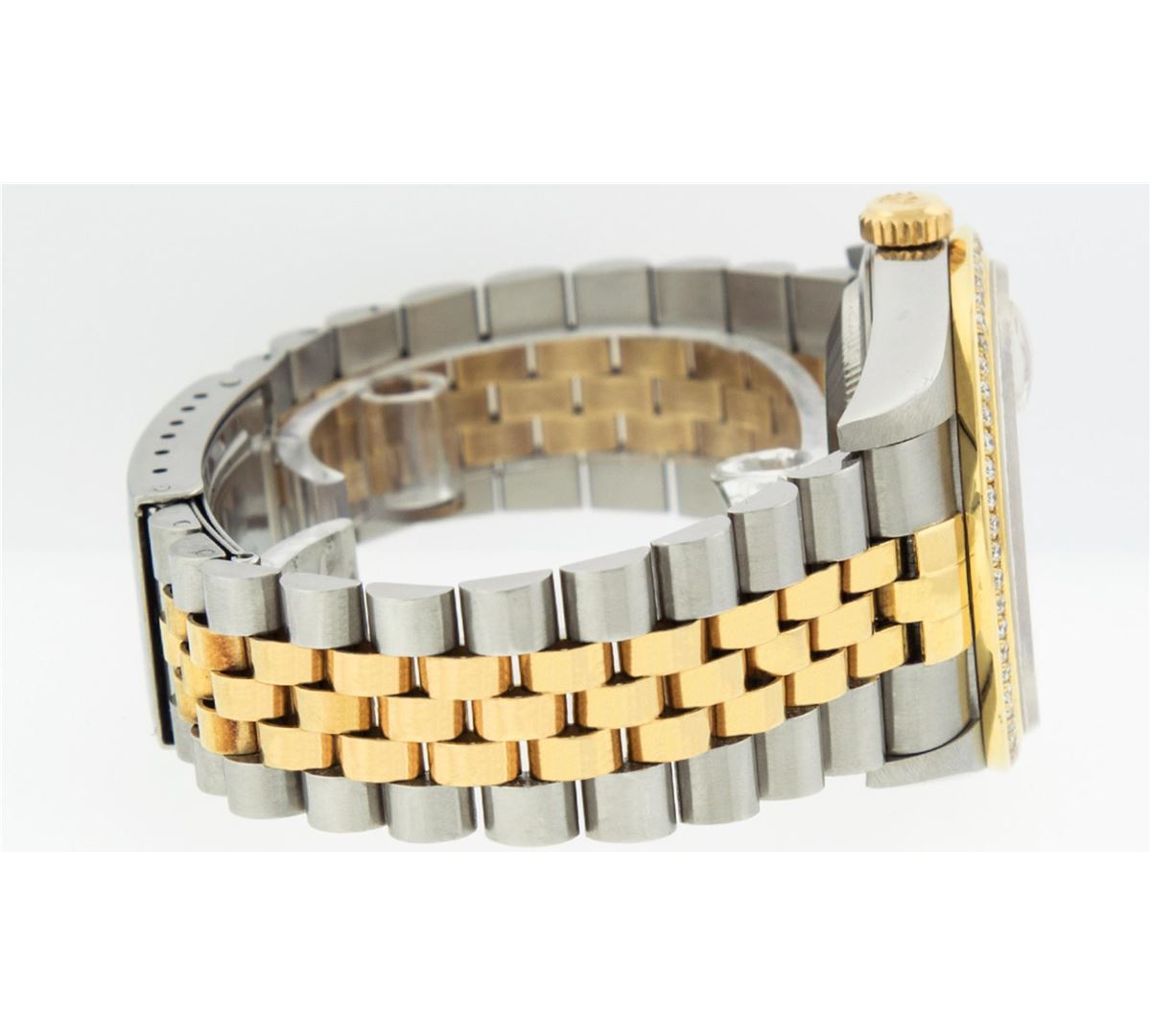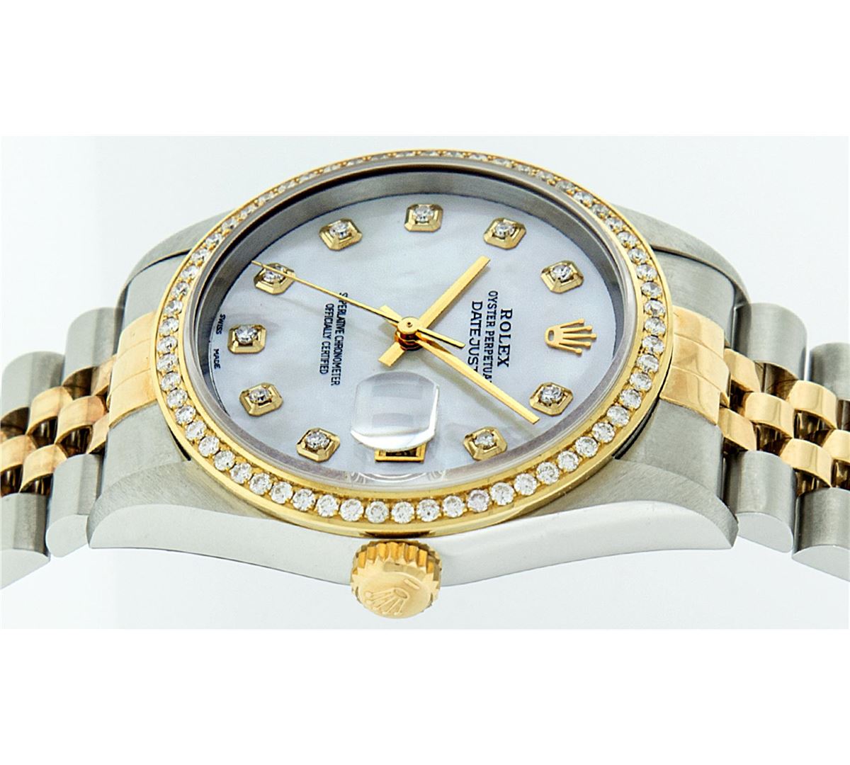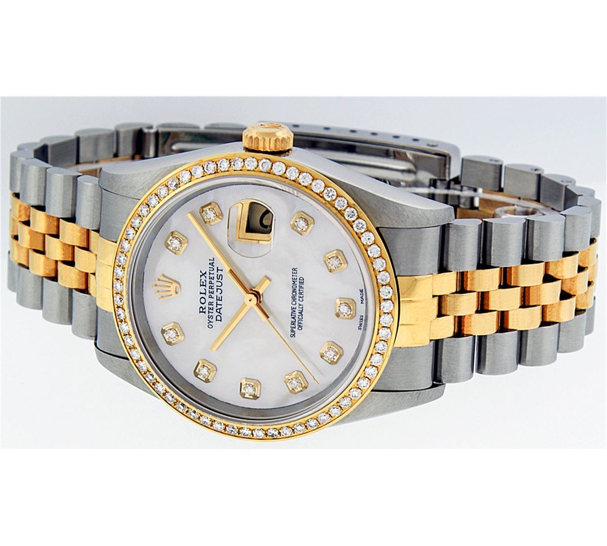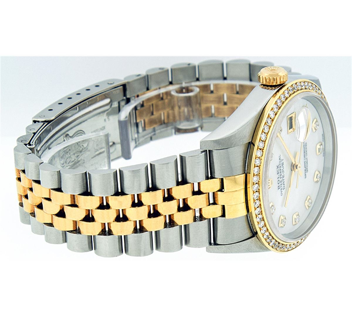 One Gents 18K Yellow Gold Two Tone Rolex Datejust Polished, Serviced & Electronically Tested, 18K Yellow Gold & Stainless Steel Case:36mm. Custom Bezel: 18K Yellow Gold Beadset Diamond Bezel, Diamond Count: 44 Diamonds. Total Weight 1.00 Carat, Clarity: Si-VS, Color: G to H. Custom Crystal: Synthetic Sapphire Cyclops Lens. Movement: Automatic Winding Movement Caliber 3135. Custom Dial: Mother Of Pearl Diamond Dial, Diamond Count: 10 Diamonds In Dial, Color: G To H, Clarity: SI-VS, Date Window: 3 O'Clock Position Date Display, Quickset, Model: 16233 Condition: G-6 Extra Fine The Watch Is In Very Good Condition Free Of All Scratches And Dents. Bracelet: Two Tone 18K Yellow Gold & Stainless Steel Jubilee Band. Bright Polish. 7.0 Inch Length, Adjustable. Standard Clasp, With Rolex Logo. Comes with 6 month warranty.