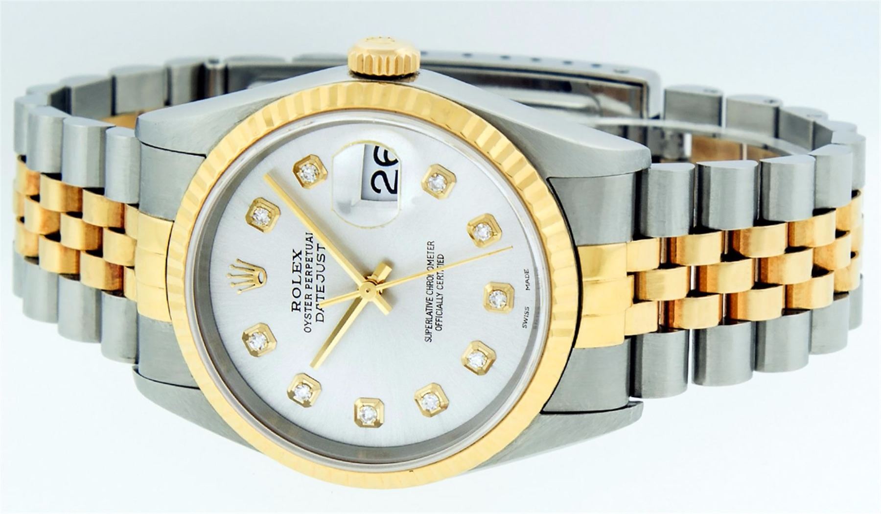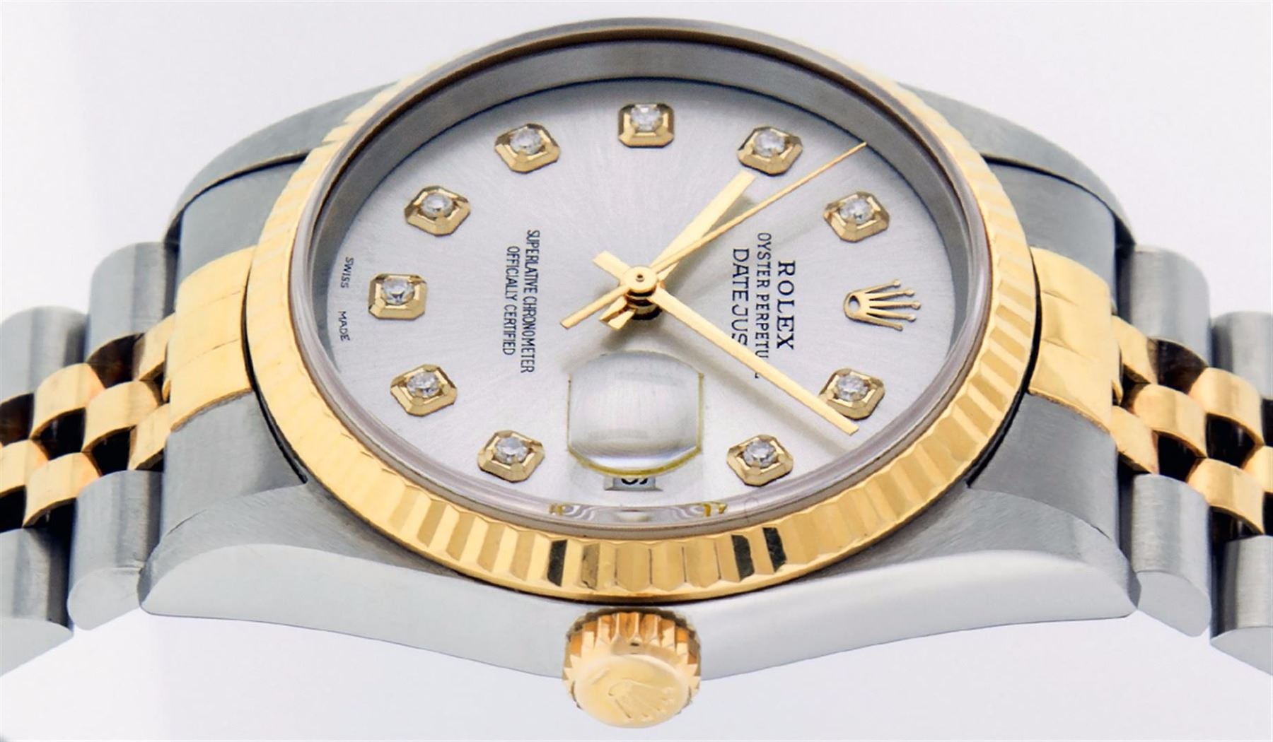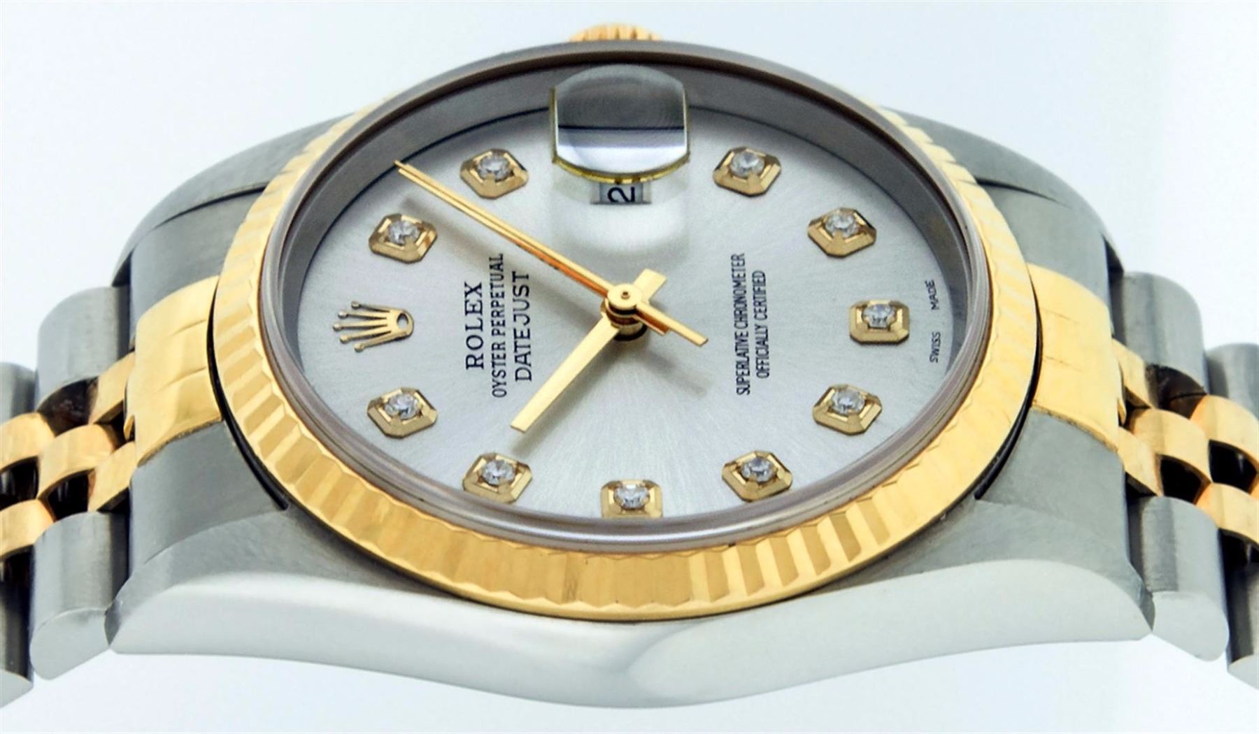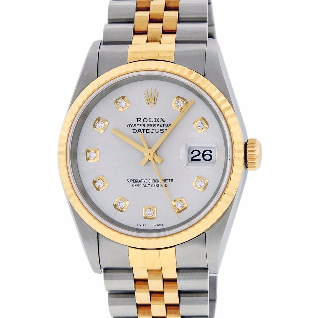 One Gents 18K Yellow Gold Two Tone Rolex Datejust Polished, Serviced & Electronically Tested, 18K Yellow Gold & Stainless Steel Case:36mm. Bezel: 18K Yellow Gold Fluted Bezel. Custom Crystal: Synthetic Sapphire Cyclops Lens. Movement: Automatic Winding Movement Caliber 3135. Custom Dial: Silver Diamond Dial, Diamond Count: 10 Diamonds In Dial, Color: G To H, Clarity: SI-VS, Date Window: 3 O'Clock Position Date Display, Quickset, Model: 16233 Condition: G-6 Extra Fine The Watch Is In Very Good Condition Free Of All Scratches And Dents. Bracelet: Two Tone 18K Yellow Gold & Stainless Steel Jubilee Band. Bright Polish. 7.0 Inch Length, Adjustable. Standard Clasp, With Rolex Logo. Comes with 6 month warranty.