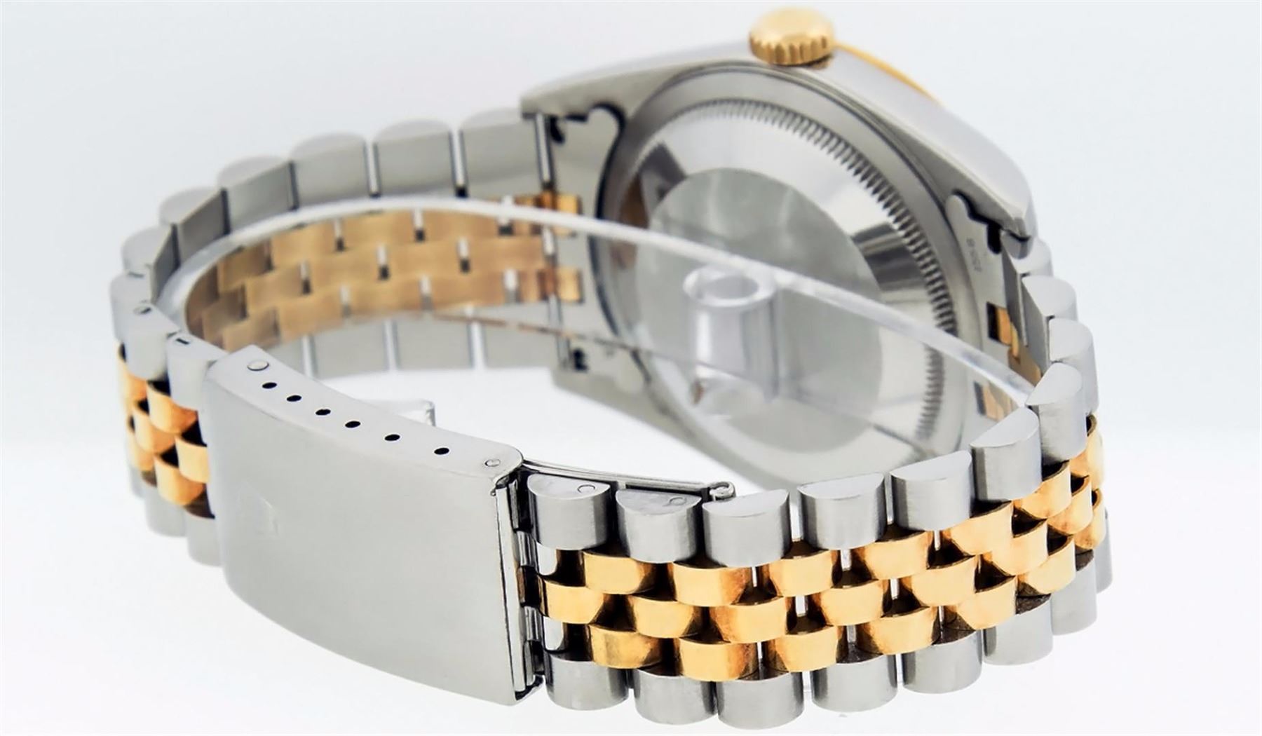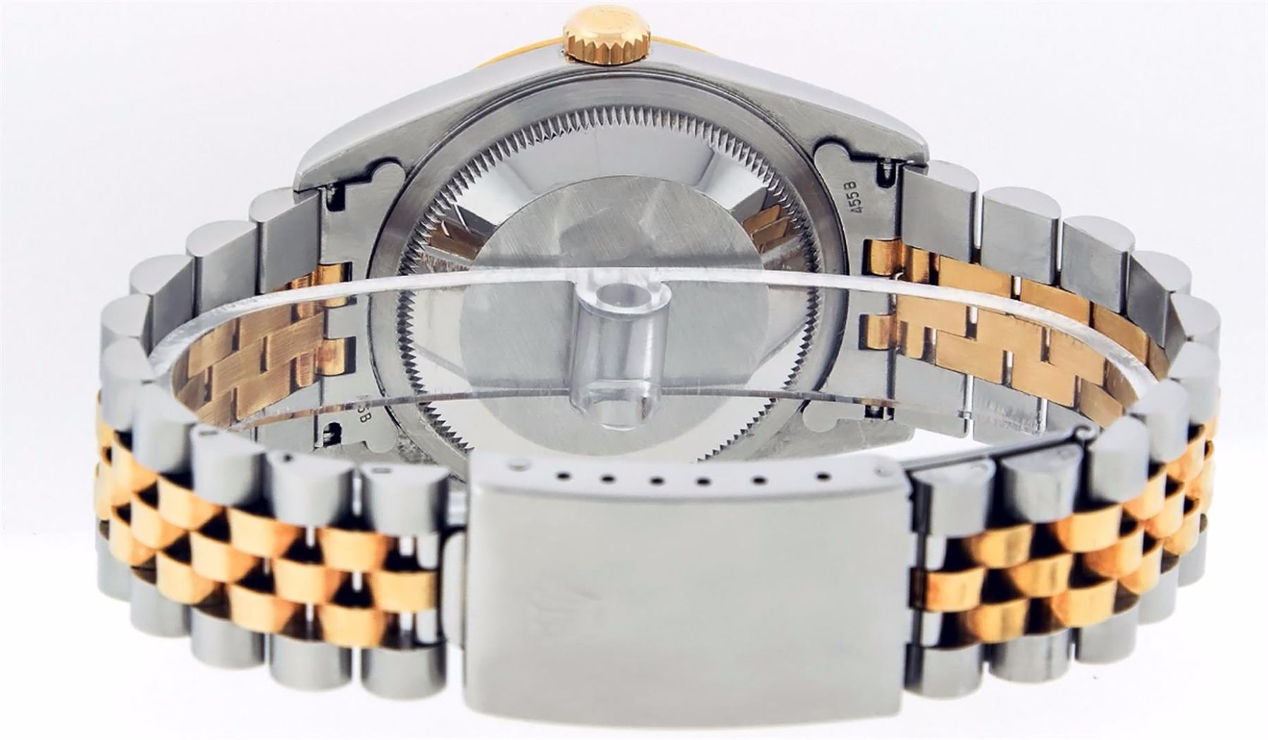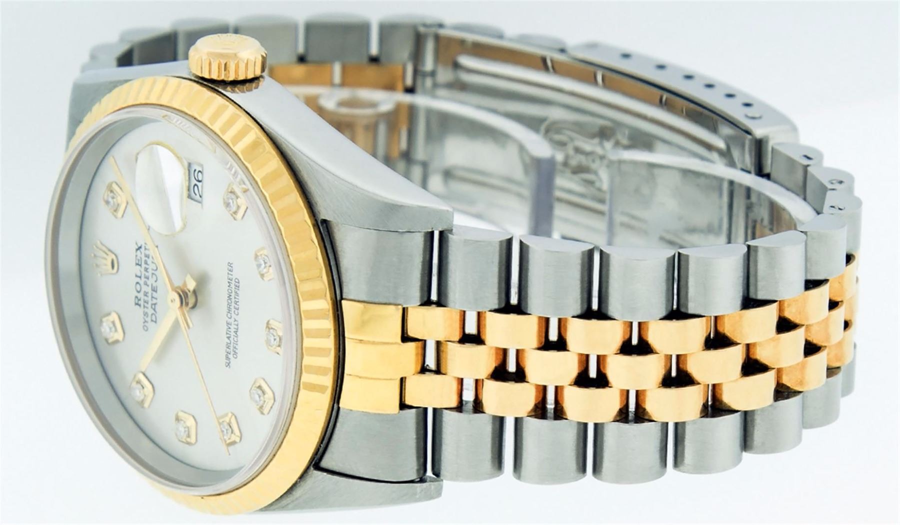 One Gents 18K Yellow Gold Two Tone Rolex Datejust Polished, Serviced & Electronically Tested, 18K Yellow Gold & Stainless Steel Case:36mm. Bezel: 18K Yellow Gold Fluted Bezel. Custom Crystal: Synthetic Sapphire Cyclops Lens. Movement: Automatic Winding Movement Caliber 3135. Custom Dial: Silver Diamond Dial, Diamond Count: 10 Diamonds In Dial, Color: G To H, Clarity: SI-VS, Date Window: 3 O'Clock Position Date Display, Quickset, Model: 16233 Condition: G-6 Extra Fine The Watch Is In Very Good Condition Free Of All Scratches And Dents. Bracelet: Two Tone 18K Yellow Gold & Stainless Steel Jubilee Band. Bright Polish. 7.0 Inch Length, Adjustable. Standard Clasp, With Rolex Logo. Comes with 6 month warranty.