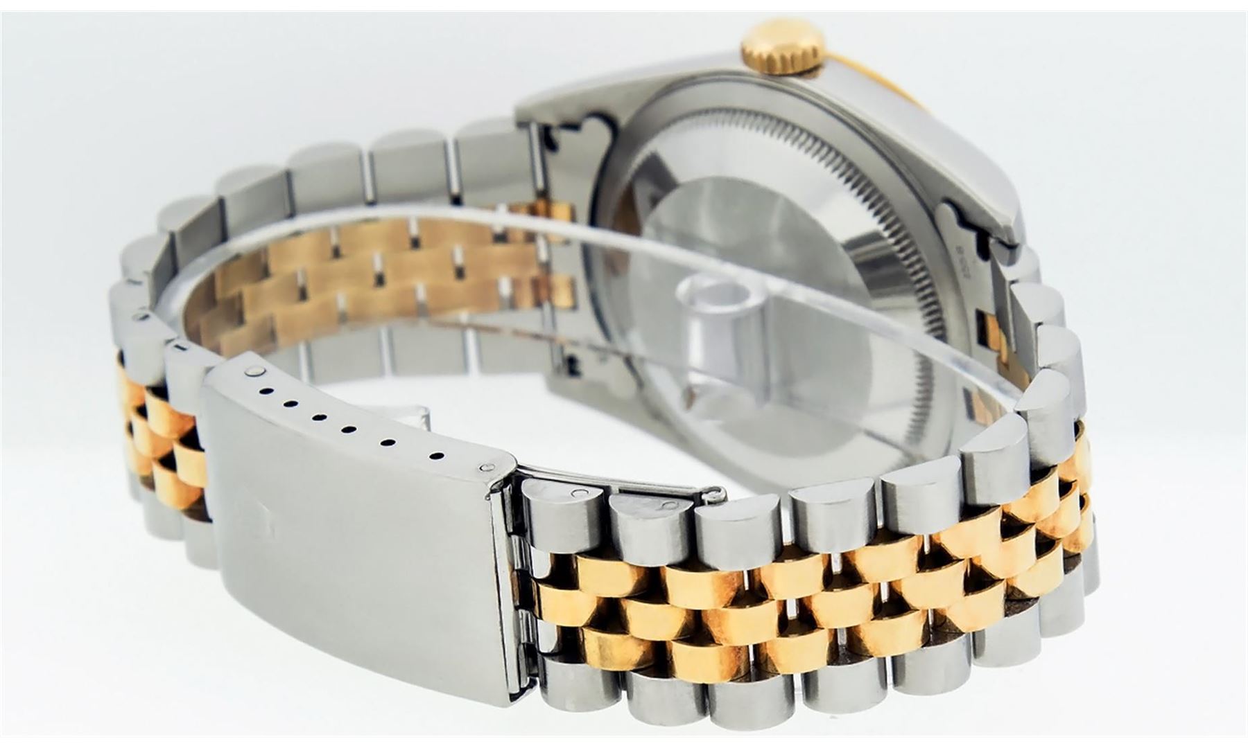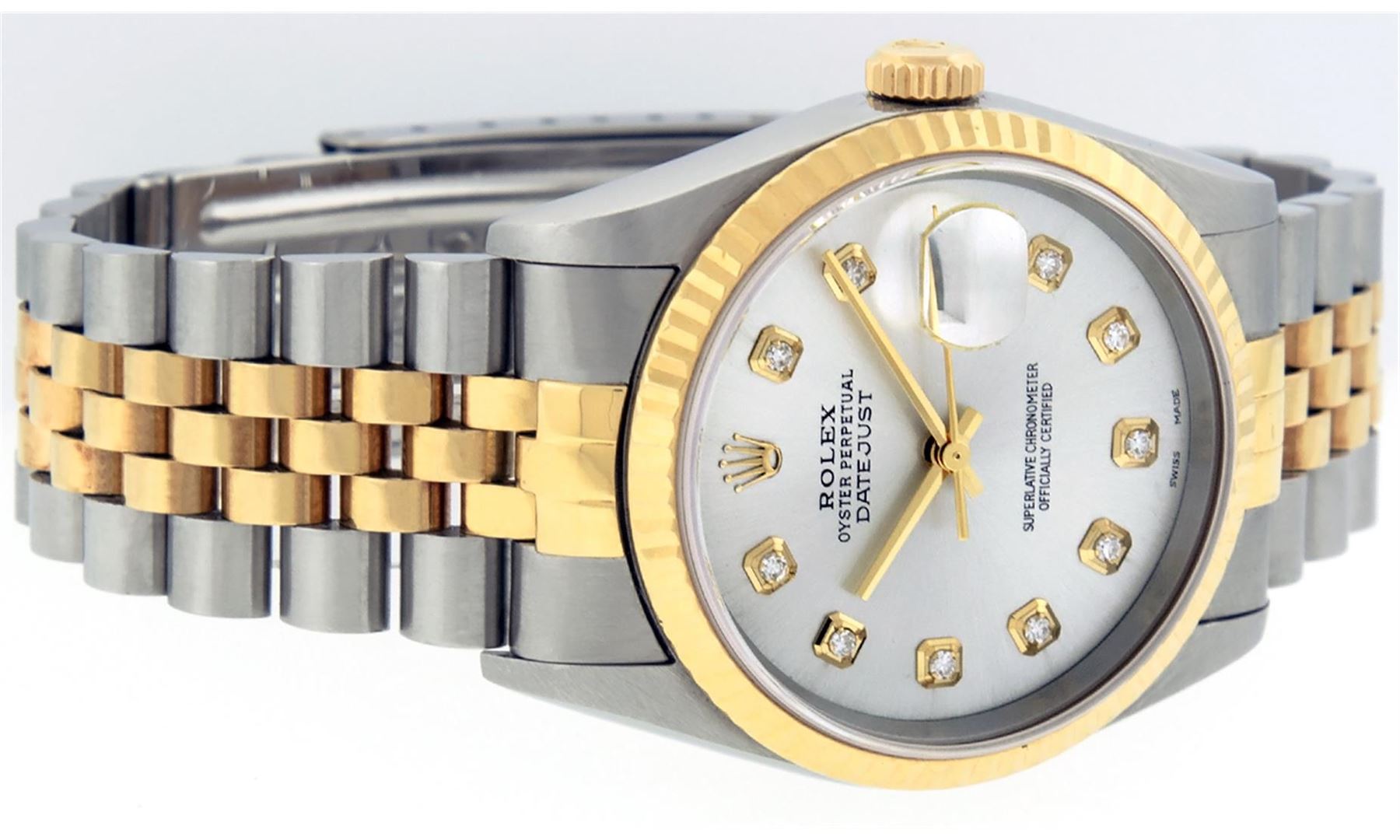 One Gents 18K Yellow Gold Two Tone Rolex Datejust Polished, Serviced & Electronically Tested, 18K Yellow Gold & Stainless Steel Case:36mm. Bezel: 18K Yellow Gold Fluted Bezel. Custom Crystal: Synthetic Sapphire Cyclops Lens. Movement: Automatic Winding Movement Caliber 3135. Custom Dial: Silver Diamond Dial, Diamond Count: 10 Diamonds In Dial, Color: G To H, Clarity: SI-VS, Date Window: 3 O'Clock Position Date Display, Quickset, Model: 16233 Condition: G-6 Extra Fine The Watch Is In Very Good Condition Free Of All Scratches And Dents. Bracelet: Two Tone 18K Yellow Gold & Stainless Steel Jubilee Band. Bright Polish. 7.0 Inch Length, Adjustable. Standard Clasp, With Rolex Logo. Comes with 6 month warranty.