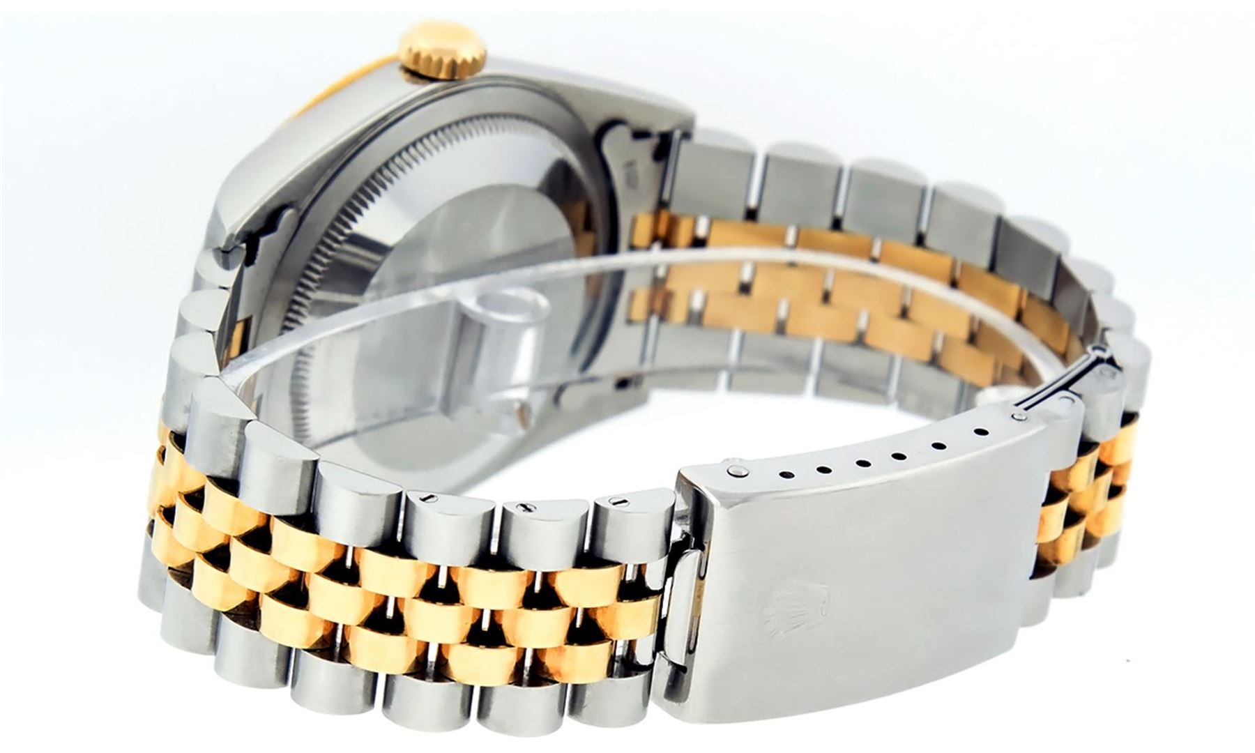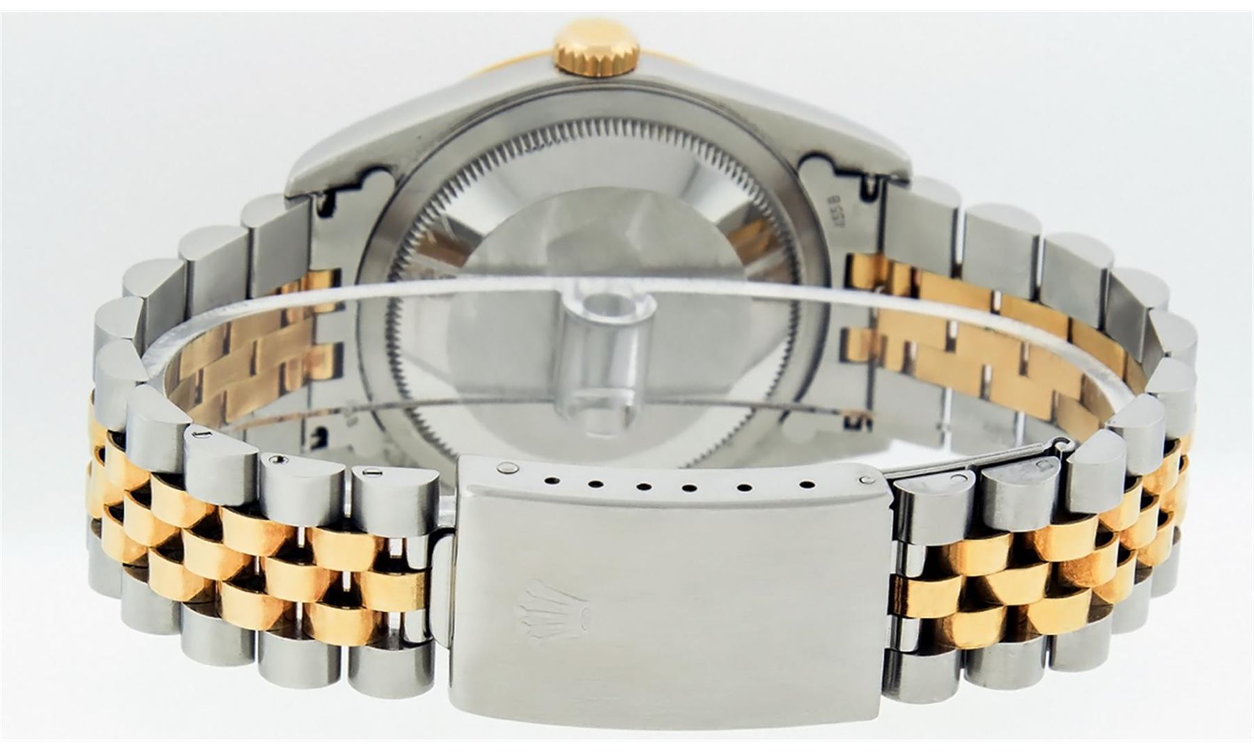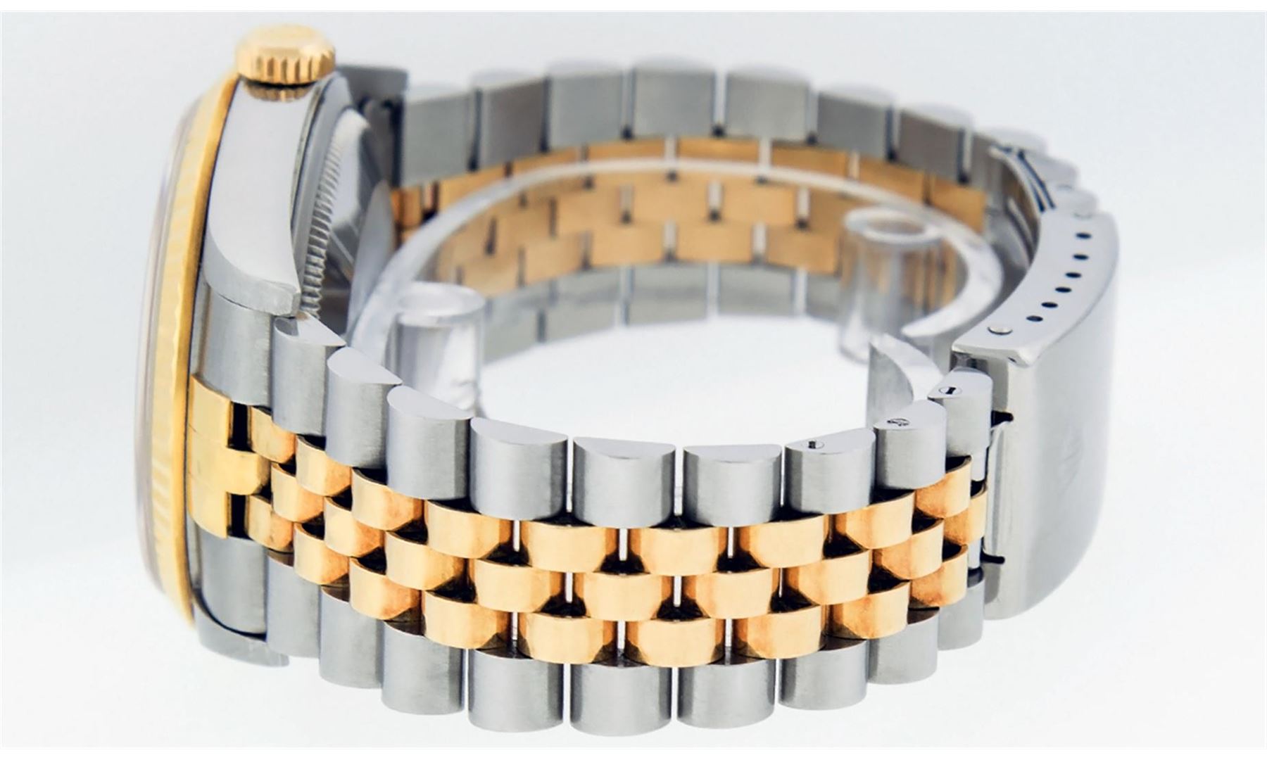 One Gents 18K Yellow Gold Two Tone Rolex Datejust Polished, Serviced & Electronically Tested, 18K Yellow Gold & Stainless Steel Case:36mm. Bezel: 18K Yellow Gold Fluted Bezel. Custom Crystal: Synthetic Sapphire Cyclops Lens. Movement: Automatic Winding Movement Caliber 3135. Custom Dial: Slate Grey Diamond Dial, Diamond Count: 10 Diamonds In Dial, Color: G To H, Clarity: SI-VS, Date Window: 3 O'Clock Position Date Display, Quickset, Model: 16233 Condition: G-6 Extra Fine The Watch Is In Very Good Condition Free Of All Scratches And Dents. Bracelet: Two Tone 18K Yellow Gold & Stainless Steel Jubilee Band. Bright Polish. 7.0 Inch Length, Adjustable. Standard Clasp, With Rolex Logo. Comes with 6 month warranty.