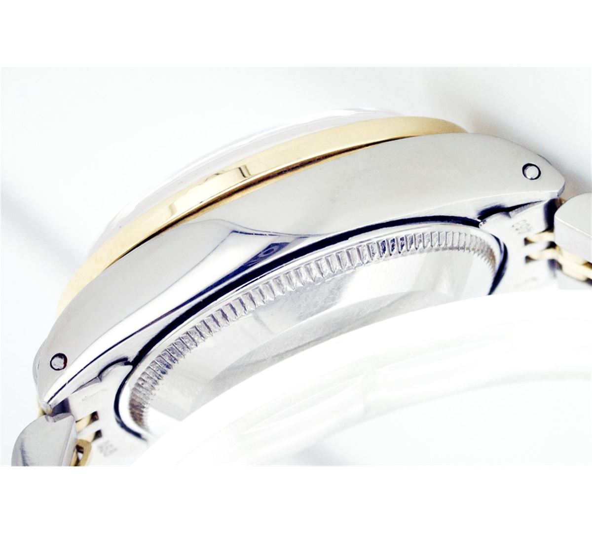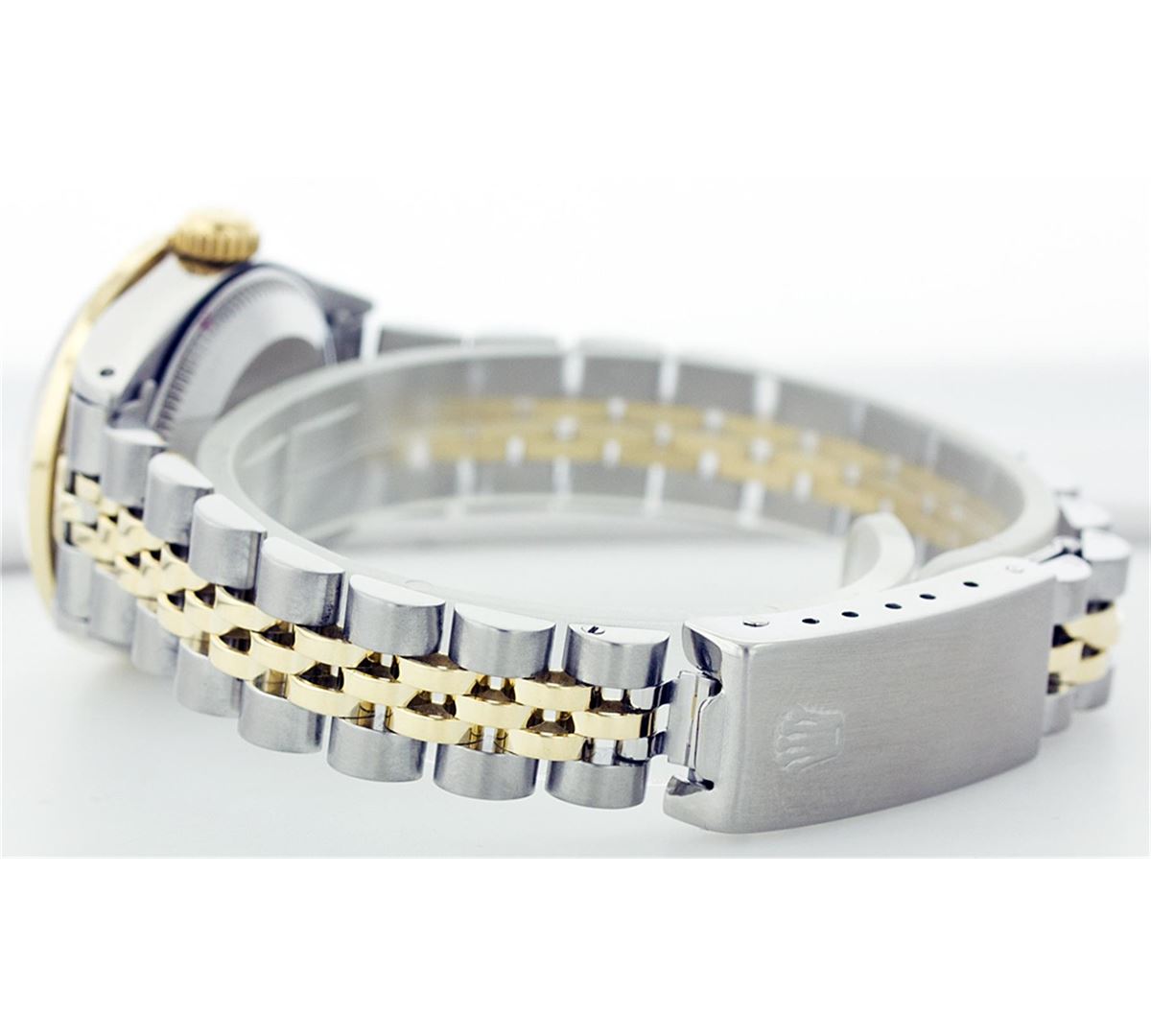 One Ladies Two Tone Rolex Datejust Polished, Serviced & Electronically Tested, 14K Yellow Gold & Stainless Steel Case:26mm, 14K Yellow Gold Crown, Custom Bezel: 18K Yellow Gold Emerald Beadset Diamond Bezel, Diamond Count: 28 Diamonds + 4 Emeralds Total Weight .70 Carat, Clarity: Si-VS, Color: G to H. Custom Crystal: Synthetic Sapphire Cyclops Lens. Movement: Automatic Winding Movement Caliber 2030. Custom Dial: Mother Of Pearl With Green Emerald Hour Markers. 10 Emeralds In Dial, Clarity: Si-VS, Color: G to H. Date Window: 3 O'Clock Position Date Display, Non Quickset, Model: 6917 Condition: G-6 Extra Fine. Bracelet: Two Tone 14K Yellow Gold & Stainless Steel Jubilee. Bright Polish. 5.5 Inch Length, Adjustable. Standard Clasp, With Rolex Logo.