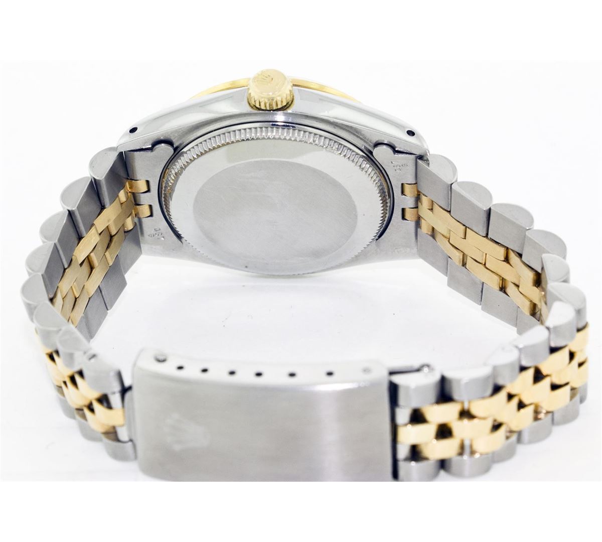 One Ladies Two Tone Rolex Datejust Polished, Serviced & Electronically Tested, 14K Yellow Gold & Stainless Steel Case:26mm, 14K Yellow Gold Crown, Custom Bezel: 14K Yellow Gold Fluted Bezel. Custom Crystal: Synthetic Sapphire Cyclops Lens. Movement: Automatic Winding Movement Caliber 2030. Custom Dial: Mother Of Pearl Emerald String Diamond Dial, Stone Count: 10 Emeralds + 33 Diamonds. Date Window: 3 O'Clock Position Date Display, Non Quickset, Model: 6917 Condition: G-6 Extra Fine. Bracelet: Two Tone 14K Yellow Gold & Stainless Steel Jubilee. Bright Polish. 5.5 Inch Length, Adjustable. Standard Clasp, With Rolex Logo.