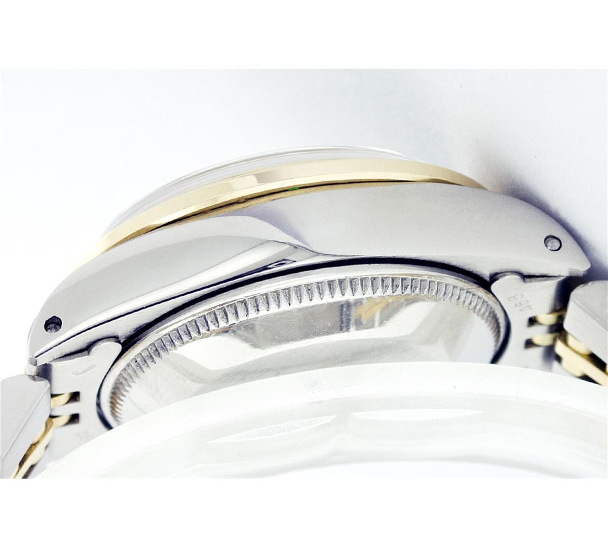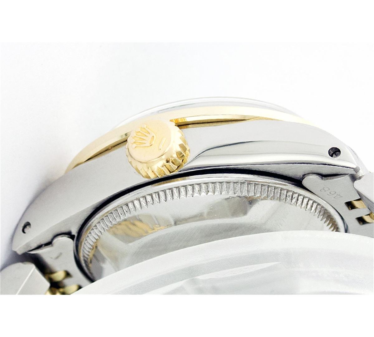 One Ladies Two Tone Rolex Datejust Polished, Serviced & Electronically Tested, 14K Yellow Gold & Stainless Steel Case:26mm, 14K Yellow Gold Crown, Custom Bezel: 18K Yellow Gold Emerald Beadset Diamond Bezel, Diamond Count: 28 Diamonds + 4 Emeralds Total Weight .70 Carat, Clarity: Si-VS, Color: G to H. Custom Crystal: Synthetic Sapphire Cyclops Lens. Movement: Automatic Winding Movement Caliber 2030. Custom Dial: Green Vignette With Diamond Hour Markers. Date Window: 3 O'Clock Position Date Display, Non Quickset, Model: 6917 Condition: G-6 Extra Fine. Bracelet: Two Tone 14K Yellow Gold & Stainless Steel Jubilee. Bright Polish. 5.5 Inch Length, Adjustable. Standard Clasp, With Rolex Logo.