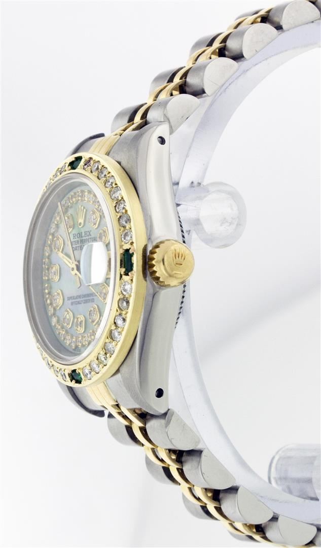 One Ladies Two Tone Rolex Datejust Polished, Serviced & Electronically Tested, 14K Yellow Gold & Stainless Steel Case:26mm, 14K Yellow Gold Crown, Custom Bezel: 18K Yellow Gold Emerald Beadset Diamond Bezel, Diamond Count: 28 Diamonds + 4 Emeralds Total Weight .70 Carat, Clarity: Si-VS, Color: G to H. Custom Crystal: Synthetic Sapphire Cyclops Lens. Movement: Automatic Winding Movement Caliber 2030. Custom Dial: Green Mother Of Pearl With Emerald String Diamond Dial, Stone Count: 43 Diamonds in Dial. Date Window: 3 O'Clock Position Date Display, Non Quickset, Model: 6917 Condition: G-6 Extra Fine. Bracelet: Two Tone 14K Yellow Gold & Stainless Steel Jubilee. Bright Polish. 5.5 Inch Length, Adjustable. Standard Clasp, With Rolex Logo.