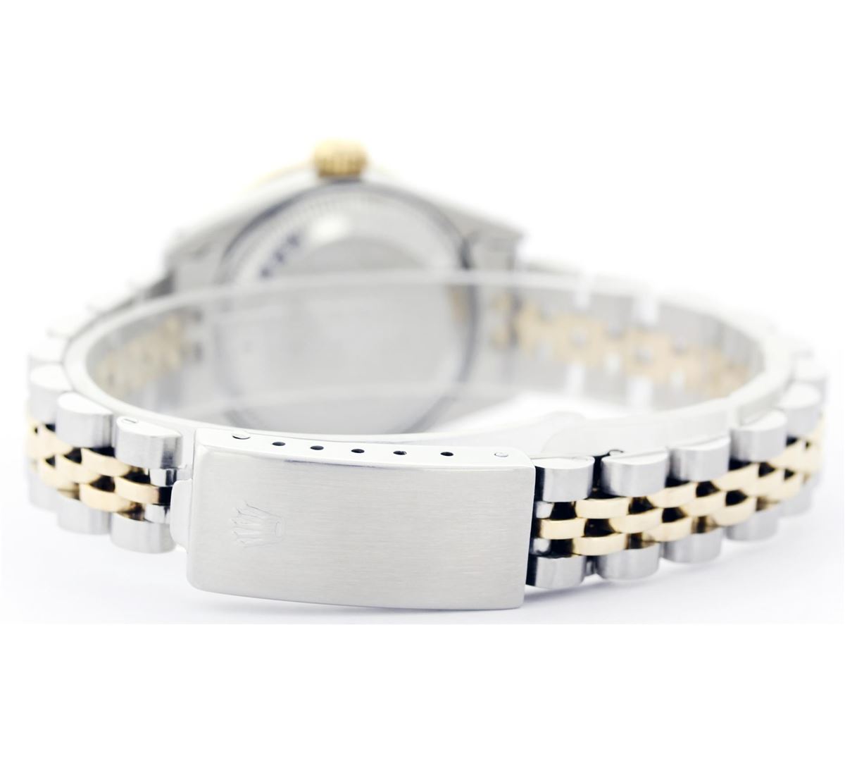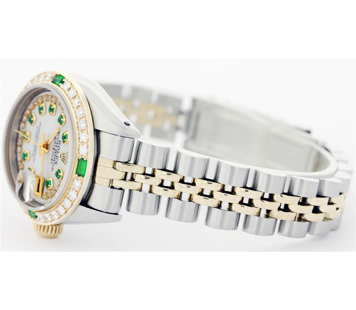 One Ladies Two Tone Rolex Datejust Polished, Serviced & Electronically Tested, 14K Yellow Gold & Stainless Steel Case:26mm, 14K Yellow Gold Crown, Custom Bezel: 18K Yellow Gold Emerald Beadset Diamond Bezel, Diamond Count: 28 Diamonds + 4 Emeralds Total Weight .70 Carat, Clarity: Si-VS, Color: G to H. Custom Crystal: Synthetic Sapphire Cyclops Lens. Movement: Automatic Winding Movement Caliber 2030. Custom Dial: Mother Of Pearl With Green Emerald String Diamond Hour Markers. 43 Emeralds In Dial, Clarity: Si-VS, Color: G to H. Date Window: 3 O'Clock Position Date Display, Non Quickset, Model: 6917 Condition: G-6 Extra Fine. Bracelet: Two Tone 14K Yellow Gold & Stainless Steel Jubilee. Bright Polish. 5.5 Inch Length, Adjustable. Standard Clasp, With Rolex Logo.