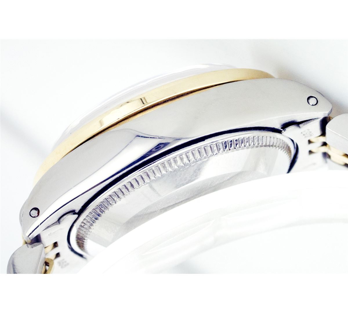 One Ladies Two Tone Rolex Datejust Polished, Serviced & Electronically Tested, 14K Yellow Gold & Stainless Steel Case:26mm, 14K Yellow Gold Crown, Custom Bezel: 18K Yellow Gold Emerald Beadset Diamond Bezel, Diamond Count: 28 Diamonds + 4 Emeralds Total Weight .70 Carat, Clarity: Si-VS, Color: G to H. Custom Crystal: Synthetic Sapphire Cyclops Lens. Movement: Automatic Winding Movement Caliber 2030. Custom Dial: Mother Of Pearl With Green Emerald Hour Markers. 10 Emeralds In Dial, Clarity: Si-VS, Color: G to H. Date Window: 3 O'Clock Position Date Display, Non Quickset, Model: 6917 Condition: G-6 Extra Fine. Bracelet: Two Tone 14K Yellow Gold & Stainless Steel Jubilee. Bright Polish. 5.5 Inch Length, Adjustable. Standard Clasp, With Rolex Logo.