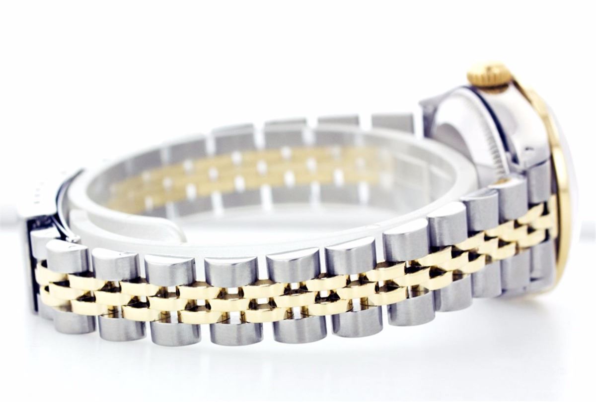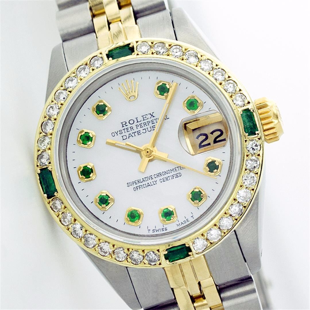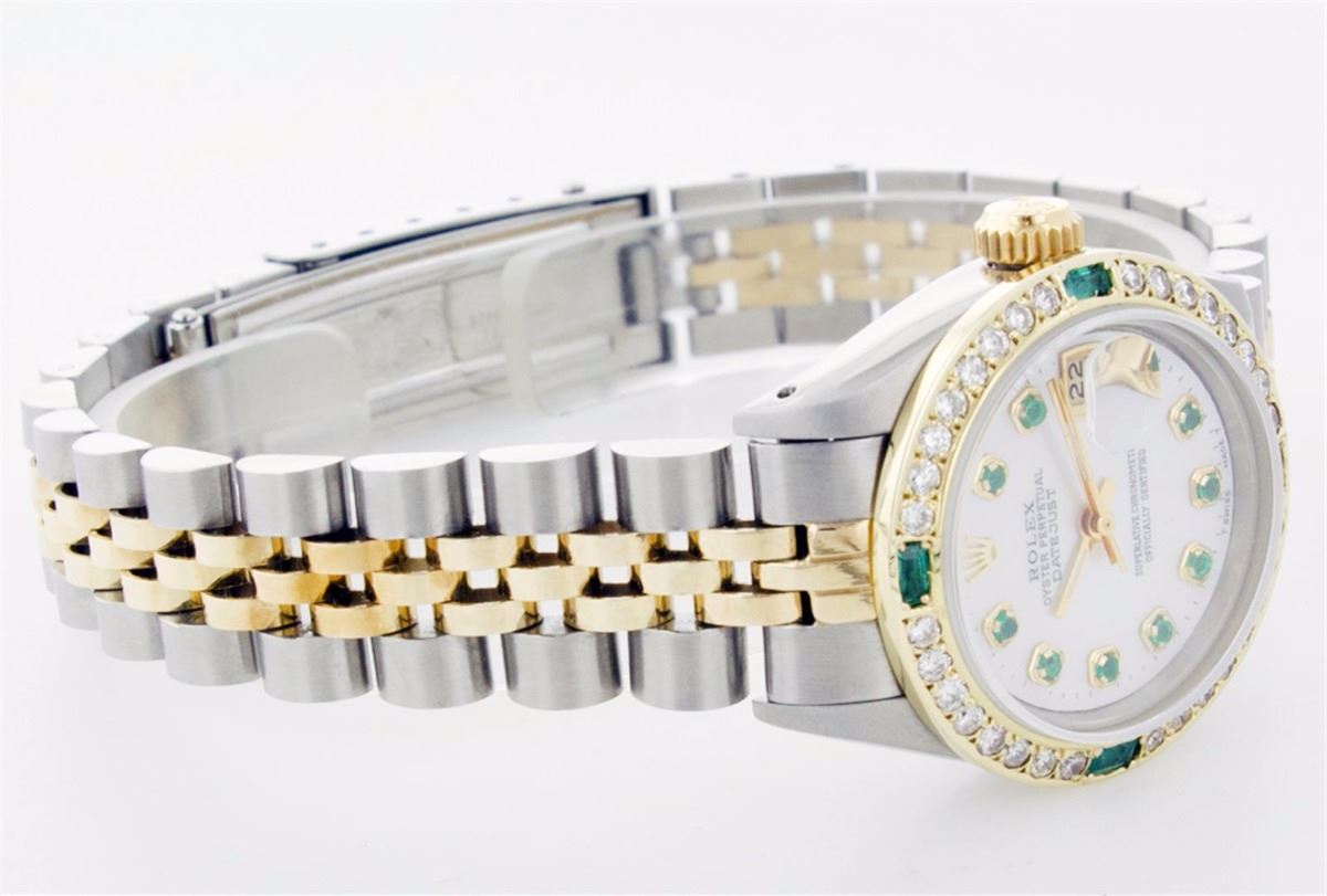 One Ladies Two Tone Rolex Datejust Polished, Serviced & Electronically Tested, 14K Yellow Gold & Stainless Steel Case:26mm, 14K Yellow Gold Crown, Custom Bezel: 18K Yellow Gold Emerald Beadset Diamond Bezel, Diamond Count: 28 Diamonds + 4 Emeralds Total Weight .70 Carat, Clarity: Si-VS, Color: G to H. Custom Crystal: Synthetic Sapphire Cyclops Lens. Movement: Automatic Winding Movement Caliber 2030. Custom Dial: Mother Of Pearl With Green Emerald Hour Markers. 10 Emeralds In Dial, Clarity: Si-VS, Color: G to H. Date Window: 3 O'Clock Position Date Display, Non Quickset, Model: 6917 Condition: G-6 Extra Fine. Bracelet: Two Tone 14K Yellow Gold & Stainless Steel Jubilee. Bright Polish. 5.5 Inch Length, Adjustable. Standard Clasp, With Rolex Logo.