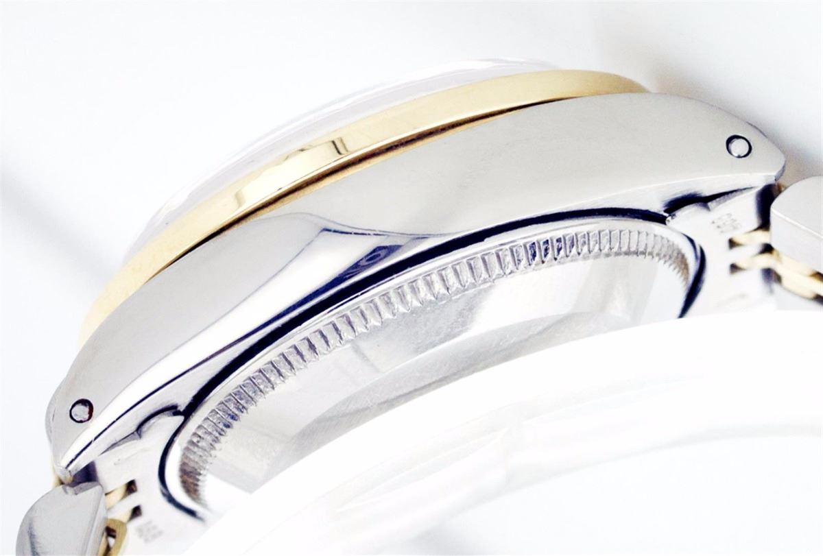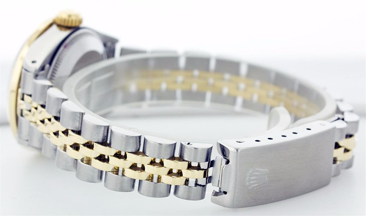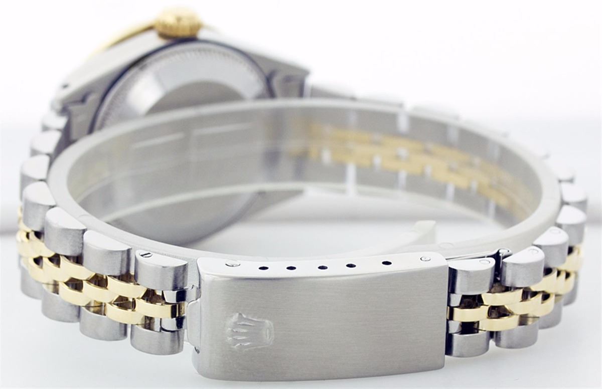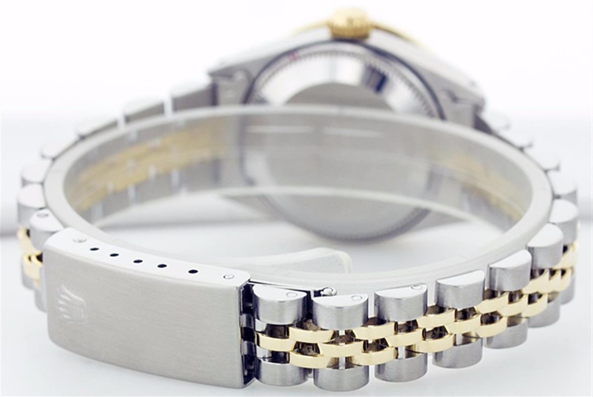 One Ladies Two Tone Rolex Datejust Polished, Serviced & Electronically Tested, 14K Yellow Gold & Stainless Steel Case:26mm, 14K Yellow Gold Crown, Custom Bezel: 18K Yellow Gold Emerald Beadset Diamond Bezel, Diamond Count: 28 Diamonds + 4 Emeralds Total Weight .70 Carat, Clarity: Si-VS, Color: G to H. Custom Crystal: Synthetic Sapphire Cyclops Lens. Movement: Automatic Winding Movement Caliber 2030. Custom Dial: Mother Of Pearl With Green Emerald Hour Markers. 10 Emeralds In Dial, Clarity: Si-VS, Color: G to H. Date Window: 3 O'Clock Position Date Display, Non Quickset, Model: 6917 Condition: G-6 Extra Fine. Bracelet: Two Tone 14K Yellow Gold & Stainless Steel Jubilee. Bright Polish. 5.5 Inch Length, Adjustable. Standard Clasp, With Rolex Logo.