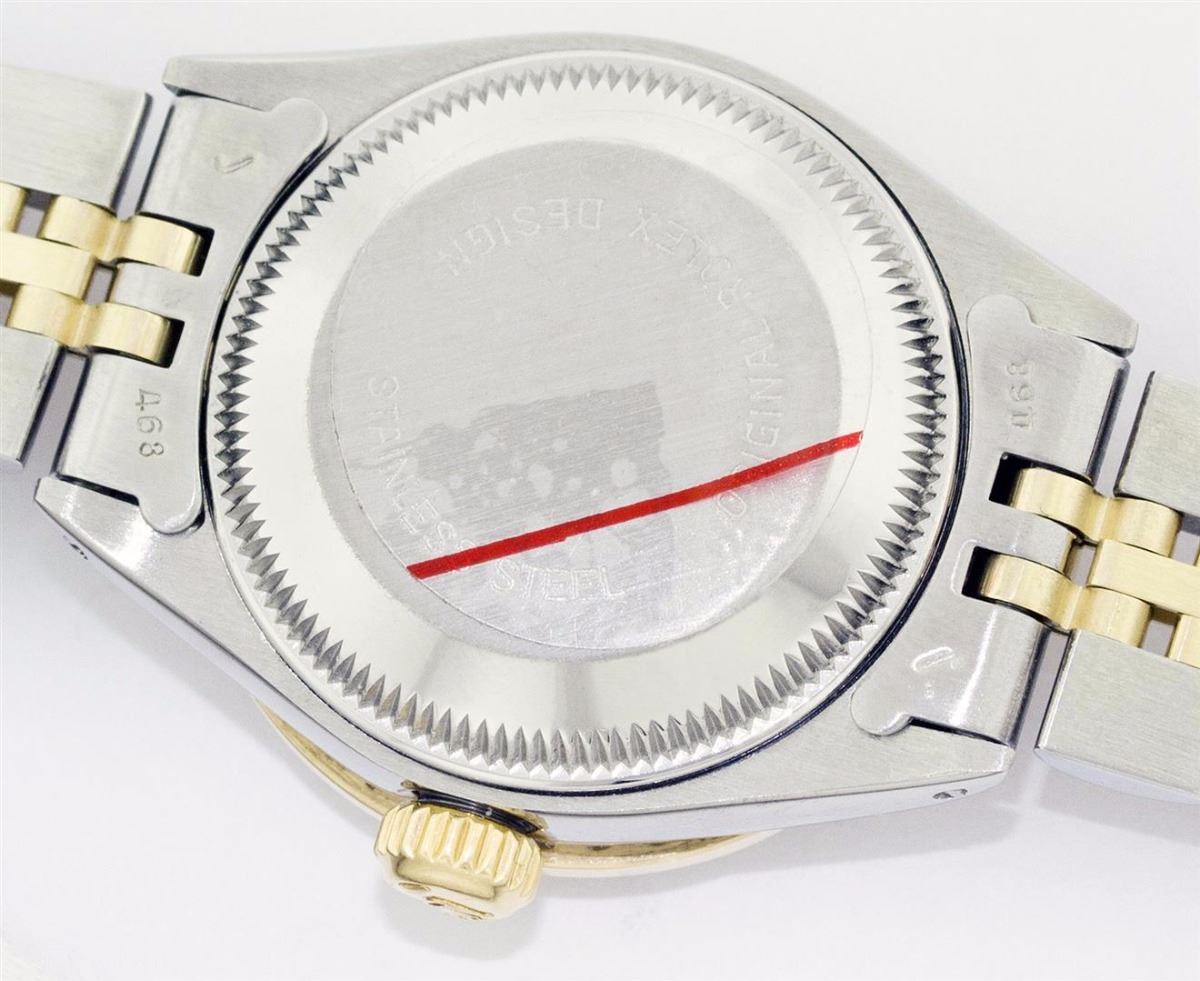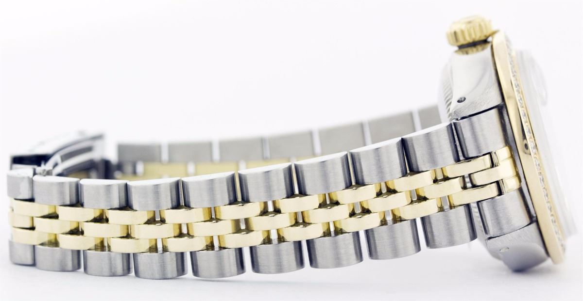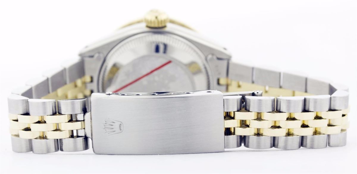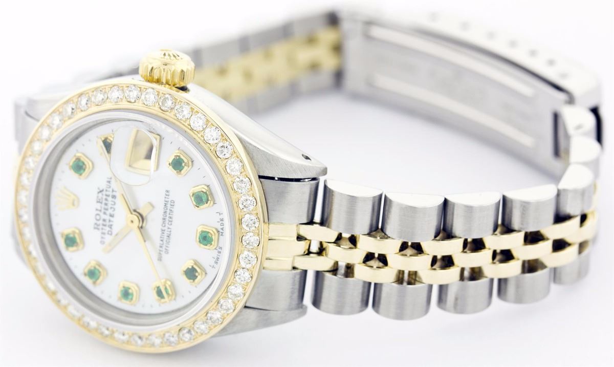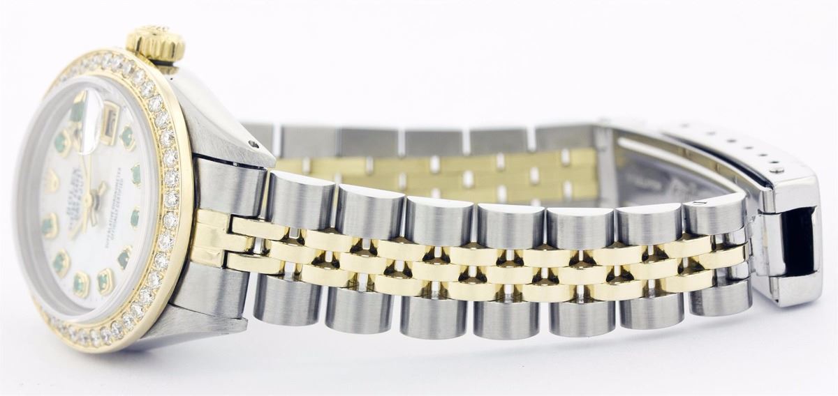 One Ladies Two Tone Rolex Datejust Polished, Serviced & Electronically Tested, 14K Yellow Gold & Stainless Steel Case:26mm, 14K Yellow Gold Crown, Custom Bezel: 18K Yellow Gold Emerald Beadset Diamond Bezel, Diamond Count: 28 Diamonds + 4 Emeralds Total Weight .70 Carat, Clarity: Si-VS, Color: G to H. Custom Crystal: Synthetic Sapphire Cyclops Lens. Movement: Automatic Winding Movement Caliber 2030. Custom Dial: Mother Of Pearl With Emerald Diamond Dial, Stone Count: 10 Emeralds in Dial. Date Window: 3 O'Clock Position Date Display, Non Quickset, Model: 6917 Condition: G-6 Extra Fine. Bracelet: Two Tone 14K Yellow Gold & Stainless Steel Jubilee. Bright Polish. 5.5 Inch Length, Adjustable. Standard Clasp, With Rolex Logo.