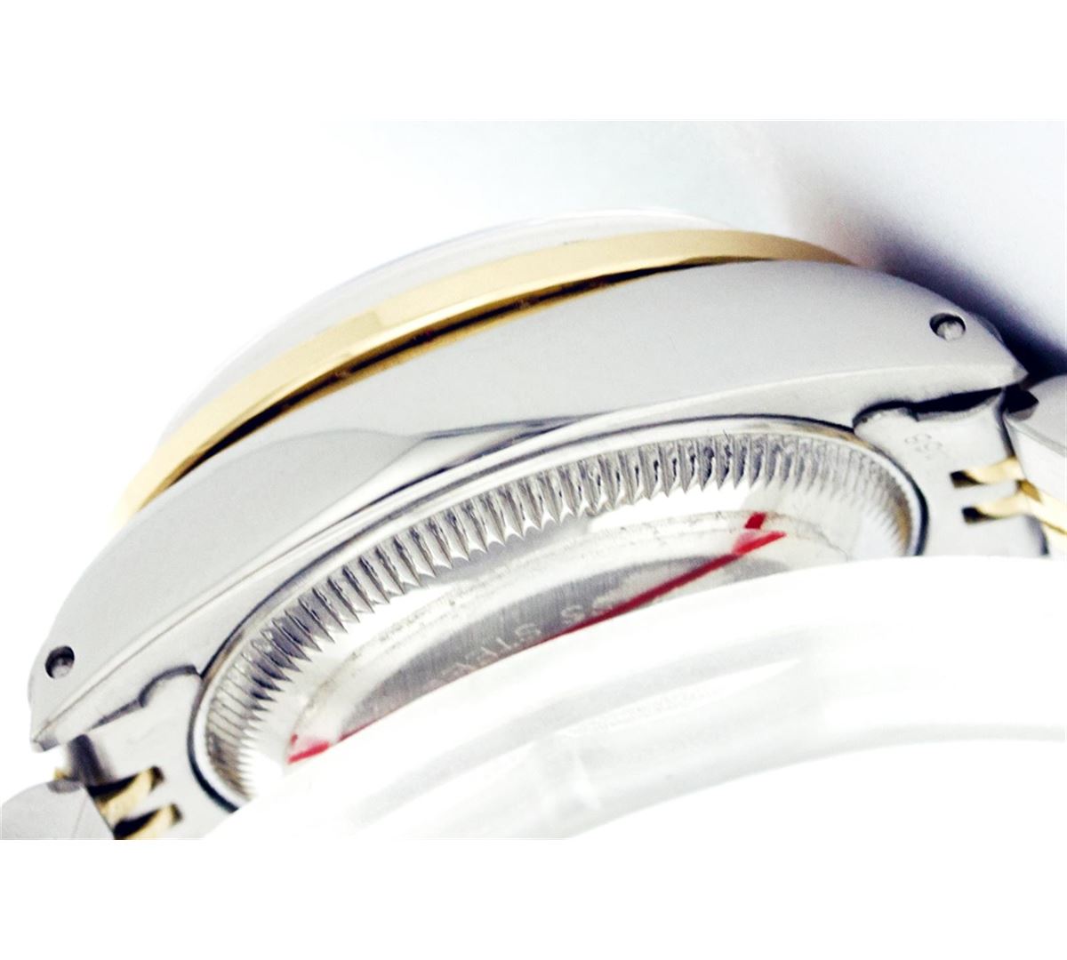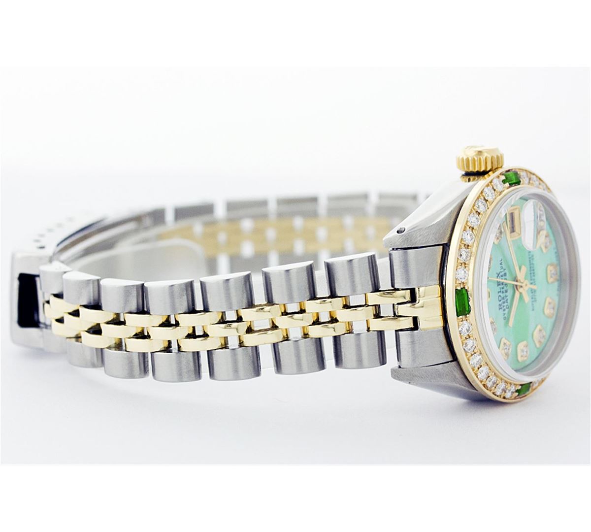 One Ladies Two Tone Rolex Datejust Polished, Serviced & Electronically Tested, 14K Yellow Gold & Stainless Steel Case: 26mm, 14K Yellow Gold Crown, Custom Bezel: 18K Yellow Gold Emerald Beadset Diamond Bezel, Diamond Count: 28 Diamonds + 4 Emeralds Total Weight .70 Carat, Clarity: Si-VS, Color: G to H. Custom Crystal: Synthetic Sapphire Cyclops Lens. Movement: Automatic Winding Movement Caliber 2030. Custom Dial: Green Mother Of Pearl Dial With Diamond Hour Markers. Date Window: 3 O'Clock Position Date Display, Non Quickset, Model: 6917 Condition: G-6 Extra Fine. Bracelet: Two Tone 14K Yellow Gold & Stainless Steel Jubilee. Bright Polish. 5.5 Inch Length, Adjustable. Standard Clasp, With Rolex Logo.