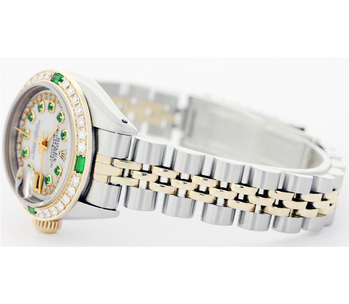 One Ladies Two Tone Rolex Datejust Polished, Serviced & Electronically Tested, 14K Yellow Gold & Stainless Steel Case:26mm, 14K Yellow Gold Crown, Custom Bezel: 18K Yellow Gold Emerald Beadset Diamond Bezel, Diamond Count: 28 Diamonds + 4 Emeralds Total Weight .70 Carat, Clarity: Si-VS, Color: G to H. Custom Crystal: Synthetic Sapphire Cyclops Lens. Movement: Automatic Winding Movement Caliber 2030. Custom Dial: Mother Of Pearl With Green Emerald String Diamond Hour Markers. 10 Emeralds + 33 Diamonds In Dial, Clarity: Si-VS, Color: G to H. Date Window: 3 O'Clock Position Date Display, Non Quickset, Model: 6917 Condition: G-6 Extra Fine. Bracelet: Two Tone 14K Yellow Gold & Stainless Steel Jubilee. Bright Polish. 5.5 Inch Length, Adjustable. Standard Clasp, With Rolex Logo.