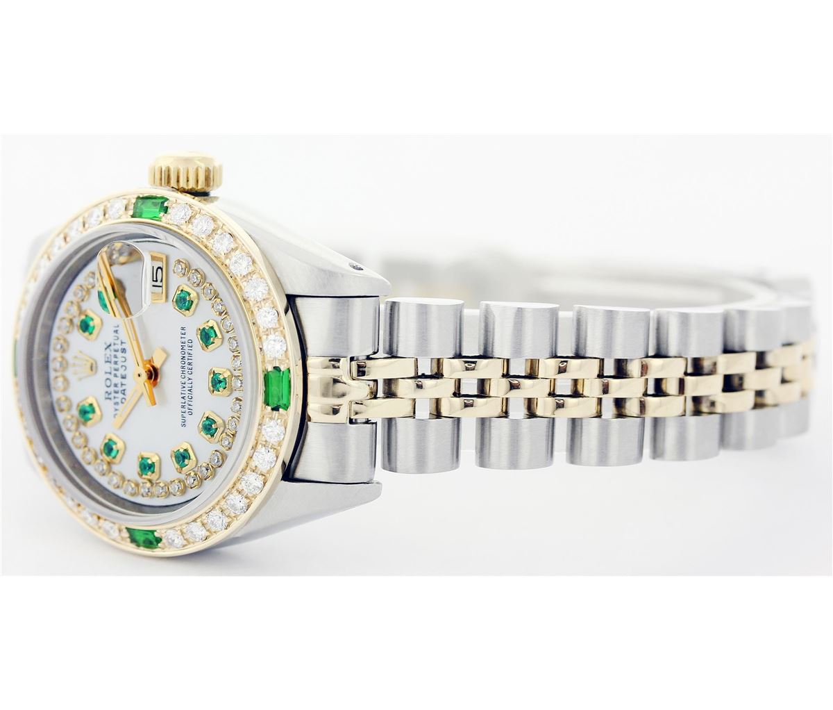 One Ladies Two Tone Rolex Datejust Polished, Serviced & Electronically Tested, 14K Yellow Gold & Stainless Steel Case:26mm, 14K Yellow Gold Crown, Custom Bezel: 18K Yellow Gold Emerald Beadset Diamond Bezel, Diamond Count: 28 Diamonds + 4 Emeralds Total Weight .70 Carat, Clarity: Si-VS, Color: G to H. Custom Crystal: Synthetic Sapphire Cyclops Lens. Movement: Automatic Winding Movement Caliber 2030. Custom Dial: Mother Of Pearl With Green Emerald String Diamond Hour Markers. 10 Emeralds + 33 Diamonds In Dial, Clarity: Si-VS, Color: G to H. Date Window: 3 O'Clock Position Date Display, Non Quickset, Model: 6917 Condition: G-6 Extra Fine. Bracelet: Two Tone 14K Yellow Gold & Stainless Steel Jubilee. Bright Polish. 5.5 Inch Length, Adjustable. Standard Clasp, With Rolex Logo.