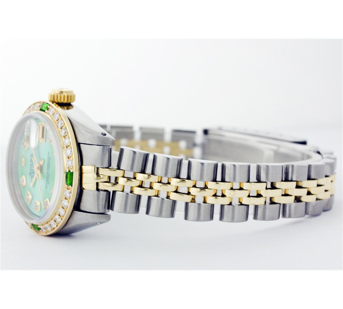 One Ladies Two Tone Rolex Datejust Polished, Serviced & Electronically Tested, 14K Yellow Gold & Stainless Steel Case: 26mm, 14K Yellow Gold Crown, Custom Bezel: 18K Yellow Gold Emerald Beadset Diamond Bezel, Diamond Count: 28 Diamonds + 4 Emeralds Total Weight .70 Carat, Clarity: Si-VS, Color: G to H. Custom Crystal: Synthetic Sapphire Cyclops Lens. Movement: Automatic Winding Movement Caliber 2030. Custom Dial: Green Mother Of Pearl Dial With Diamond Hour Markers. Date Window: 3 O'Clock Position Date Display, Non Quickset, Model: 6917 Condition: G-6 Extra Fine. Bracelet: Two Tone 14K Yellow Gold & Stainless Steel Jubilee. Bright Polish. 5.5 Inch Length, Adjustable. Standard Clasp, With Rolex Logo.