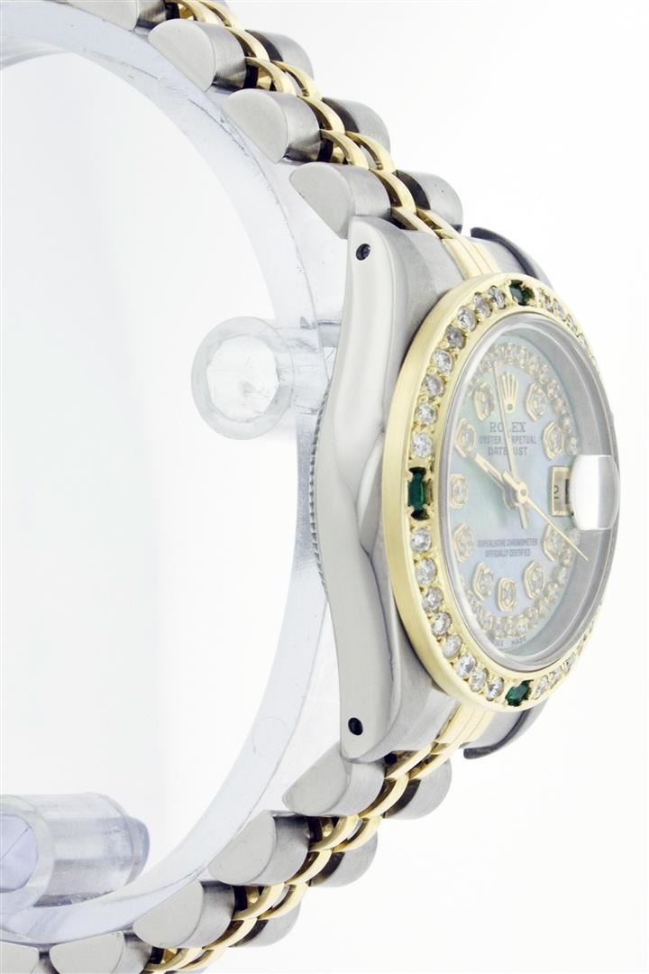 One Ladies Two Tone Rolex Datejust Polished, Serviced & Electronically Tested, 14K Yellow Gold & Stainless Steel Case:26mm, 14K Yellow Gold Crown, Custom Bezel: 18K Yellow Gold Emerald Beadset Diamond Bezel, Diamond Count: 28 Diamonds + 4 Emeralds Total Weight .70 Carat, Clarity: Si-VS, Color: G to H. Custom Crystal: Synthetic Sapphire Cyclops Lens. Movement: Automatic Winding Movement Caliber 2030. Custom Dial: Green Mother Of Pearl With Emerald String Diamond Dial, Stone Count: 43 Diamonds in Dial. Date Window: 3 O'Clock Position Date Display, Non Quickset, Model: 6917 Condition: G-6 Extra Fine. Bracelet: Two Tone 14K Yellow Gold & Stainless Steel Jubilee. Bright Polish. 5.5 Inch Length, Adjustable. Standard Clasp, With Rolex Logo.