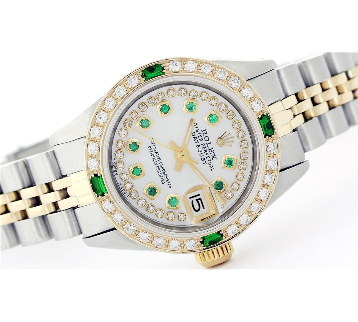 One Ladies Two Tone Rolex Datejust Polished, Serviced & Electronically Tested, 14K Yellow Gold & Stainless Steel Case:26mm, 14K Yellow Gold Crown, Custom Bezel: 18K Yellow Gold Emerald Beadset Diamond Bezel, Diamond Count: 28 Diamonds + 4 Emeralds Total Weight .70 Carat, Clarity: Si-VS, Color: G to H. Custom Crystal: Synthetic Sapphire Cyclops Lens. Movement: Automatic Winding Movement Caliber 2030. Custom Dial: Mother Of Pearl With Green Emerald String Diamond Hour Markers. 10 Emeralds + 33 Diamonds In Dial, Clarity: Si-VS, Color: G to H. Date Window: 3 O'Clock Position Date Display, Non Quickset, Model: 6917 Condition: G-6 Extra Fine. Bracelet: Two Tone 14K Yellow Gold & Stainless Steel Jubilee. Bright Polish. 5.5 Inch Length, Adjustable. Standard Clasp, With Rolex Logo.