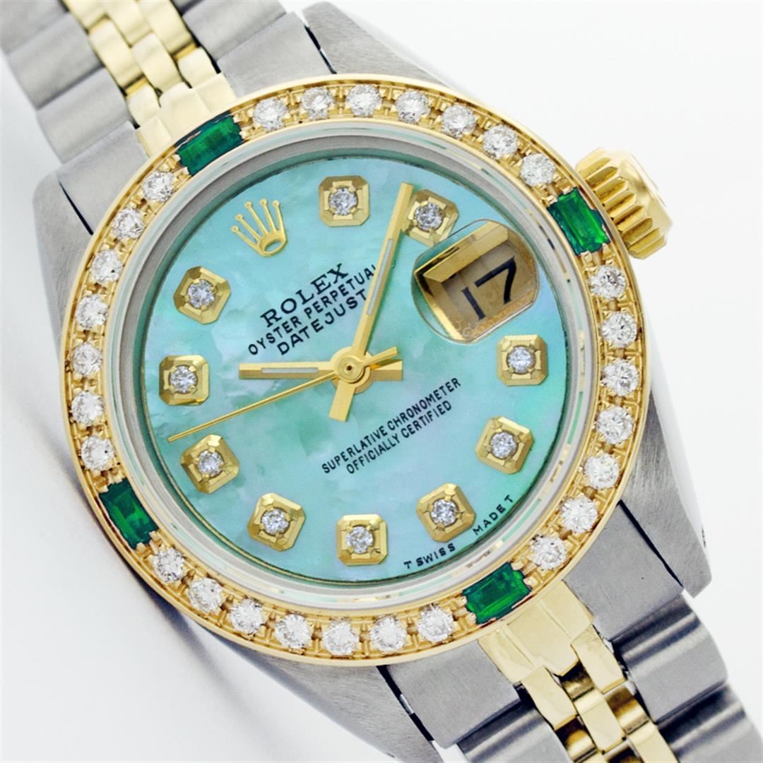 One Ladies Two Tone Rolex Datejust Polished, Serviced & Electronically Tested, 14K Yellow Gold & Stainless Steel Case: 26mm, 14K Yellow Gold Crown, Custom Bezel: 18K Yellow Gold Emerald Beadset Diamond Bezel, Diamond Count: 28 Diamonds + 4 Emeralds Total Weight .70 Carat, Clarity: Si-VS, Color: G to H. Custom Crystal: Synthetic Sapphire Cyclops Lens. Movement: Automatic Winding Movement Caliber 2030. Custom Dial: Green Mother Of Pearl Dial With Diamond Hour Markers. Date Window: 3 O'Clock Position Date Display, Non Quickset, Model: 6917 Condition: G-6 Extra Fine. Bracelet: Two Tone 14K Yellow Gold & Stainless Steel Jubilee. Bright Polish. 5.5 Inch Length, Adjustable. Standard Clasp, With Rolex Logo.