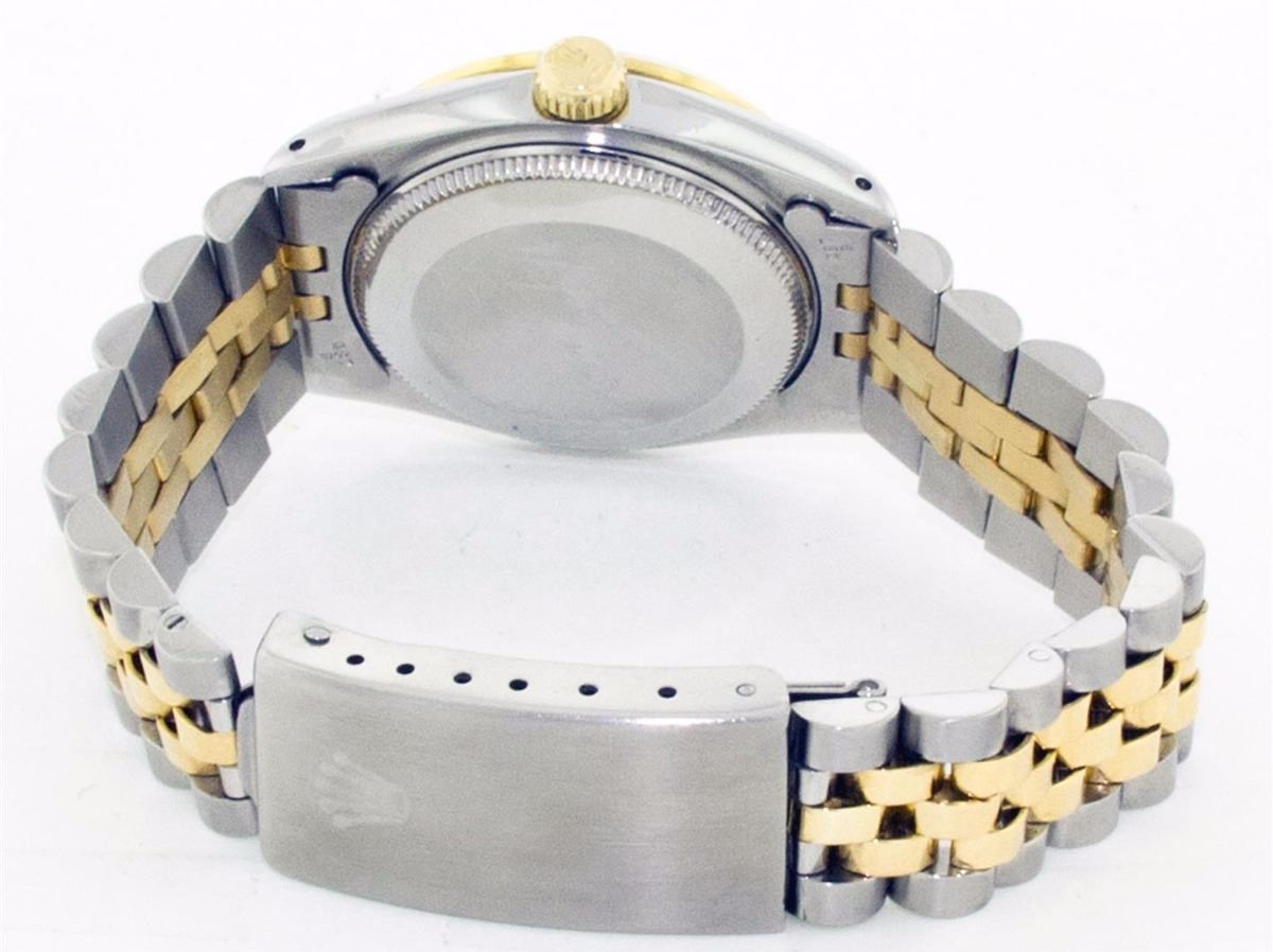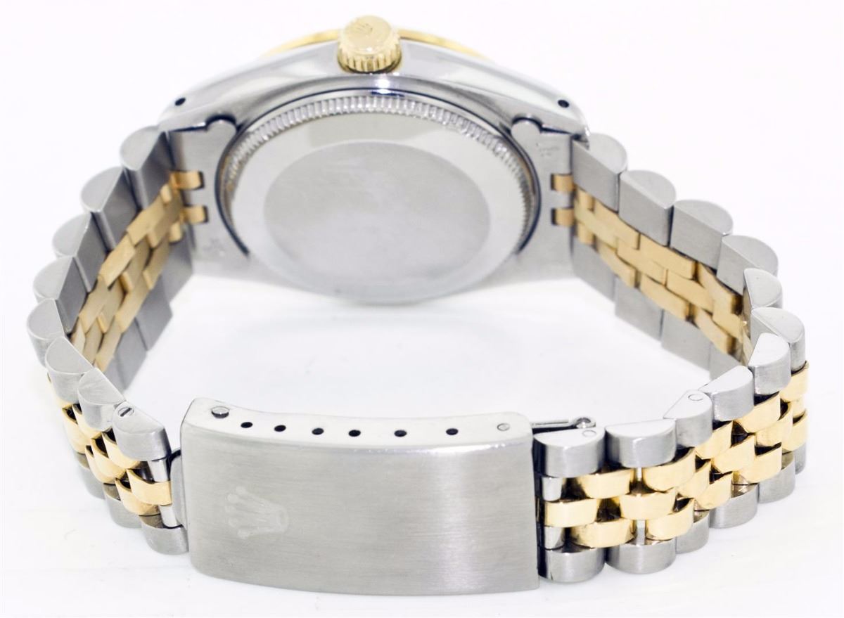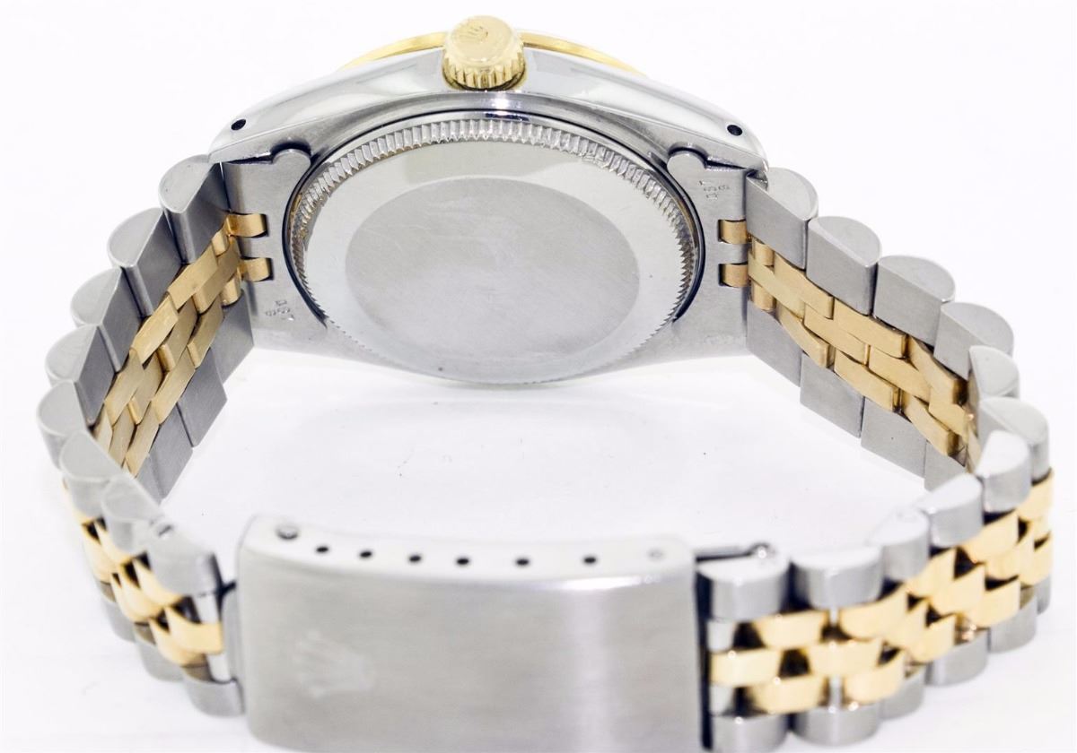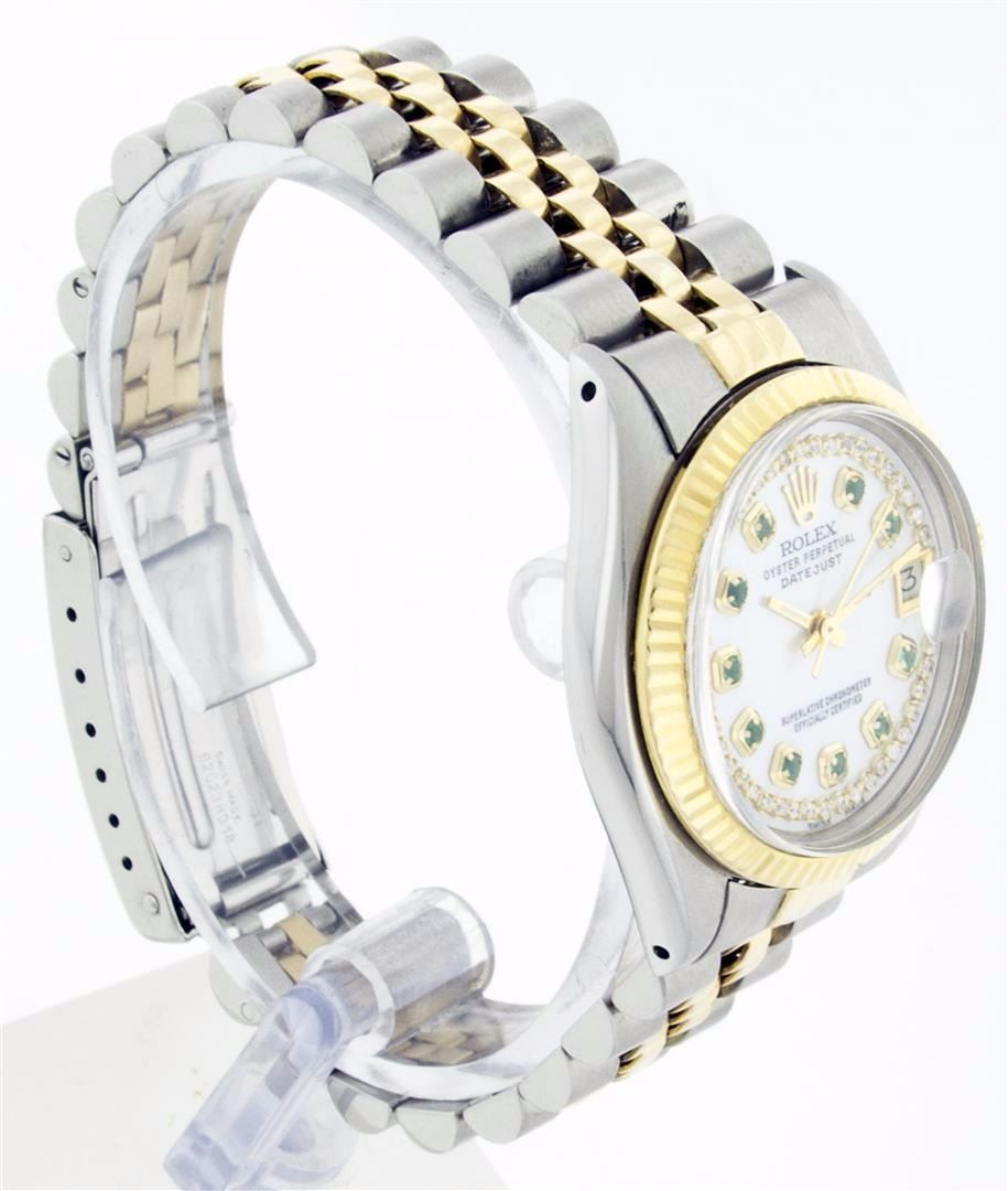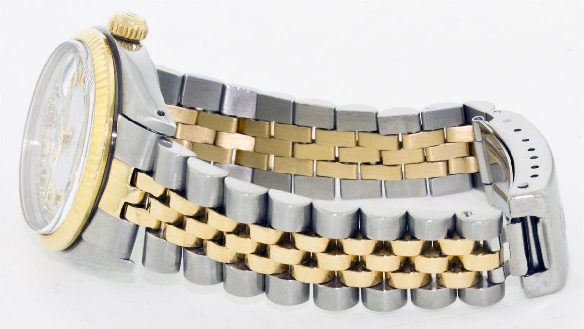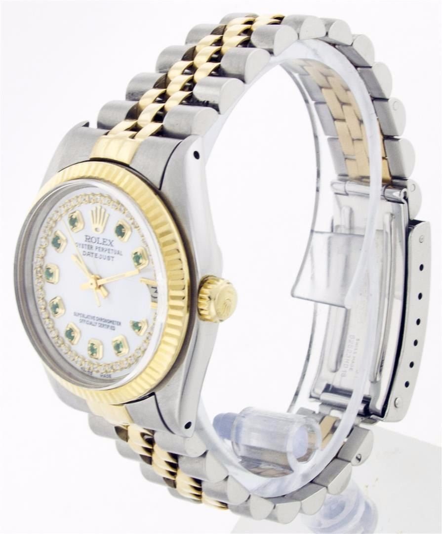 One Ladies Two Tone Rolex Datejust Polished, Serviced & Electronically Tested, 14K Yellow Gold & Stainless Steel Case:26mm, 14K Yellow Gold Crown, Custom Bezel: 14K Yellow Gold Fluted Bezel. Custom Crystal: Acrylic Cyclops Lens. Movement: Automatic Winding Movement Caliber 2030. Custom Dial: Mother Of Pearl Emerald String Diamond Dial, Stone Count: 10 Emeralds + 33 Diamonds. Date Window: 3 O'Clock Position Date Display, Non Quickset, Model: 6917 Condition: G-6 Extra Fine. Bracelet: Two Tone 14K Yellow Gold & Stainless Steel Jubilee. Bright Polish. 5.5 Inch Length, Adjustable. Standard Clasp, With Rolex Logo.