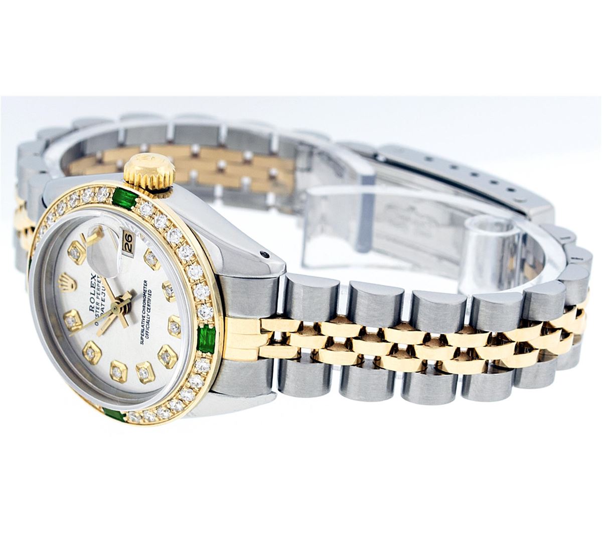 One Ladies Two Tone Rolex Datejust Polished, Serviced & Electronically Tested, 14K Yellow Gold & Stainless Steel Case:26mm, 14K Yellow Gold Crown, Custom Bezel: 18K Yellow Gold Emerald Beadset Diamond Bezel, Diamond Count: 28 Diamonds + 4 Emeralds, Total Weight .70 Carat, Clarity: Si-VS, Color: G to H. Custom Crystal: Synthetic Sapphire Cyclops Lens. Movement: Automatic Winding Movement Caliber 2030. Custom Dial: Silver With Diamond Hour Markers. 10 Diamonds In Dial, Clarity: Si-VS, Color: G to H. Date Window: 3 O'Clock Position Date Display, Model: Datejust, Condition: G-6 Extra Fine. Bracelet: Two Tone 14K Yellow Gold & Stainless Steel Jubilee. Bright Polish. 6.0 Inch Length, Adjustable. Standard Clasp, With Rolex Logo. Comes with 6 month warranty.