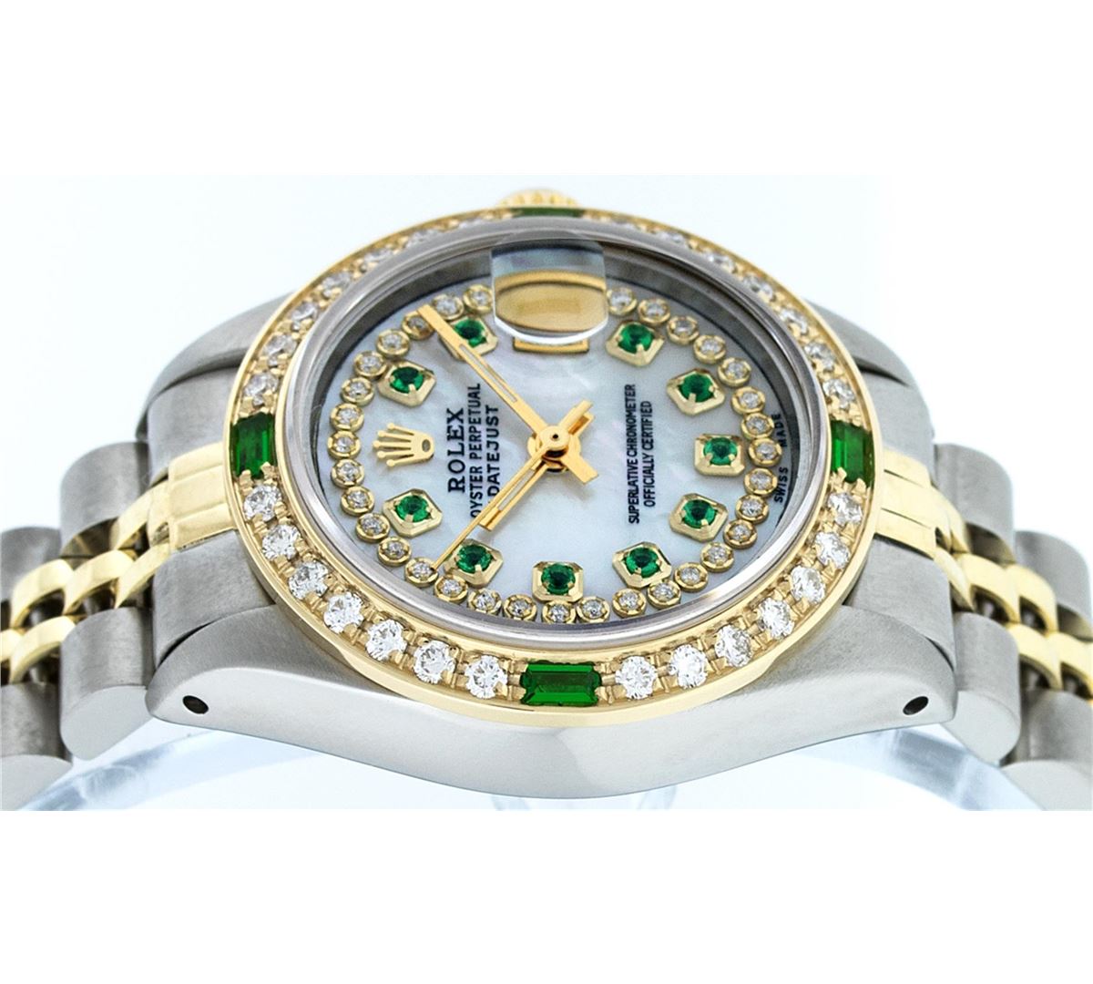 One Ladies Two Tone Rolex Datejust Polished, Serviced & Electronically Tested, 14K Yellow Gold & Stainless Steel Case:26mm, 14K Yellow Gold Crown, Custom Bezel: 18K Yellow Gold Emerald Beadset Diamond Bezel, Diamond Count: 28 Diamonds + 4 Emeralds Total Weight .70 Carat, Clarity: Si-VS, Color: G to H. Custom Crystal: Synthetic Sapphire Cyclops Lens. Movement: Automatic Winding Movement Caliber 2030. Custom Dial: Mother Of Pearl With Green Emerald String Diamond Hour Markers. 10 Emeralds + 33 Diamonds In Dial, Clarity: Si-VS, Color: G to H. Date Window: 3 O'Clock Position Date Display, Non Quickset, Model: Datejust. Condition: G-6 Extra Fine. Bracelet: Two Tone 14K Yellow Gold & Stainless Steel Jubilee. Bright Polish. 6.0 Inch Length, Adjustable. Standard Clasp, With Rolex Logo.