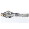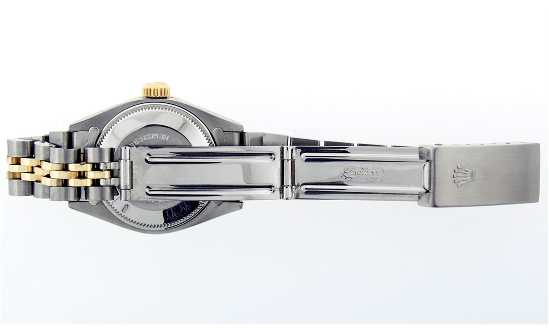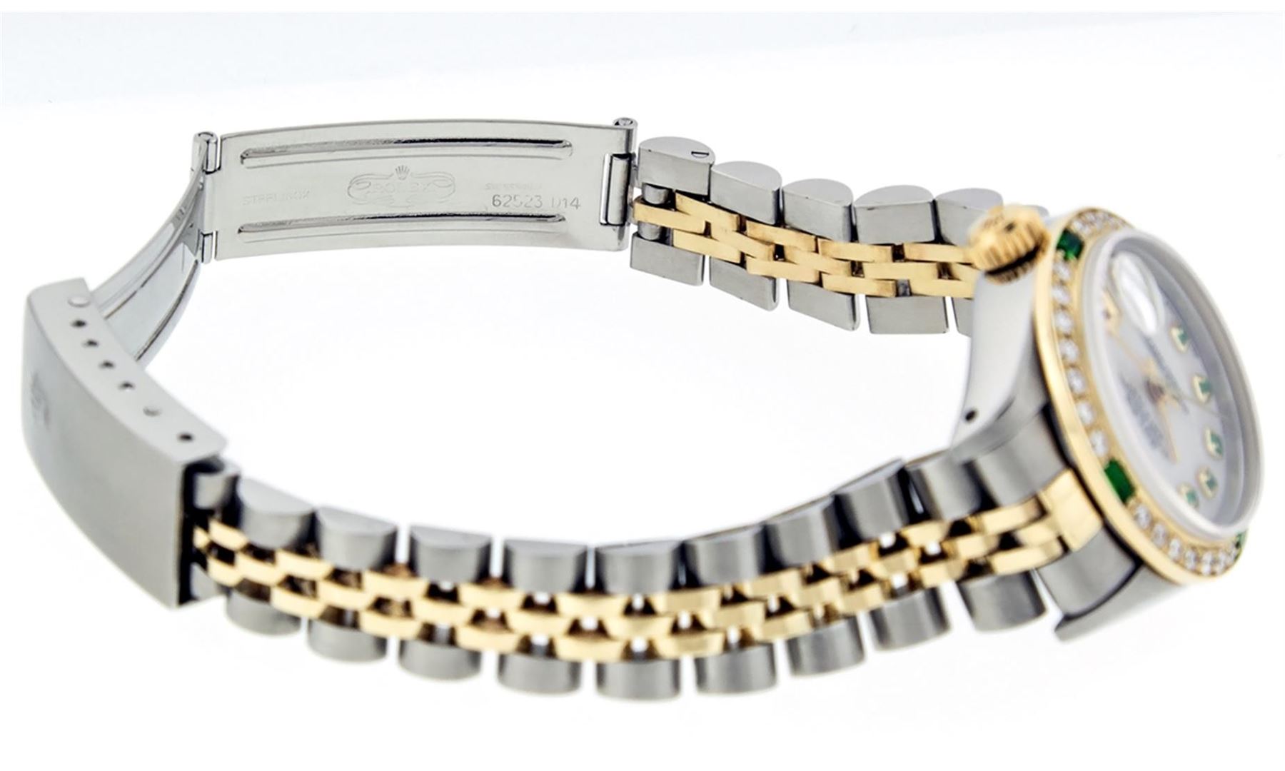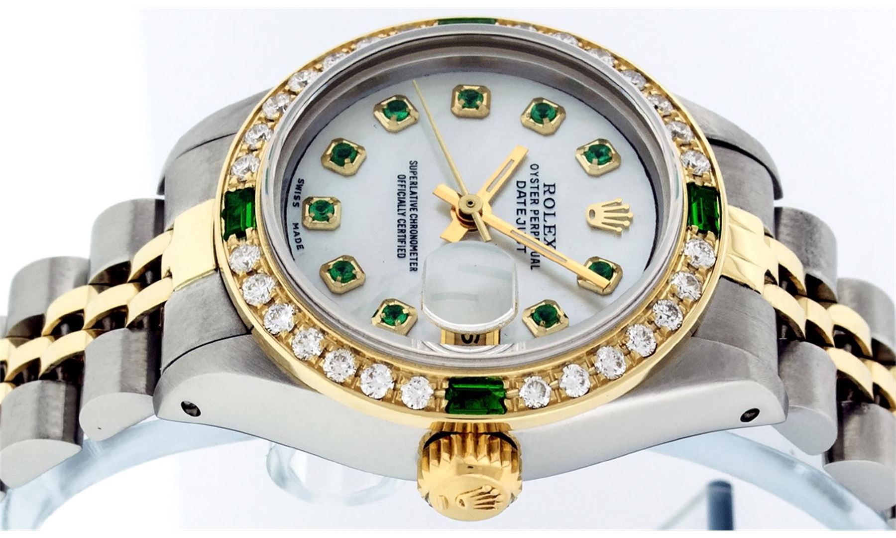 One Ladies Two Tone Rolex Datejust Polished, Serviced & Electronically Tested, 14K Yellow Gold & Stainless Steel Case:26mm, 14K Yellow Gold Crown, Custom Bezel: 18K Yellow Gold Emerald Beadset Diamond Bezel, Diamond Count: 28 Diamonds + 4 Synthetic Emeralds, Total Weight .70 Carat, Clarity: Si-VS, Color: G to H. Custom Crystal: Synthetic Sapphire Cyclops Lens. Movement: Automatic Winding Movement Caliber 2030. Custom Dial: Mother Of Pearl With Emerald Hour Markers. Stone Count: 10 Emeralds In Dial, Clarity: SI-VS, Color: G to H . Date Window: 3 O'Clock Position Date Display, Model: Datejust, Condition: G-6 Extra Fine The Watch Is In Very Good Condition Free Of All Scratches And Dents. Bracelet: Two Tone 14K Yellow Gold & Stainless Steel Jubilee. Bright Polish. 6.0 Inch Length, Adjustable. Standard Clasp, With Rolex Logo.