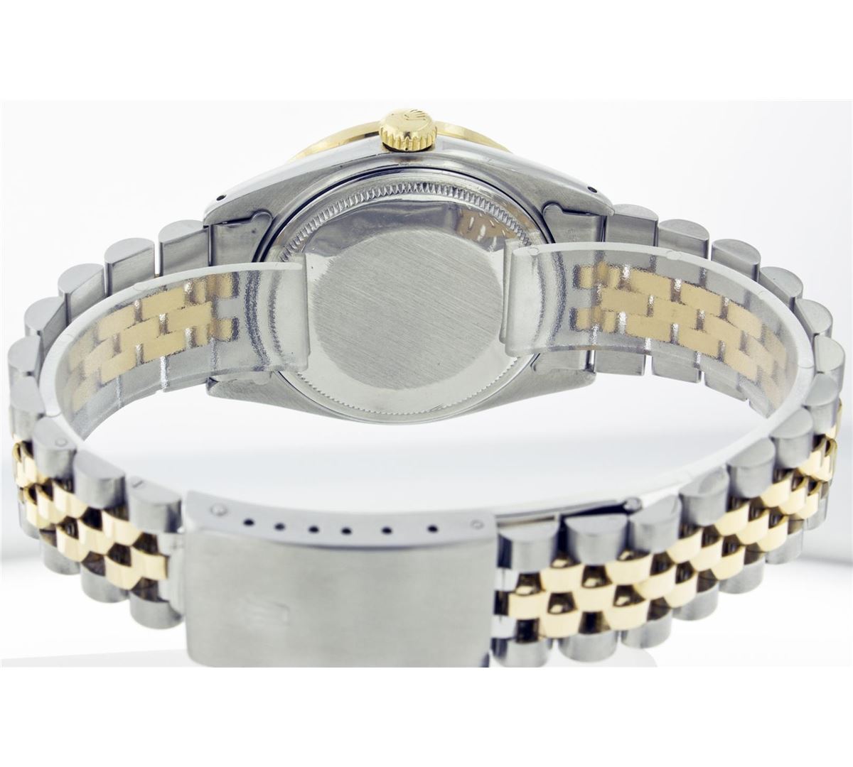 One Mens Two Tone Rolex Datejust Polished, Serviced & Electronically Tested, 14K Yellow Gold & Stainless Steel Case:36mm, 14K Yellow Gold Crown, Custom Bezel: 18K Yellow Gold Emerald Beadset Diamond Bezel, Diamond Count: 36 Diamonds + 4 Emeralds Total Weight 1.00 Carat, Clarity: Si-VS, Color: G to H. Custom Crystal: Synthetic Sapphire Cyclops Lens. Movement: Automatic Winding Movement Caliber 3035. Custom Refinished Dial: Green String Diamond Dial, Diamond Count: 58 Diamonds In Dial in Dial G To H In Color, SI-VS Clarity. Date Window: 3 O'Clock Position Date Display, Quickset, Model: 16013 Condition: G-6 Extra Fine. Bracelet:Two Tone 14K Yellow Gold & Stainless Steel Jubilee. Bright Polish. 6.5 Inch Length, Adjustable. Standard Clasp, With Rolex Logo.