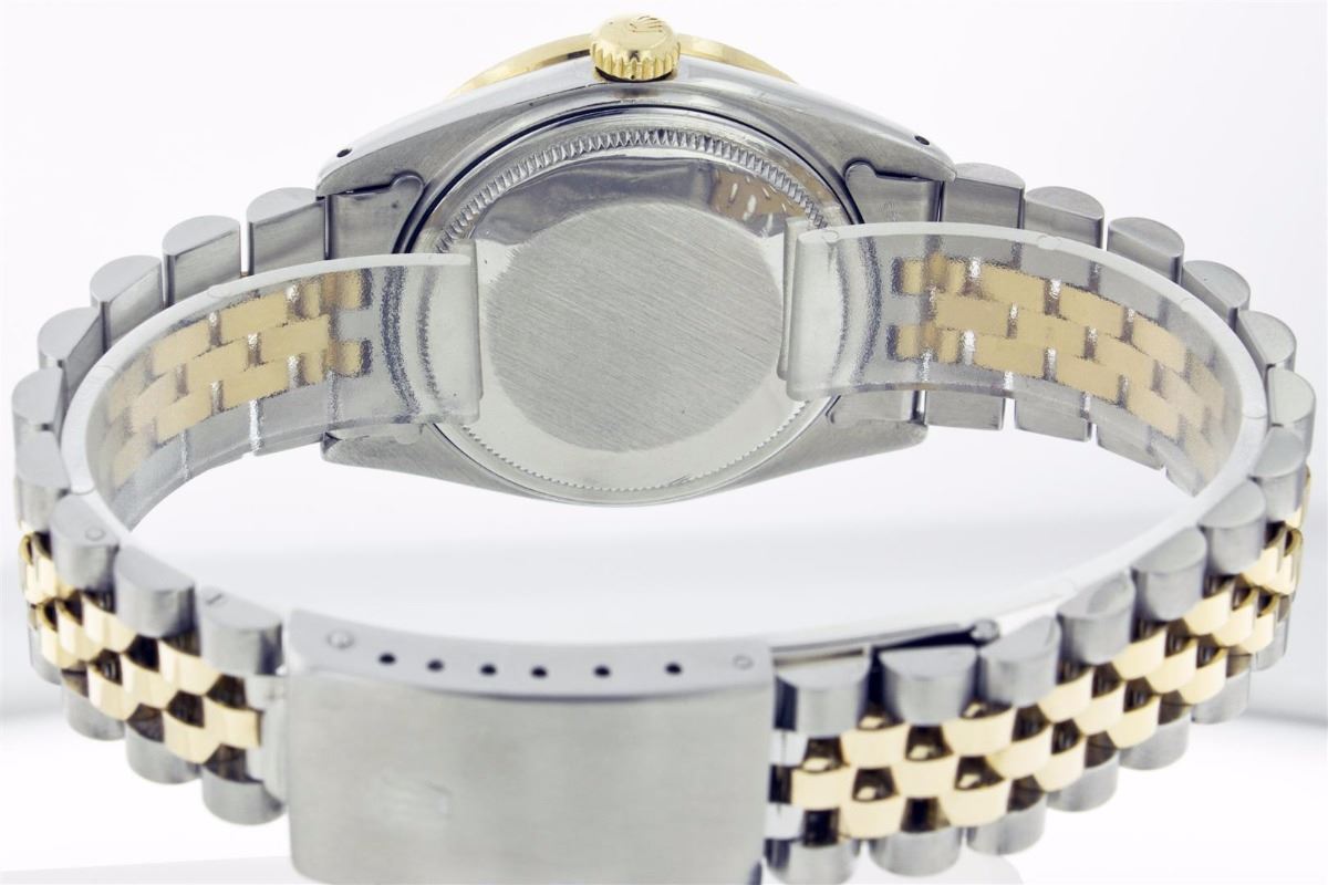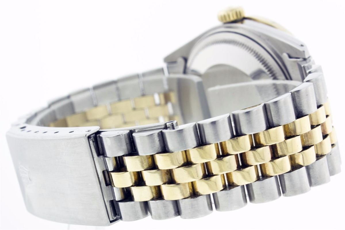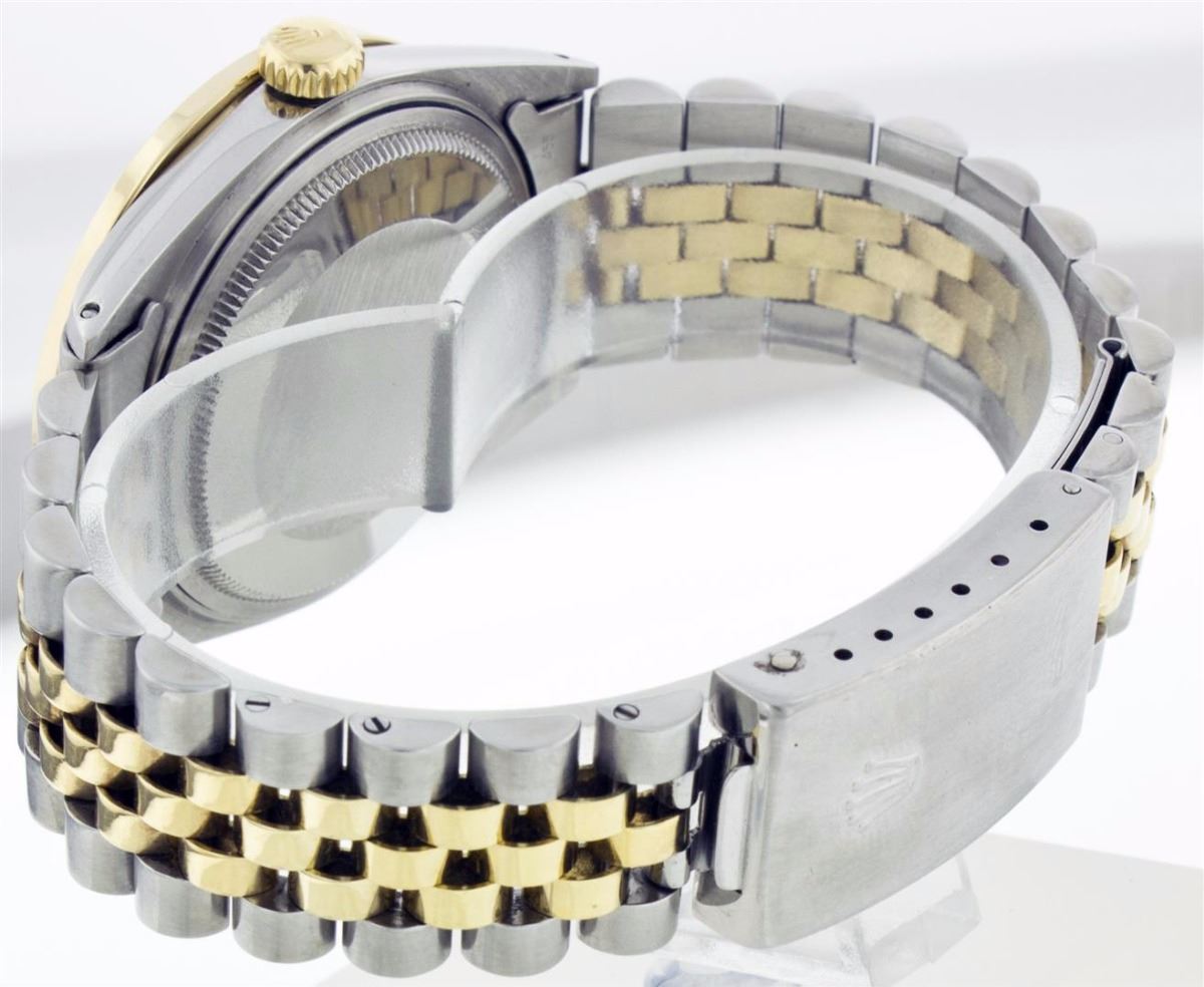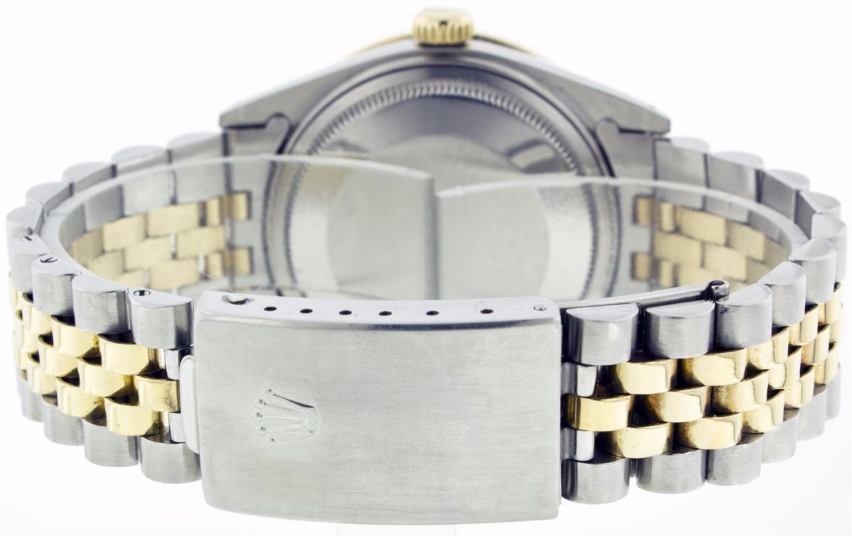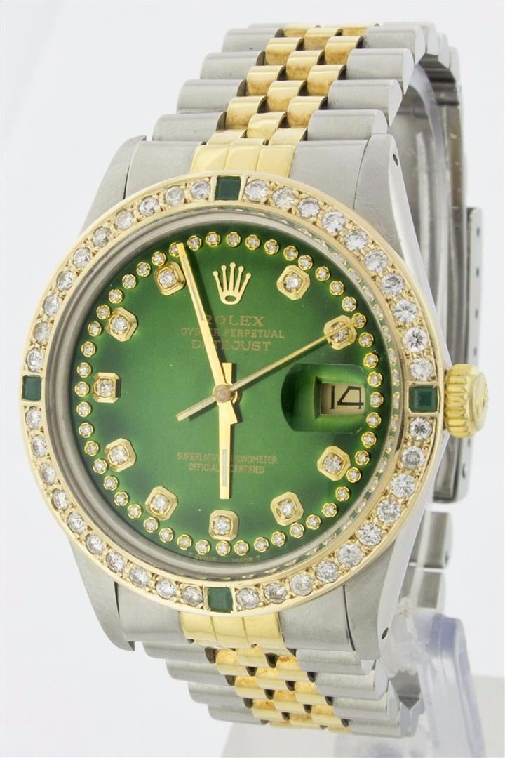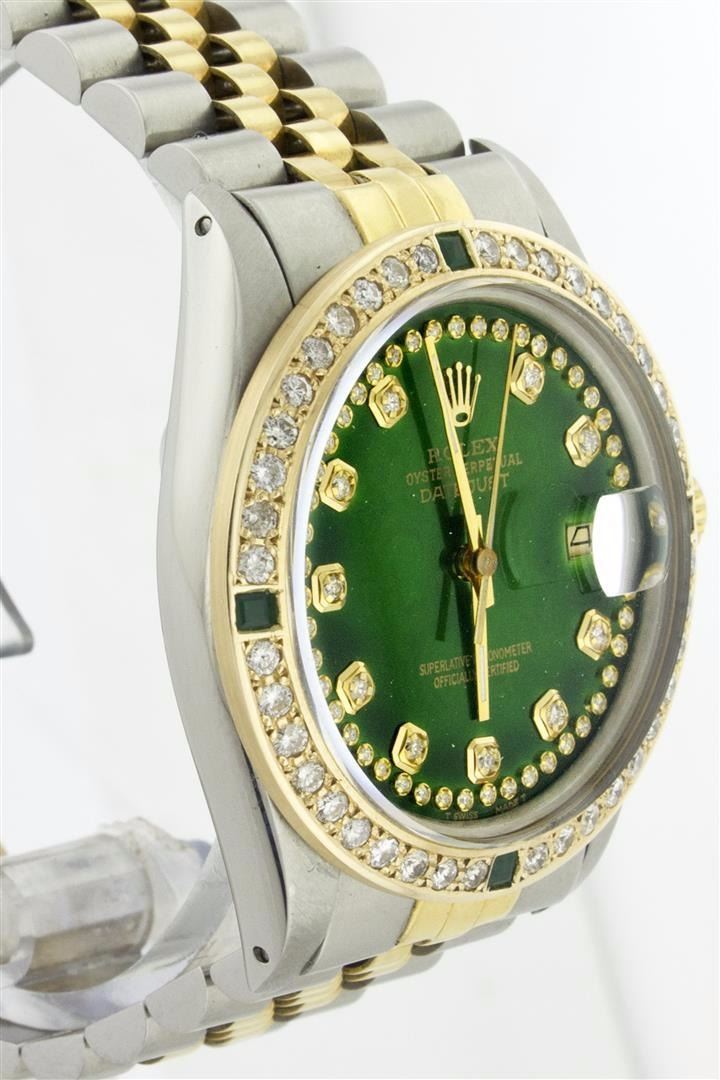 One Mens Two Tone Rolex Datejust Polished, Serviced & Electronically Tested, 14K Yellow Gold & Stainless Steel Case:36mm, 14K Yellow Gold Crown, Custom Bezel: 18K Yellow Gold Emerald Beadset Diamond Bezel, Diamond Count: 36 Diamonds + 4 Emeralds Total Weight 1.00 Carat, Clarity: Si-VS, Color: G to H. Custom Crystal: Synthetic Sapphire Cyclops Lens. Movement: Automatic Winding Movement Caliber 3035. Custom Refinished Dial: Green String Diamond Dial, Diamond Count: 58 Diamonds In Dial in Dial G To H In Color, SI-VS Clarity. Date Window: 3 O'Clock Position Date Display, Quickset, Model: 16013 Condition: G-6 Extra Fine. Bracelet:Two Tone 14K Yellow Gold & Stainless Steel Jubilee. Bright Polish. 6.5 Inch Length, Adjustable. Standard Clasp, With Rolex Logo.
