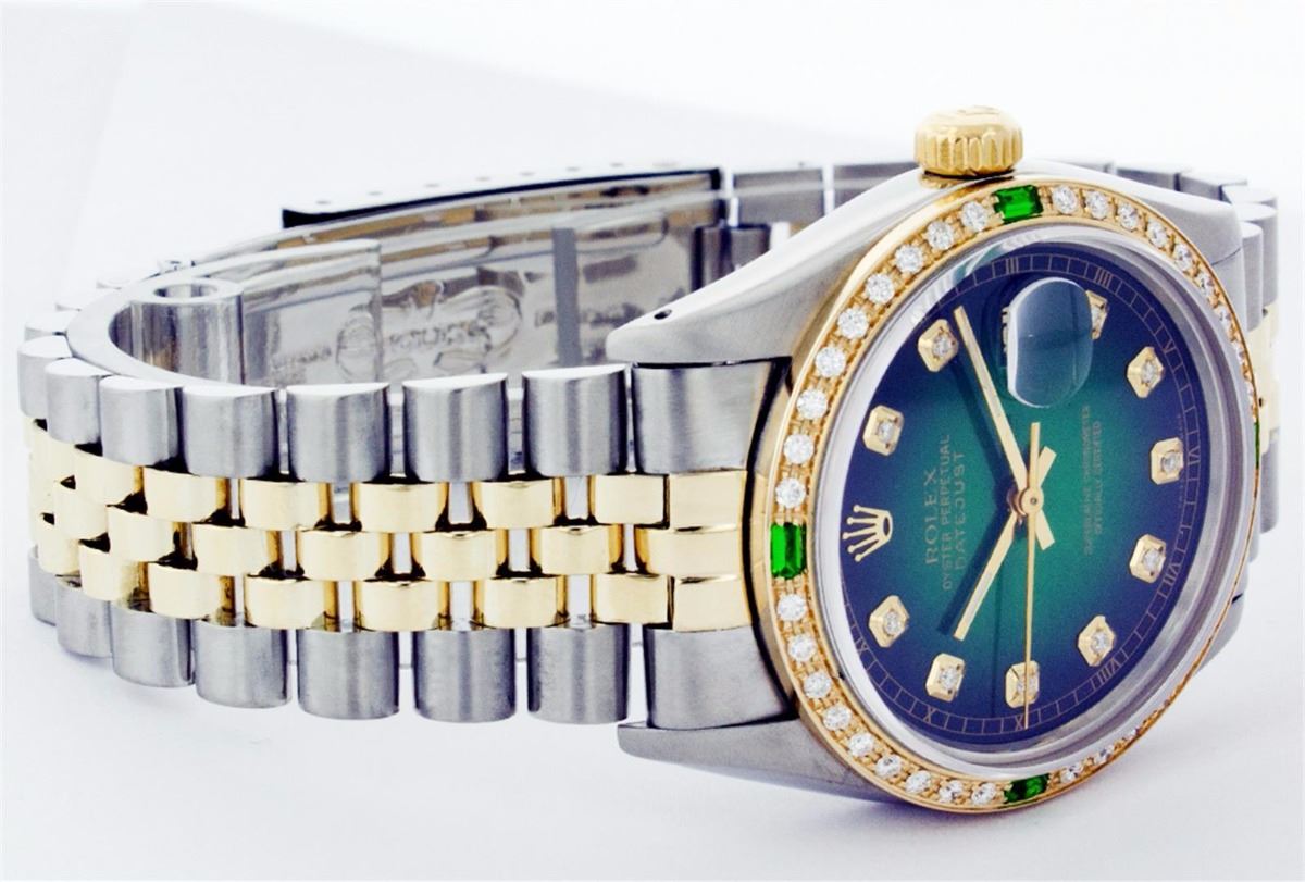 One Gents Two Tone Rolex Datejust Polished, Serviced & Electronically Tested, 14K Yellow Gold & Stainless Steel Case:36mm, 14K Yellow Gold Crown, Custom Bezel: 18K Yellow Gold Emerald Beadset Diamond Bezel, Diamond Count: 36 Diamonds + 4 Emeralds Total Weight 1.00 Carat, Clarity: Si-VS, Color: G to H. Custom Crystal: Synthetic Sapphire Cyclops Lens. Movement: Automatic Winding Movement Caliber 3035. Custom Dial: Green Vignette With Diamond Hour Markers. Diamond Count: 10 Diamonds Clarity: SI-VS, Color: Color G to H Date Window: 3 O'Clock Position Date Display, Quickset, Model: 16013 Condition: G-6 Extra Fine. Bracelet: Two Tone 14K Yellow Gold & Stainless Steel Jubilee. Bright Polish. 6.5 Inch Length, Adjustable. Standard Clasp, With Rolex Logo.