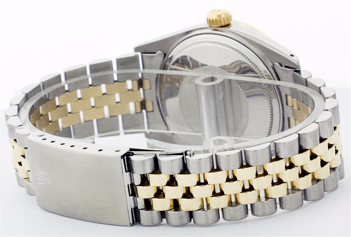 One Mens Two Tone Rolex Datejust Polished, Serviced & Electronically Tested, 14K Yellow Gold & Stainless Steel Case:36mm, 14K Yellow Gold Crown, Custom Bezel: 18K Yellow Gold Emerald Beadset Diamond Bezel, Diamond Count: 36 Diamonds + 4 Emeralds Total Weight 1.00 Carat, Clarity: Si-VS, Color: G to H. Custom Crystal: Synthetic Sapphire Cyclops Lens. Movement: Automatic Winding Movement Caliber 3035. Custom Dial: Green Vignette With Diamond Hour Markers. Diamond Count: 10 Diamonds Clarity: SI-VS, Color: Color G to H Date Window: 3 O'Clock Position Date Display, Quickset, Model: 16013 Condition: G-6 Extra Fine. Bracelet: Two Tone 14K Yellow Gold & Stainless Steel Jubilee. Bright Polish. 6.5 Inch Length, Adjustable. Standard Clasp, With Rolex Logo.