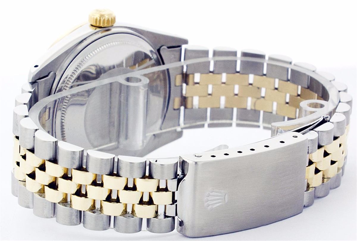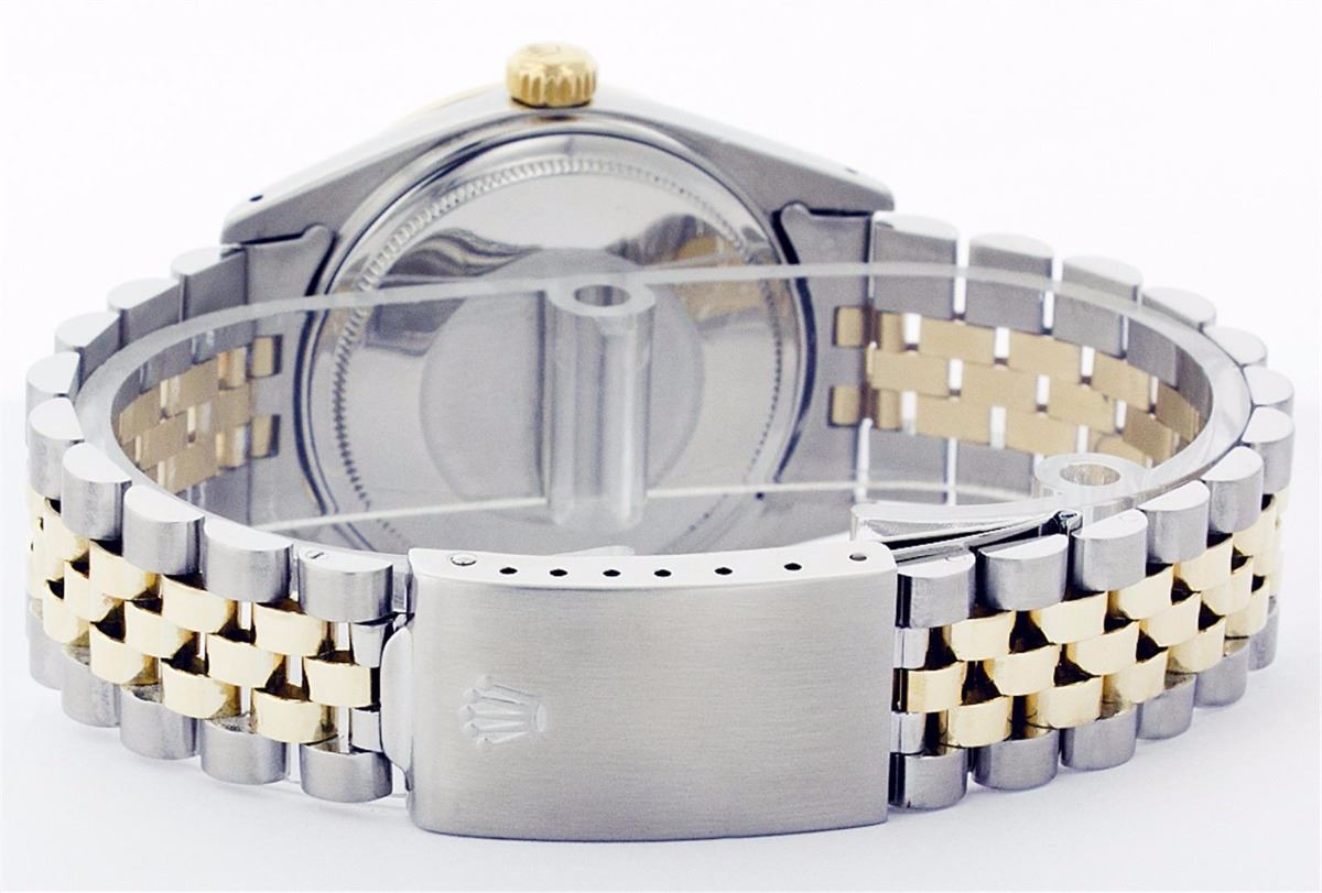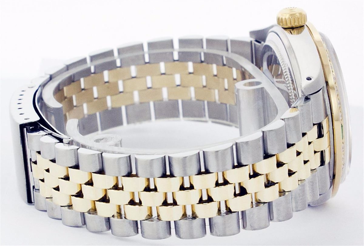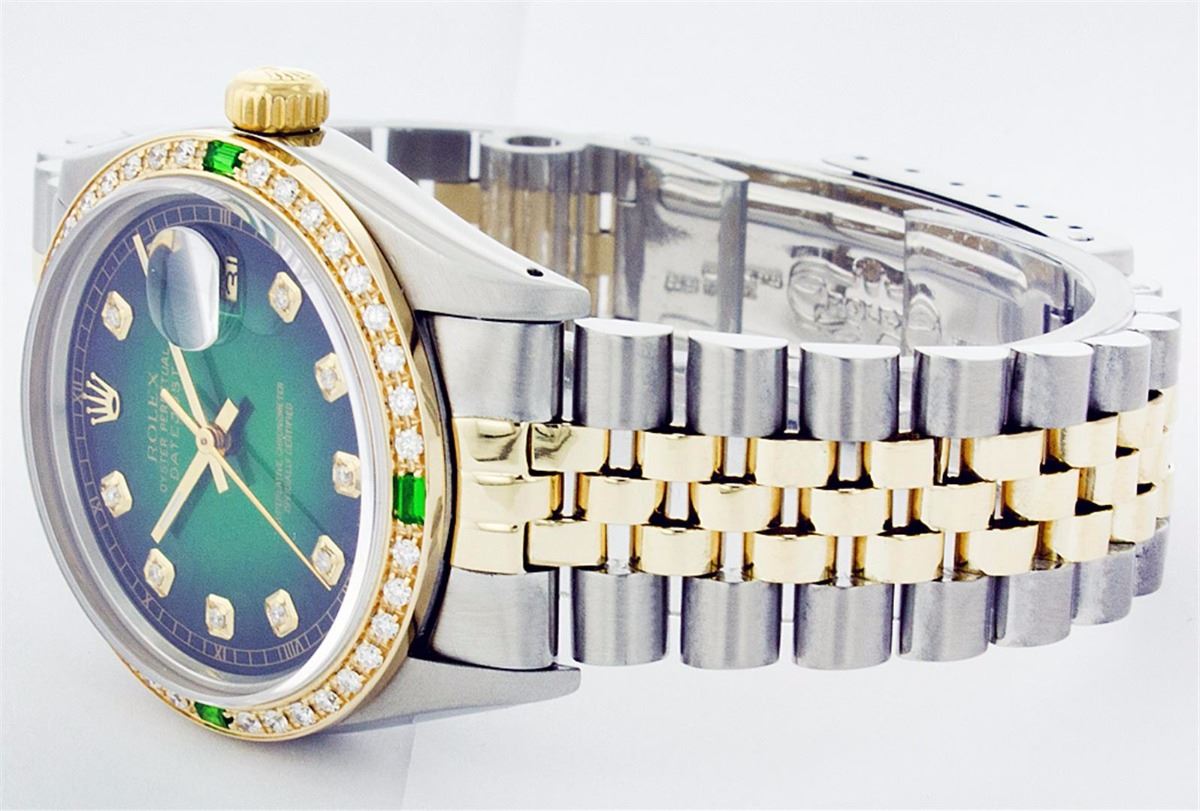 One Mens Two Tone Rolex Datejust Polished, Serviced & Electronically Tested, 14K Yellow Gold & Stainless Steel Case:36mm, 14K Yellow Gold Crown, Custom Bezel: 18K Yellow Gold Emerald Beadset Diamond Bezel, Diamond Count: 36 Diamonds + 4 Emeralds Total Weight 1.00 Carat, Clarity: Si-VS, Color: G to H. Custom Crystal: Synthetic Sapphire Cyclops Lens. Movement: Automatic Winding Movement Caliber 3035. Custom Dial: Green Vignette With Diamond Hour Markers. Diamond Count: 10 Diamonds Clarity: SI-VS, Color: Color G to H Date Window: 3 O'Clock Position Date Display, Quickset, Model: 16013 Condition: G-6 Extra Fine. Bracelet: Two Tone 14K Yellow Gold & Stainless Steel Jubilee. Bright Polish. 6.5 Inch Length, Adjustable. Standard Clasp, With Rolex Logo.