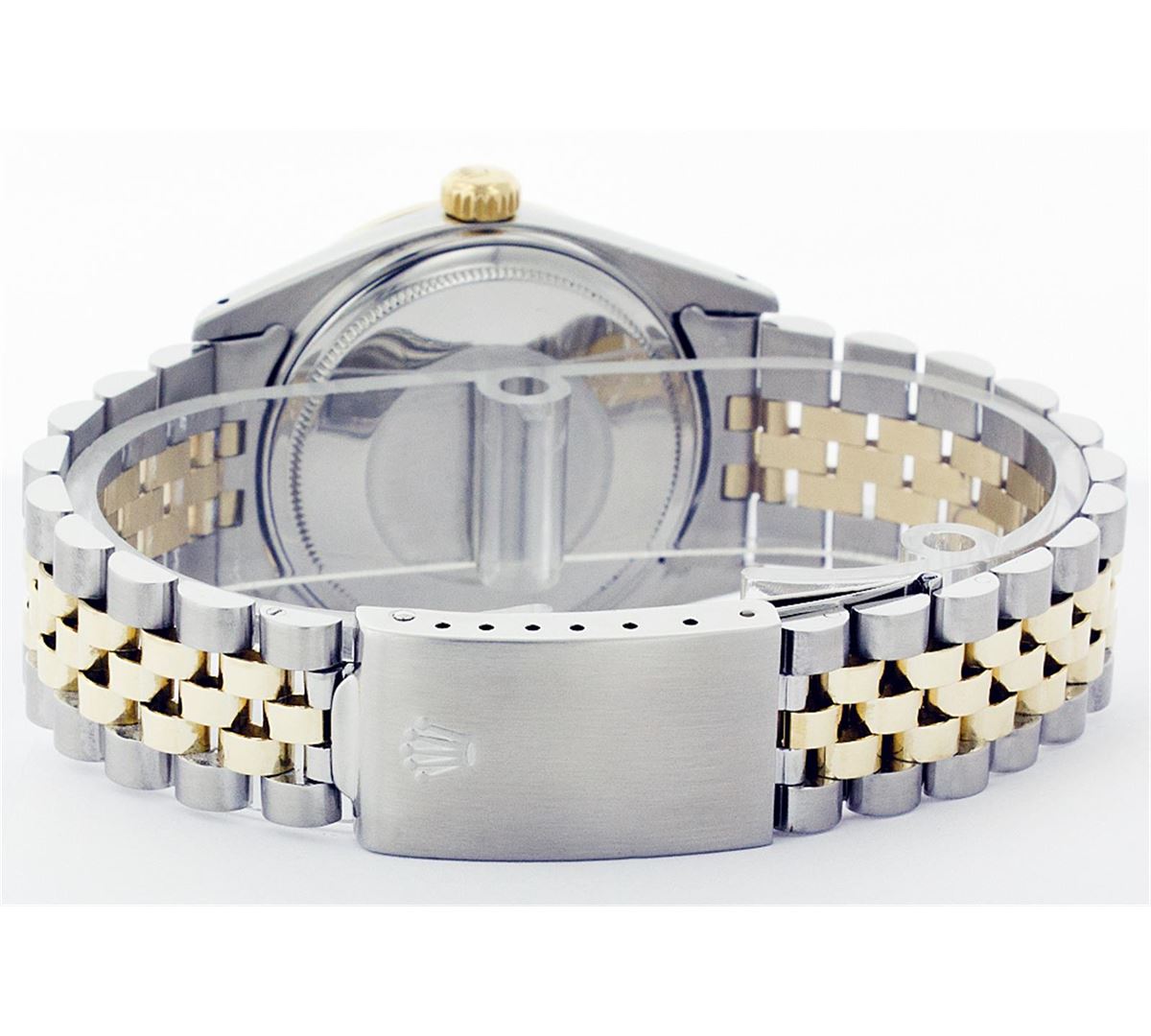 One Mens Two Tone Rolex Datejust Polished, Serviced & Electronically Tested, 14K Yellow Gold & Stainless Steel Case:36mm, 14K Yellow Gold Crown, Custom Bezel: 18K Yellow Gold Emerald Beadset Diamond Bezel, Diamond Count: 36 Diamonds + 4 Emeralds Total Weight 1.00 Carat, Clarity: Si-VS, Color: G to H. Custom Crystal: Synthetic Sapphire Cyclops Lens. Movement: Automatic Winding Movement Caliber 3035. Custom Dial: Green Vignette With Diamond Hour Markers. Diamond Count: 10 Diamonds Clarity: SI-VS, Color: Color G to H Date Window: 3 O'Clock Position Date Display, Quickset, Model: 16013 Condition: G-6 Extra Fine. Bracelet: Two Tone 14K Yellow Gold & Stainless Steel Jubilee. Bright Polish. 6.5 Inch Length, Adjustable. Standard Clasp, With Rolex Logo.