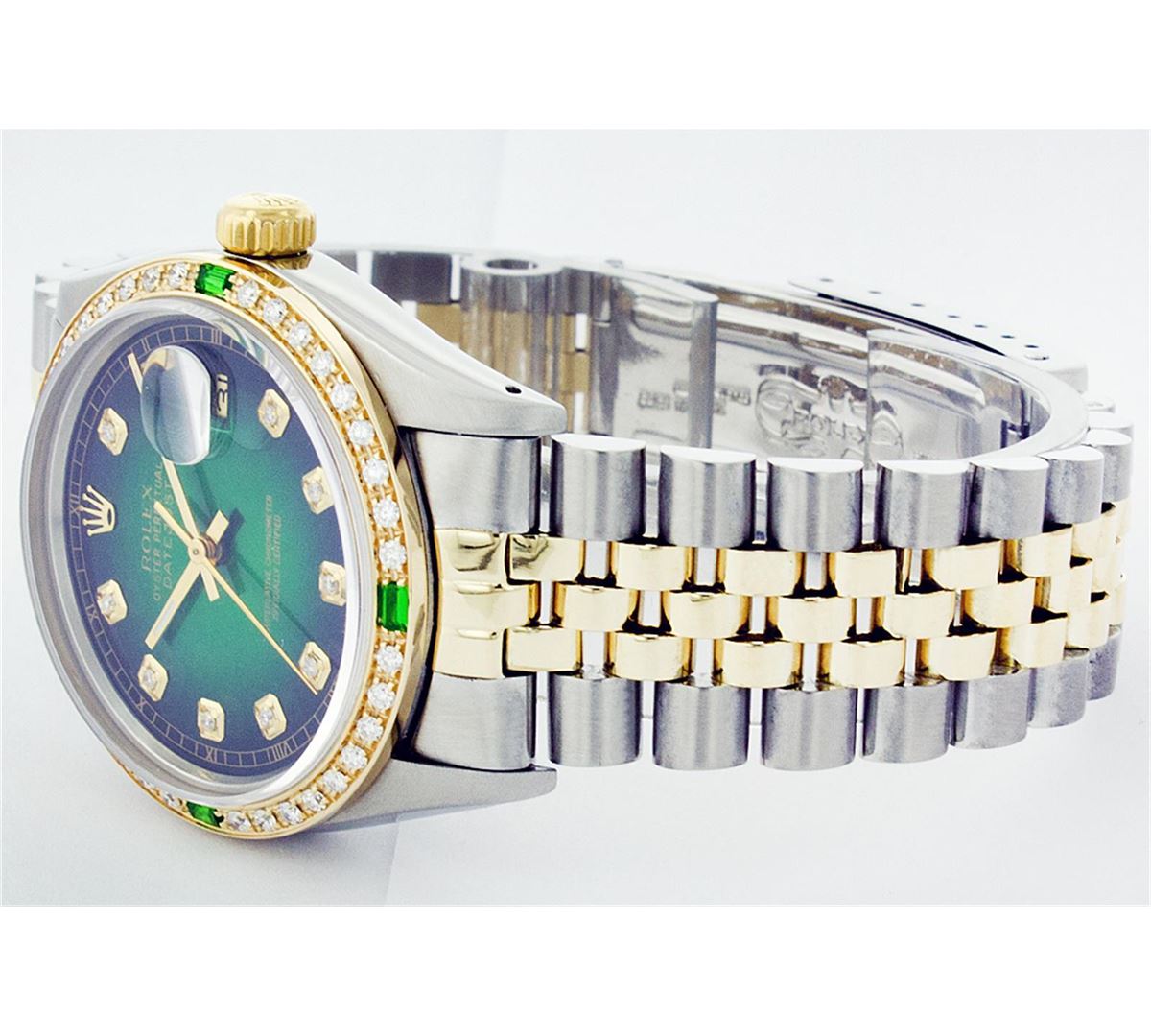 One Gents Two Tone Rolex Datejust Polished, Serviced & Electronically Tested, 14K Yellow Gold & Stainless Steel Case:36mm, 14K Yellow Gold Crown, Custom Bezel: 18K Yellow Gold Emerald Beadset Diamond Bezel, Diamond Count: 36 Diamonds + 4 Emeralds Total Weight 1.00 Carat, Clarity: Si-VS, Color: G to H. Custom Crystal: Synthetic Sapphire Cyclops Lens. Movement: Automatic Winding Movement Caliber 3035. Custom Dial: Green Vignette With Diamond Hour Markers. Diamond Count: 10 Diamonds Clarity: SI-VS, Color: Color G to H Date Window: 3 O'Clock Position Date Display, Quickset, Model: 16013 Condition: G-6 Extra Fine. Bracelet: Two Tone 14K Yellow Gold & Stainless Steel Jubilee. Bright Polish. 6.5 Inch Length, Adjustable. Standard Clasp, With Rolex Logo.