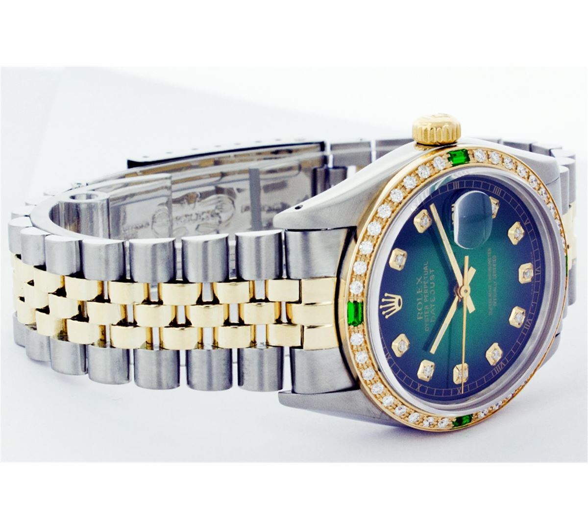 One Gents Two Tone Rolex Datejust Polished, Serviced & Electronically Tested, 14K Yellow Gold & Stainless Steel Case:36mm, 14K Yellow Gold Crown, Custom Bezel: 18K Yellow Gold Emerald Beadset Diamond Bezel, Diamond Count: 36 Diamonds + 4 Emeralds Total Weight 1.00 Carat, Clarity: Si-VS, Color: G to H. Custom Crystal: Synthetic Sapphire Cyclops Lens. Movement: Automatic Winding Movement Caliber 3035. Custom Dial: Green Vignette With Diamond Hour Markers. Diamond Count: 10 Diamonds Clarity: SI-VS, Color: Color G to H Date Window: 3 O'Clock Position Date Display, Quickset, Model: 16013 Condition: G-6 Extra Fine. Bracelet: Two Tone 14K Yellow Gold & Stainless Steel Jubilee. Bright Polish. 6.5 Inch Length, Adjustable. Standard Clasp, With Rolex Logo.