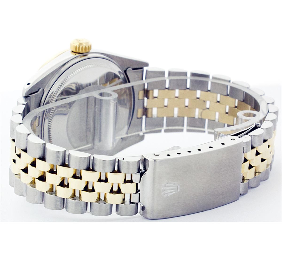 One Mens Two Tone Rolex Datejust Polished, Serviced & Electronically Tested, 14K Yellow Gold & Stainless Steel Case:36mm, 14K Yellow Gold Crown, Custom Bezel: 18K Yellow Gold Emerald Beadset Diamond Bezel, Diamond Count: 36 Diamonds + 4 Emeralds Total Weight 1.00 Carat, Clarity: Si-VS, Color: G to H. Custom Crystal: Synthetic Sapphire Cyclops Lens. Movement: Automatic Winding Movement Caliber 3035. Custom Dial: Green Vignette With Diamond Hour Markers. Diamond Count: 10 Diamonds Clarity: SI-VS, Color: Color G to H Date Window: 3 O'Clock Position Date Display, Quickset, Model: 16013 Condition: G-6 Extra Fine. Bracelet: Two Tone 14K Yellow Gold & Stainless Steel Jubilee. Bright Polish. 6.5 Inch Length, Adjustable. Standard Clasp, With Rolex Logo.