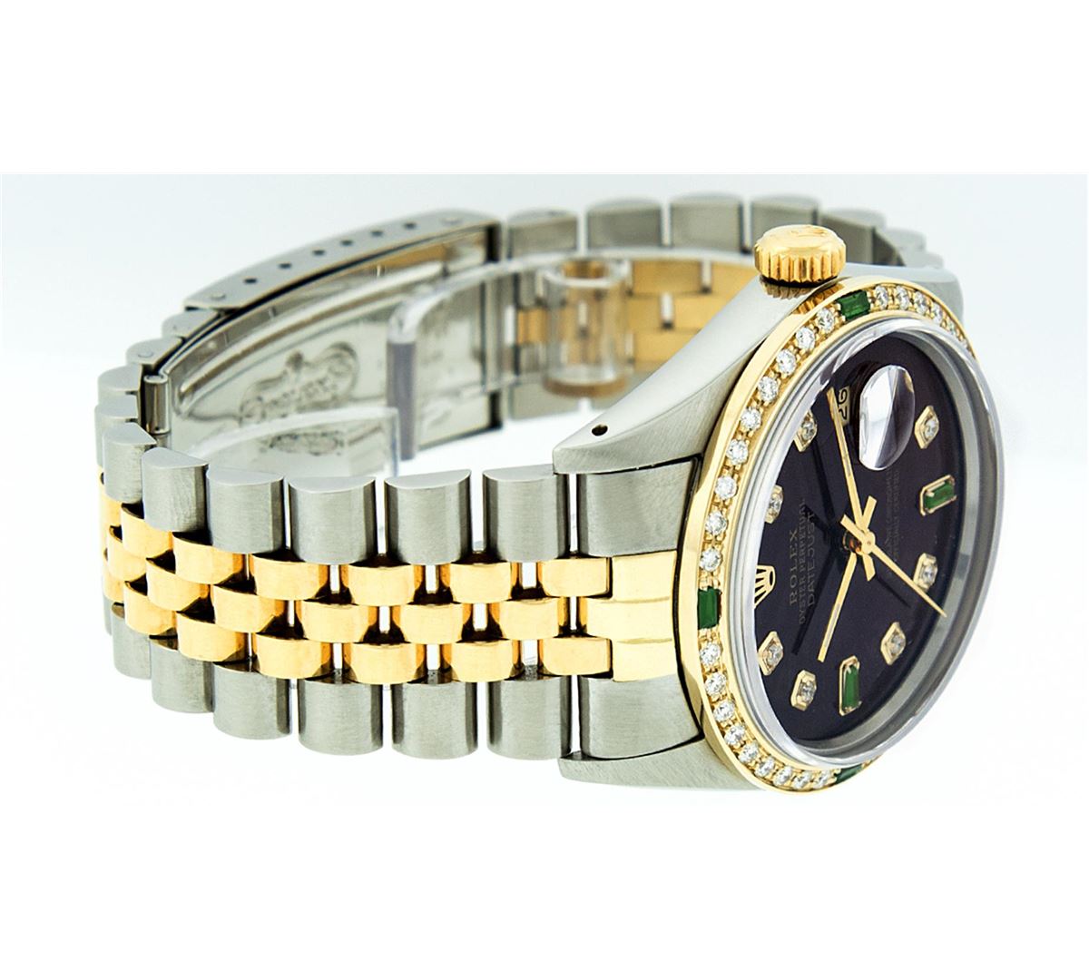 One Mens Rolex Datejust Polished Bright with Satin Finish, Serviced & Electronically Tested, Stainless Steel Case:36mm, Stainless Steel Crown, Custom Bezel: 18K Yellow Gold Emerald Beadset Diamond Bezel, Diamond + Gem Count:36 Diamonds + 4 Emeralds, Total Weight 1.00 Carat, Clarity: SI-VS, Color: G to H. Custom Crystal: Synthetic Sapphire Cyclops Lens. Movement: Automatic Winding Movement Caliber 3035. Custom Dial: Brown Diamonds With Emeralds, Diamond Count: 8 Diamond + 2 Emerald Baguettes in Dial, Dial Color: G To H In Color, Clarity: SI-VS. Date Window: 3 O'Clock Position Date Display, Quickset, Model: 16013 Condition: G-6 Extra Fine. Bracelet: 14K Yellow Gold And Stainless Steel Jubilee. Bright Polish & Satin Finish. 7.0 Inch Length, Adjustable. Standard Clasp, With Rolex Logo. Comes with 6 month warranty.
