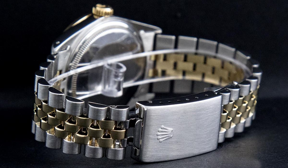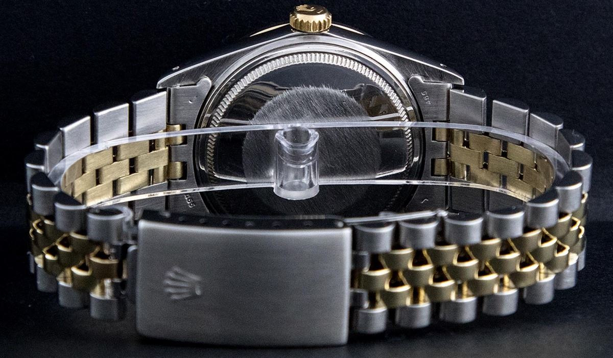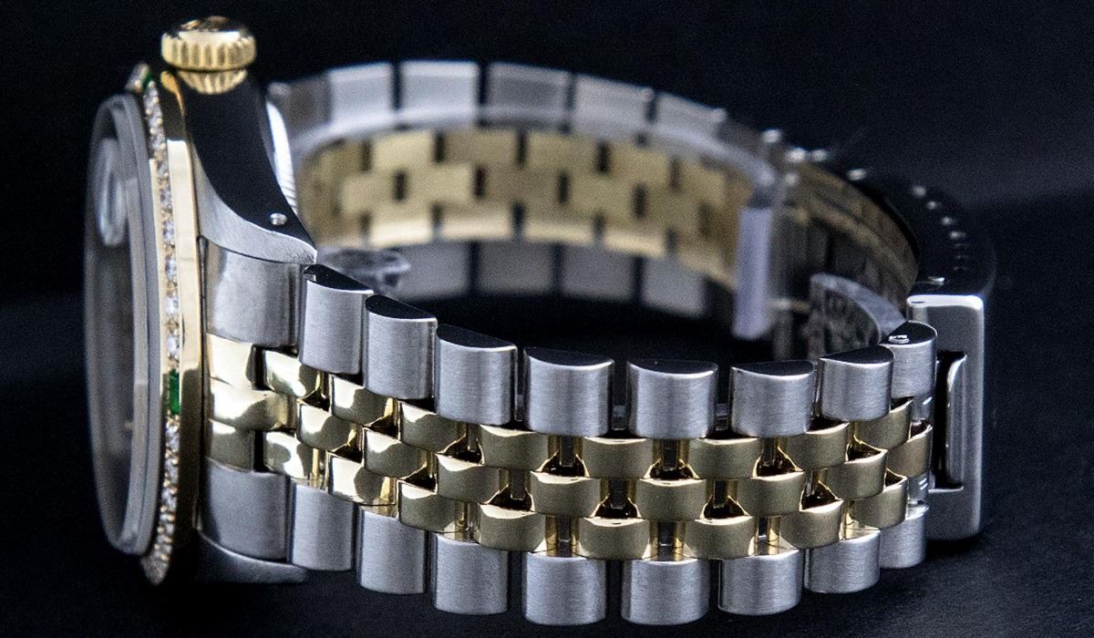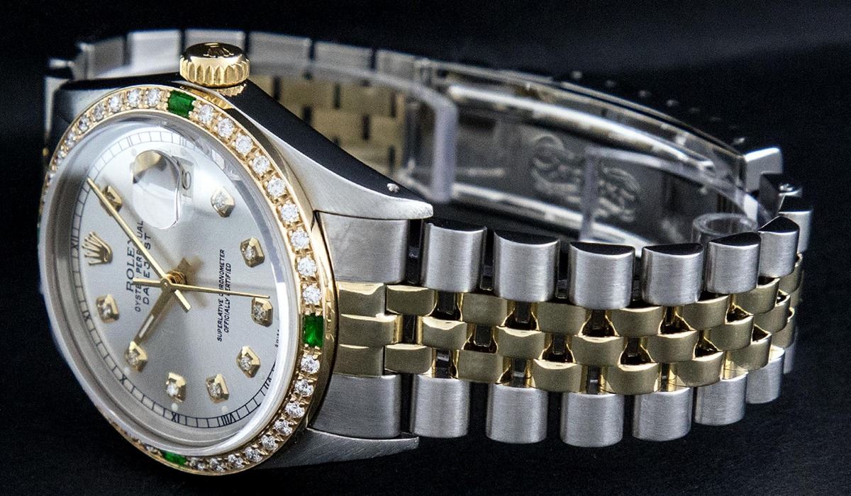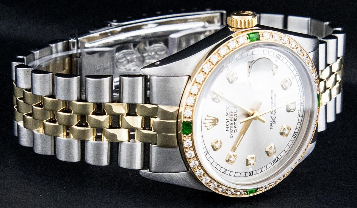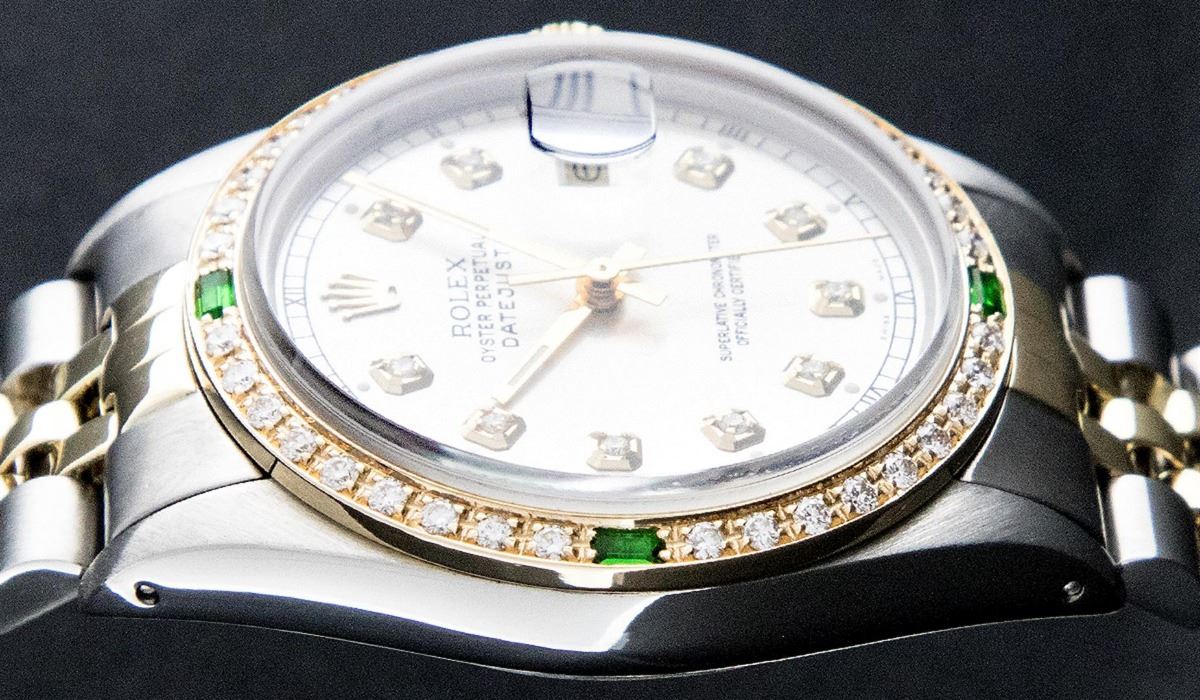 One Mens Two Tone Rolex Datejust Polished, Fully Serviced & Electronically Tested, 14K Yellow Gold & Stainless Steel Case:36mm, 14K Yellow Gold Crown, Custom Bezel: 18K Yellow Gold Emerald Beadset Diamond Bezel, Diamond Count: 36 Diamonds + 4 Emeralds, Total Weight 1.0 Carat, Clarity: Si-VS, Color: G to H. Custom Crystal: Synthetic Sapphire Cyclops Lens. Movement: Automatic Winding Movement Caliber 3035. Custom Dial: Silver Diamond Dial With Square Track and Luminescent Dots. Diamond Count: 10 Diamonds In Dial, Color: G to H, Clarity: SI-VS. Date Window: 3 O'Clock Position Date Display, Quickset, Model: Datejust Condition: G-6 Extra Fine. Bracelet: Two Tone 14K Yellow Gold & Stainless Steel Jubilee. Bright Polish. 7.0 Inch Length, Adjustable. Standard Clasp, With Rolex Logo. Comes with 6 month warranty.