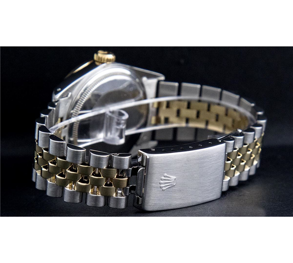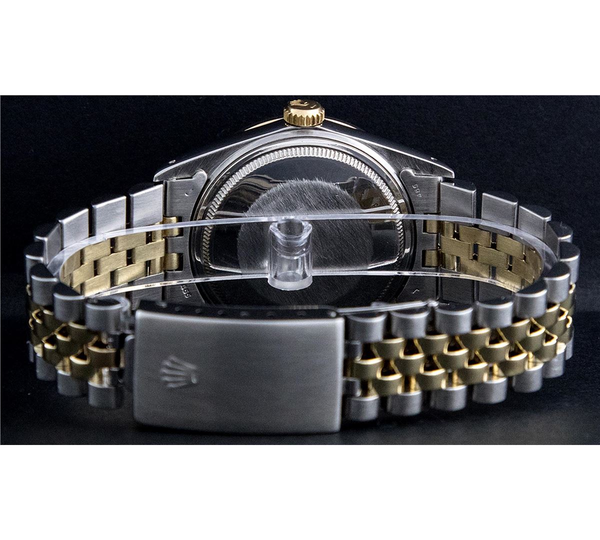 One Mens Two Tone Rolex Datejust Polished, Fully Serviced & Electronically Tested, 14K Yellow Gold & Stainless Steel Case:36mm, 14K Yellow Gold Crown, Custom Bezel: 18K Yellow Gold Emerald Beadset Diamond Bezel, Diamond Count: 36 Diamonds + 4 Emeralds, Total Weight 1.0 Carat, Clarity: Si-VS, Color: G to H. Custom Crystal: Synthetic Sapphire Cyclops Lens. Movement: Automatic Winding Movement Caliber 3035. Custom Dial: Silver Diamond Dial With Square Track and Luminescent Dots. Diamond Count: 10 Diamonds In Dial, Color: G to H, Clarity: SI-VS. Date Window: 3 O'Clock Position Date Display, Quickset, Model: Datejust Condition: G-6 Extra Fine. Bracelet: Two Tone 14K Yellow Gold & Stainless Steel Jubilee. Bright Polish. 7.0 Inch Length, Adjustable. Standard Clasp, With Rolex Logo. Comes with 6 month warranty.