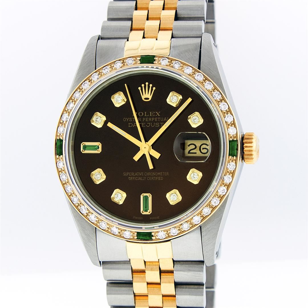 One Mens Rolex Datejust Polished Bright with Satin Finish, Serviced & Electronically Tested, Stainless Steel Case:36mm, Stainless Steel Crown, Custom Bezel: 18K Yellow Gold Emerald Beadset Diamond Bezel, Diamond + Gem Count:36 Diamonds + 4 Emeralds, Total Weight 1.00 Carat, Clarity: SI-VS, Color: G to H. Custom Crystal: Synthetic Sapphire Cyclops Lens. Movement: Automatic Winding Movement Caliber 3035. Custom Dial: Brown Diamonds With Emeralds, Diamond Count: 8 Diamond + 2 Emerald Baguettes in Dial, Dial Color: G To H In Color, Clarity: SI-VS. Date Window: 3 O'Clock Position Date Display, Quickset, Model: 16013 Condition: G-6 Extra Fine. Bracelet: 14K Yellow Gold And Stainless Steel Jubilee. Bright Polish & Satin Finish. 7.0 Inch Length, Adjustable. Standard Clasp, With Rolex Logo. Comes with 6 month warranty.