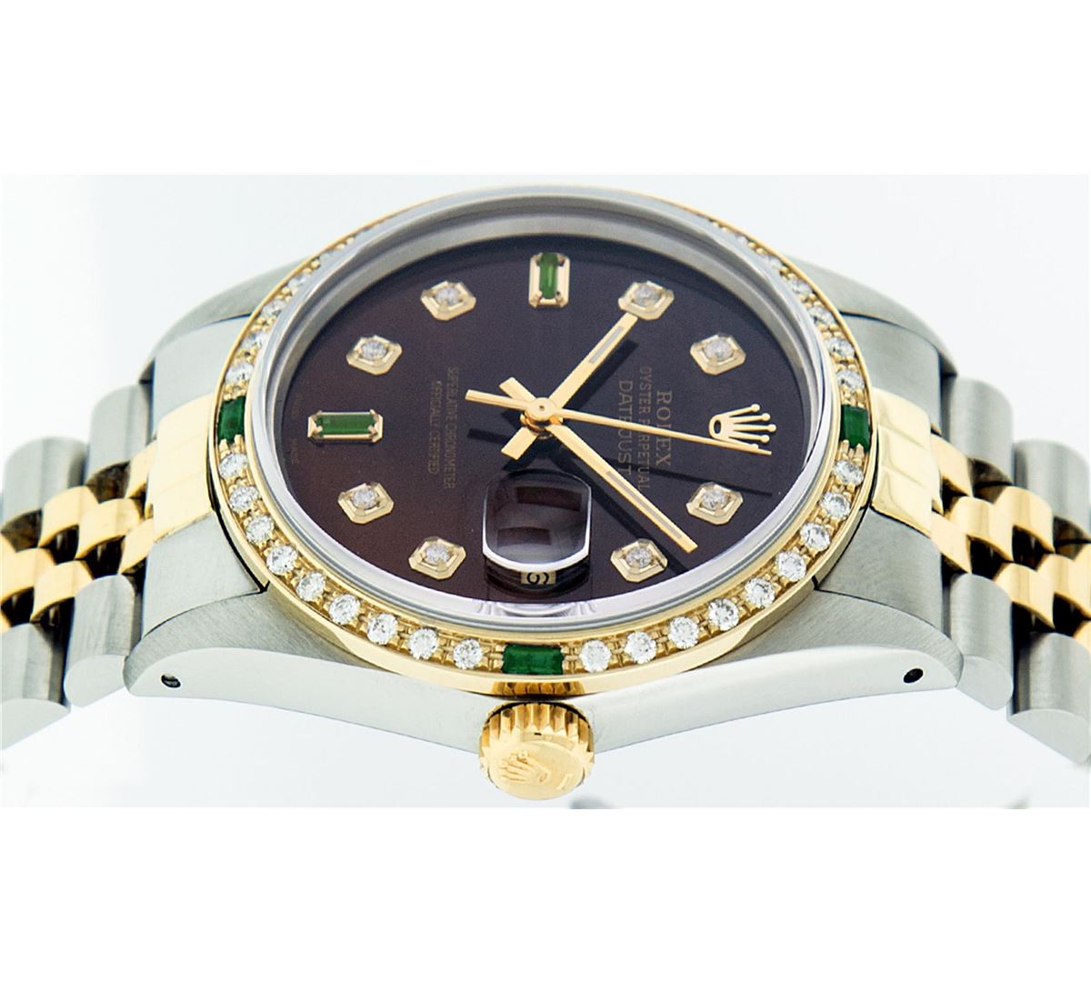 One Mens Rolex Datejust Polished Bright with Satin Finish, Serviced & Electronically Tested, Stainless Steel Case:36mm, Stainless Steel Crown, Custom Bezel: 18K Yellow Gold Emerald Beadset Diamond Bezel, Diamond + Gem Count:36 Diamonds + 4 Emeralds, Total Weight 1.00 Carat, Clarity: SI-VS, Color: G to H. Custom Crystal: Synthetic Sapphire Cyclops Lens. Movement: Automatic Winding Movement Caliber 3035. Custom Dial: Brown Diamonds With Emeralds, Diamond Count: 8 Diamond + 2 Emerald Baguettes in Dial, Dial Color: G To H In Color, Clarity: SI-VS. Date Window: 3 O'Clock Position Date Display, Quickset, Model: 16013 Condition: G-6 Extra Fine. Bracelet: 14K Yellow Gold And Stainless Steel Jubilee. Bright Polish & Satin Finish. 7.0 Inch Length, Adjustable. Standard Clasp, With Rolex Logo. Comes with 6 month warranty.