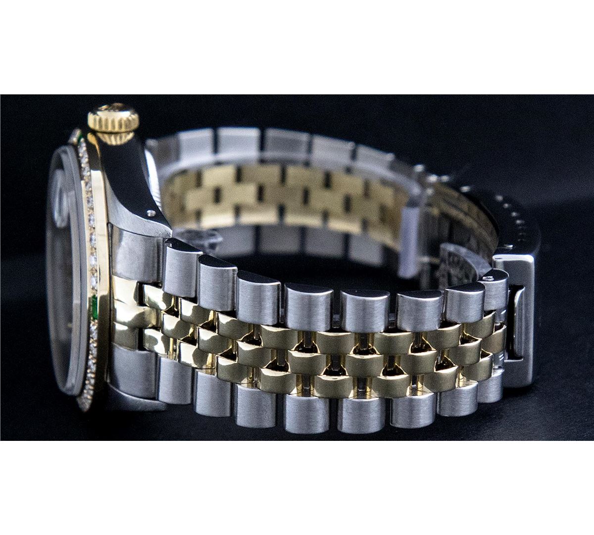One Mens Two Tone Rolex Datejust Polished, Fully Serviced & Electronically Tested, 14K Yellow Gold & Stainless Steel Case:36mm, 14K Yellow Gold Crown, Custom Bezel: 18K Yellow Gold Emerald Beadset Diamond Bezel, Diamond Count: 36 Diamonds + 4 Emeralds, Total Weight 1.0 Carat, Clarity: Si-VS, Color: G to H. Custom Crystal: Synthetic Sapphire Cyclops Lens. Movement: Automatic Winding Movement Caliber 3035. Custom Dial: Silver Diamond Dial With Square Track and Luminescent Dots. Diamond Count: 10 Diamonds In Dial, Color: G to H, Clarity: SI-VS. Date Window: 3 O'Clock Position Date Display, Quickset, Model: Datejust Condition: G-6 Extra Fine. Bracelet: Two Tone 14K Yellow Gold & Stainless Steel Jubilee. Bright Polish. 7.0 Inch Length, Adjustable. Standard Clasp, With Rolex Logo. Comes with 6 month warranty.