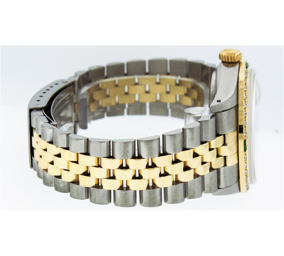 One Mens Two Tone Rolex Datejust Polished, Serviced & Electronically Tested, 14K Yellow Gold & Stainless Steel Case:36mm, 14K Yellow Gold Crown, Custom Bezel: 18K Yellow Gold Emerald Beadset Diamond Bezel, Diamond Count: 36 Diamonds + 4 Emeralds Total Weight 1.00 Carat, Clarity: Si-VS, Color: G to H. Custom Crystal: Synthetic Sapphire Cyclops Lens. Movement: Automatic Winding Movement Caliber 3035. Custom Dial: Mother Of Pearl String Diamond Dial, Diamond Count: 48 Diamonds + 10 Emeralds, Color: G to H, Clarity: SI-VS Date Window: 3 O'Clock Position Date Display, Quickset, Model: 16013 Condition: G-6 Extra Fine. Bracelet: Two Tone 14K Yellow Gold & Stainless Steel Jubilee. Bright Polish. 7.0 Inch Length, Adjustable. Standard Clasp, With Rolex Logo.