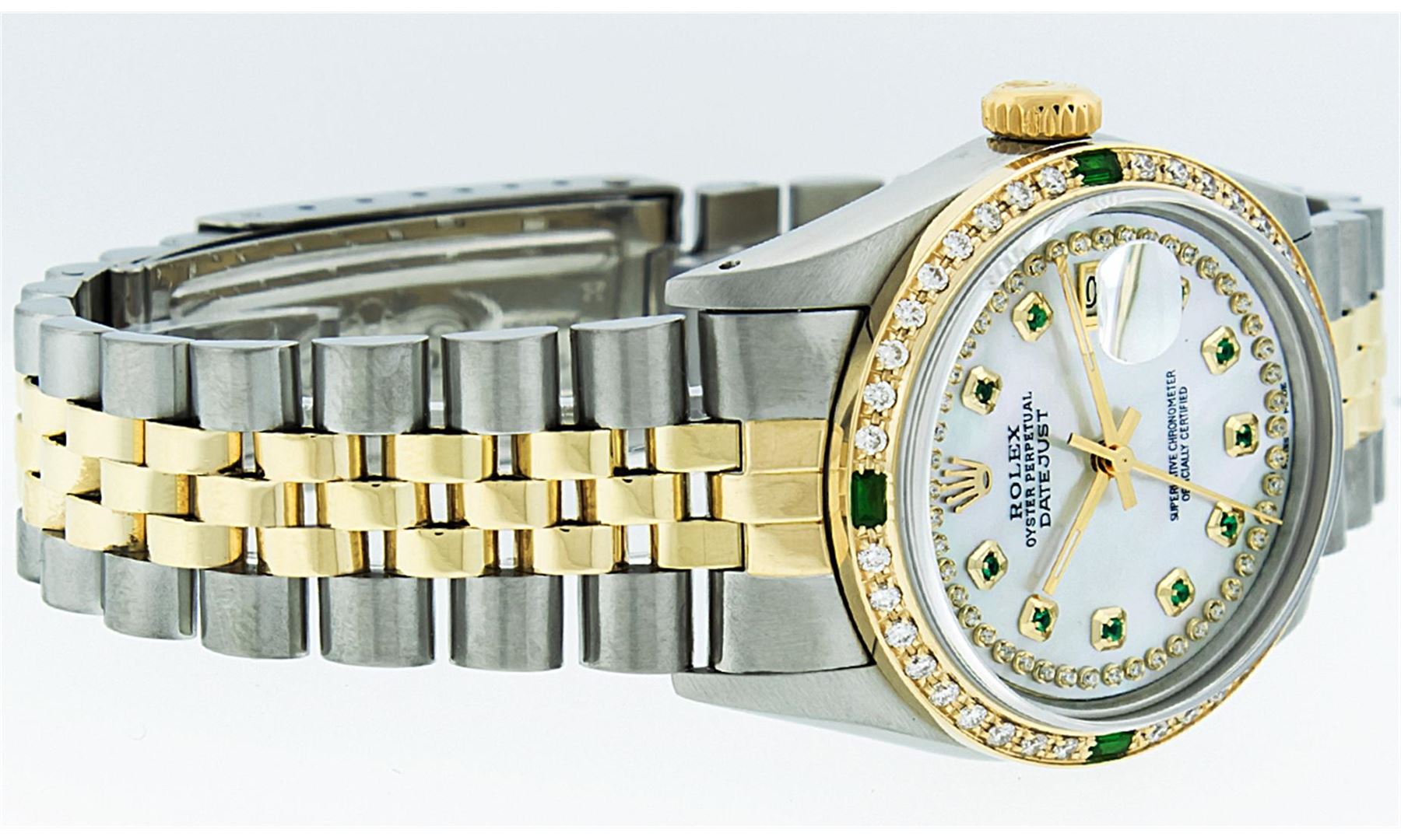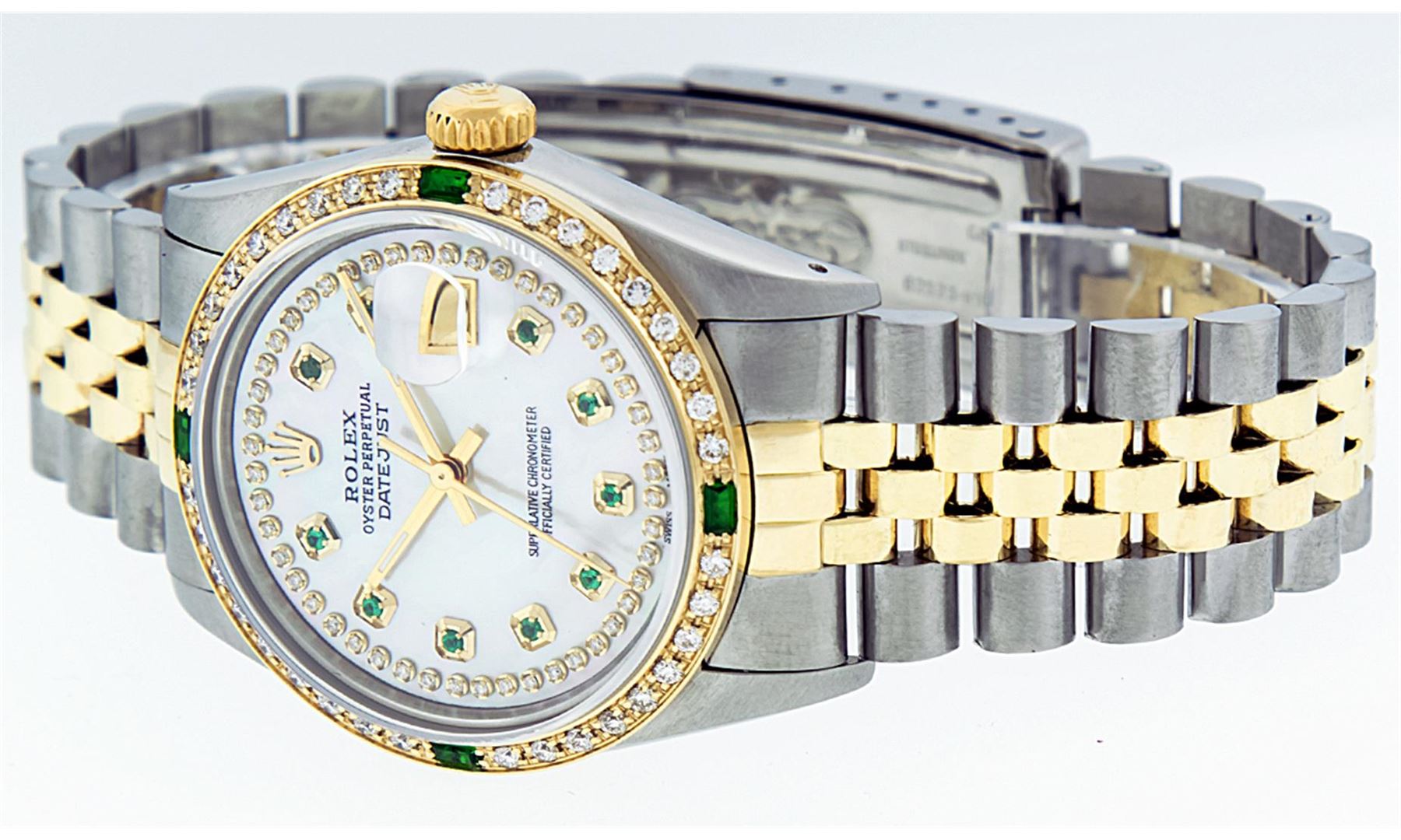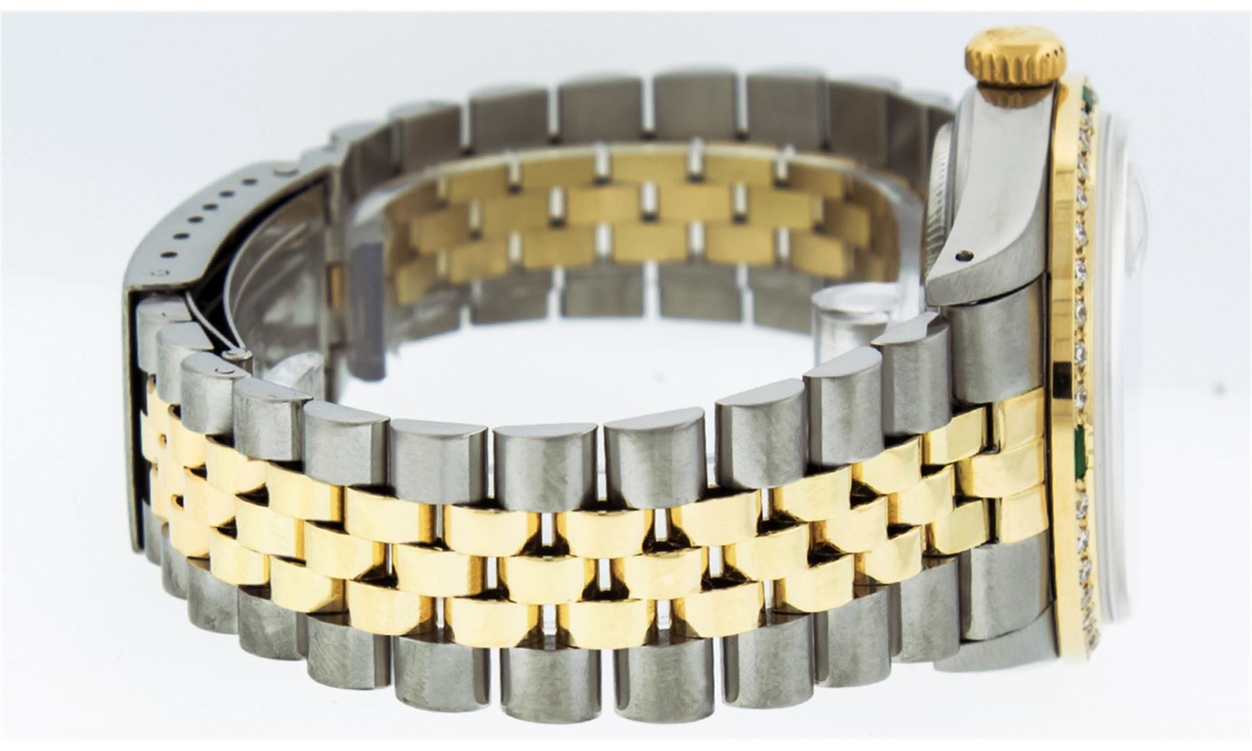 One Mens Two Tone Rolex Datejust Polished, Serviced & Electronically Tested, 14K Yellow Gold & Stainless Steel Case:36mm, 14K Yellow Gold Crown, Custom Bezel: 18K Yellow Gold Emerald Beadset Diamond Bezel, Diamond Count: 36 Diamonds + 4 Emeralds Total Weight 1.00 Carat, Clarity: Si-VS, Color: G to H. Custom Crystal: Synthetic Sapphire Cyclops Lens. Movement: Automatic Winding Movement Caliber 3035. Custom Dial: Mother Of Pearl String Diamond Dial, Diamond Count: 48 Diamonds + 10 Emeralds, Color: G to H, Clarity: SI-VS Date Window: 3 O'Clock Position Date Display, Quickset, Model: 16013 Condition: G-6 Extra Fine. Bracelet: Two Tone 14K Yellow Gold & Stainless Steel Jubilee. Bright Polish. 7.0 Inch Length, Adjustable. Standard Clasp, With Rolex Logo.